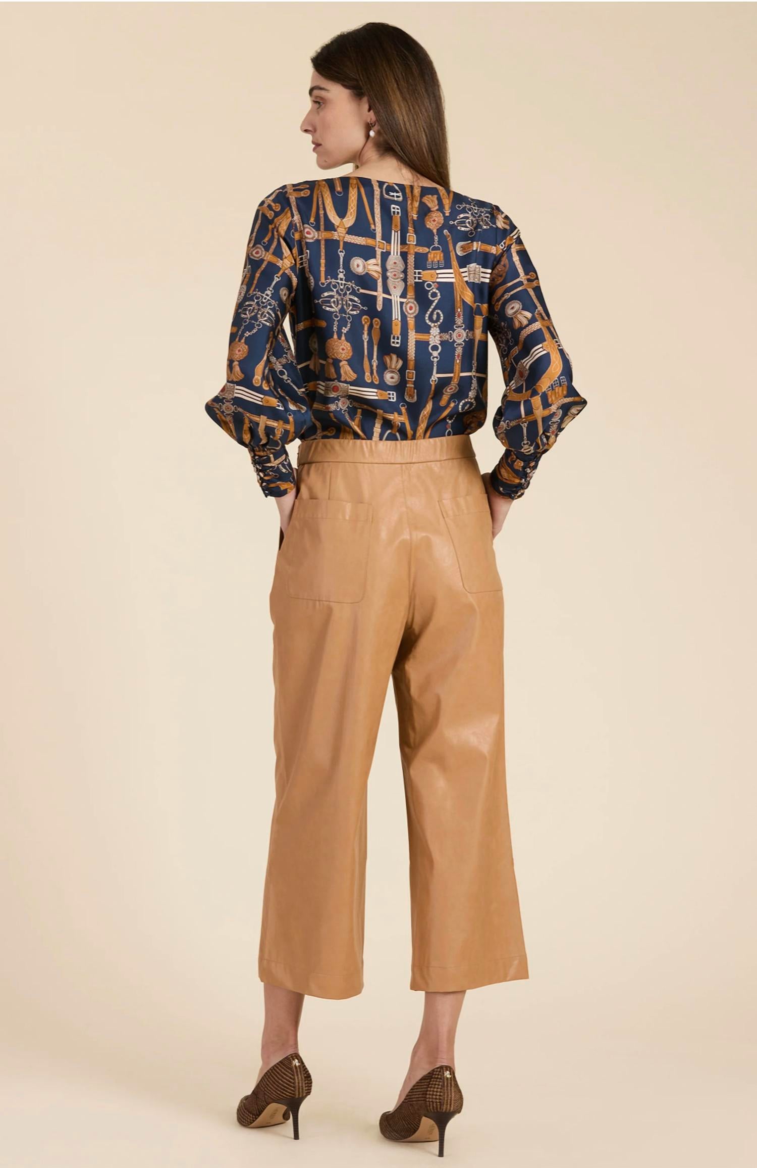 Upgrade your wardrobe with these cropped pants, designed to merge sophistication and wearability. The tailored fit ensures ultimate comfort during long days or nights out. Chic caramel with a high-rise, relaxed fit, and wide leg style. Crafted with a shell of 100% Viscose, coated in 100% Polyurethane, and lined with 100% Polyester. Stylish pants feature slash pockets, a welt back pocket, and a convenient side zip closure. With an inseam of 24 inches. Care is simple with machine wash instructions.
