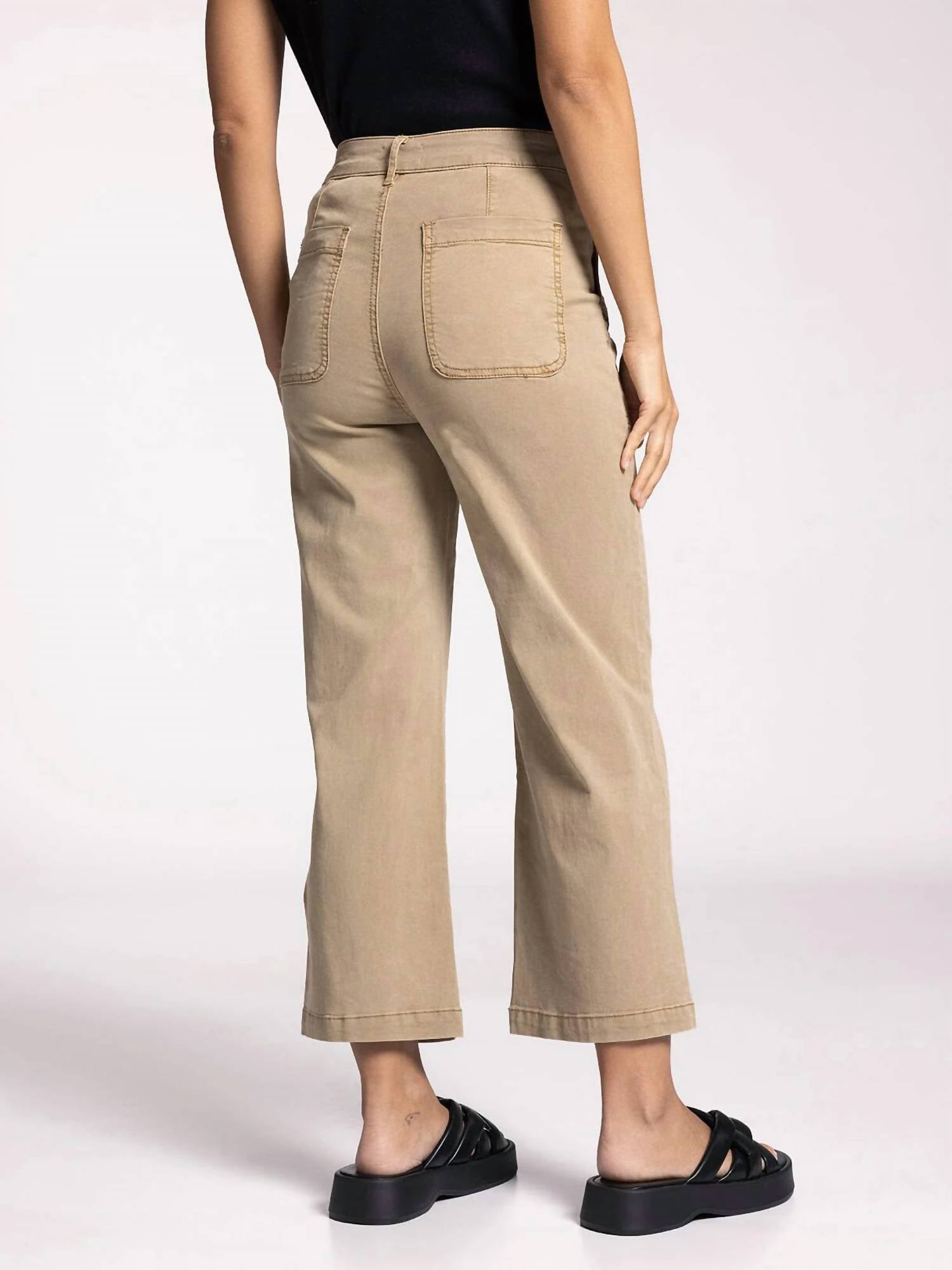 Embrace adventure with the Porter Pants by Thread & Supply, a stylishly functional piece in khaki. Designed with multiple pockets, these high-rise wide-leg trousers feature a comfortable cropped length and a relaxed fit. Crafted from 76% Lyocell, 20% Cotton, and 4% Spandex, they ensure durability and flexibility. Closure: Zip closure. Measurements for a size small are a 13" waist, 11" rise, and 25" inseam.