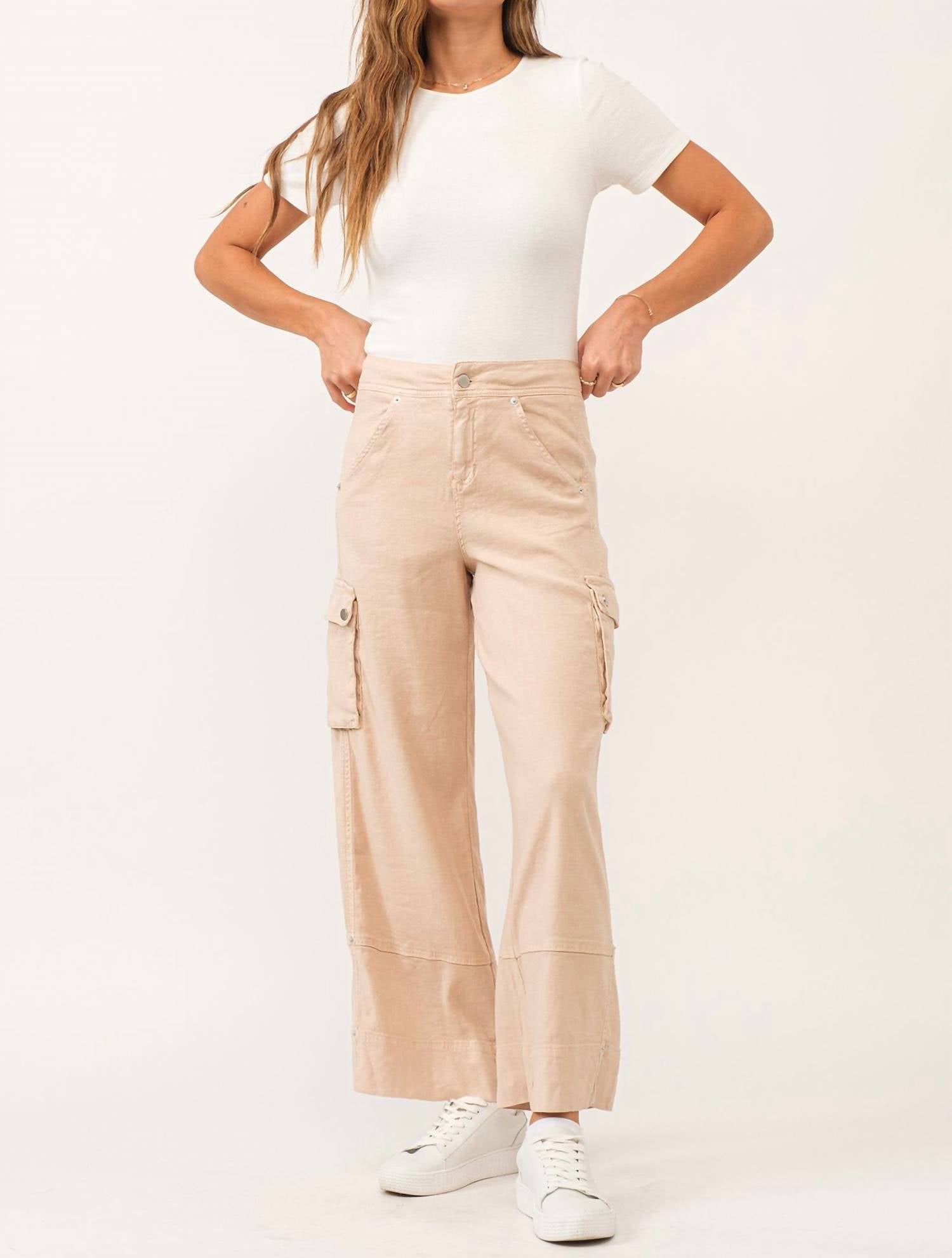 This Wide Leg Cargo Soft Seashell Pants feature a high-rise waist with a flattering 11.5-inch rise and a relaxed fit for comfort. Crafted from a luxurious 60% Linen 38% Rayon 2% Spandex blend, they include functional pockets and a classic button closure, making them a versatile and chic addition to your casual wardrobe.