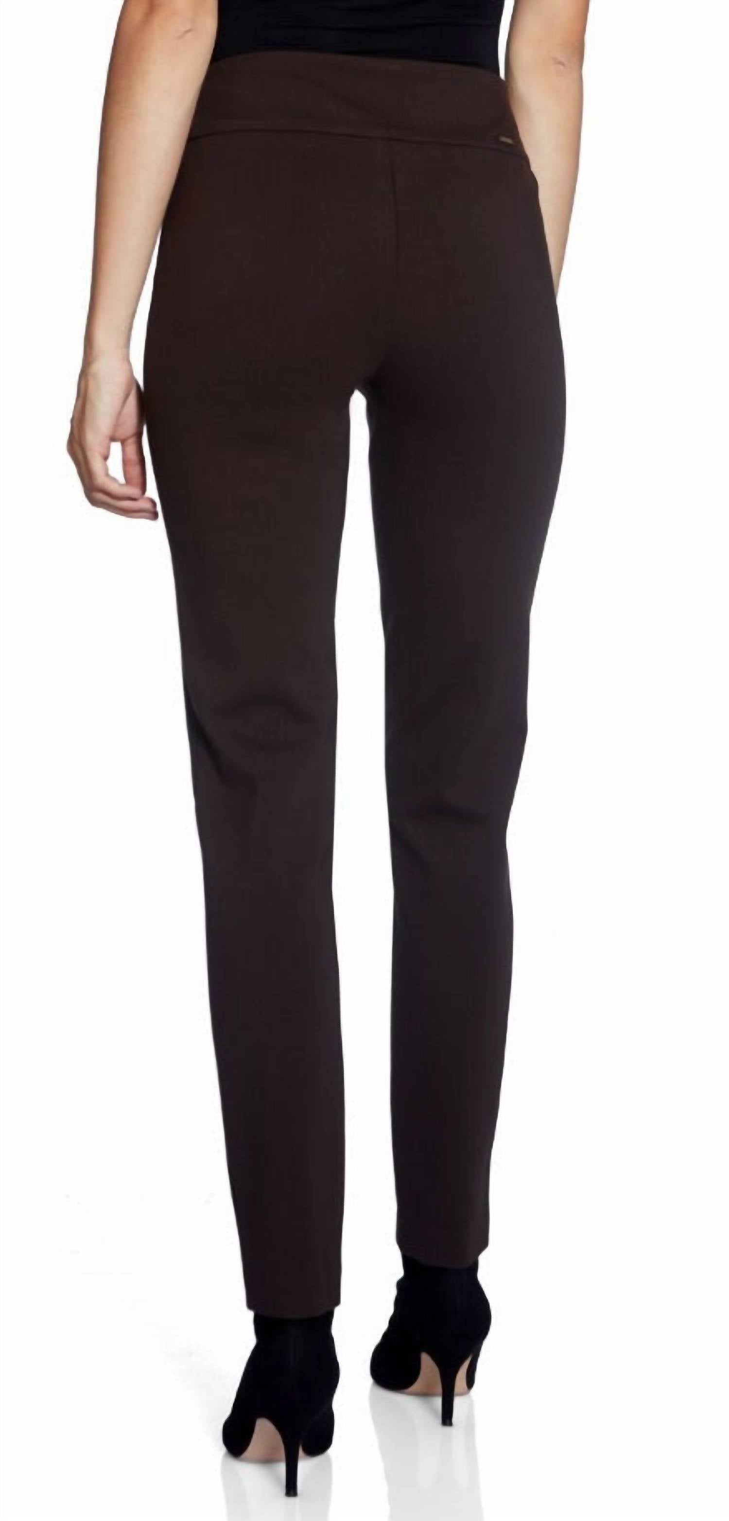 A skinny pant that is both flatering and comfortable. We love this style because it works great with boots, or without! Enhance your wardrobe with the Up! Ponte Full Length Slim Pants in a sophisticated Espresso shade. Designed for ultimate comfort and style, these full-length pants feature a pull-on elastic waistband with built-in tummy control, ensuring a slim fit with a tailored silhouette. Crafted from heavyweight Ponte di Roma fabric, composed of 67% Rayon, 29% Nylon, and 4% Spandex. The pants boast an inseam of 31" and a front rise of 9 3/4”, offering a sleek and refined look. Made in Canada, care for these pants by turning them inside out, machine washing cold on a gentle cycle, and laying them flat to dry.