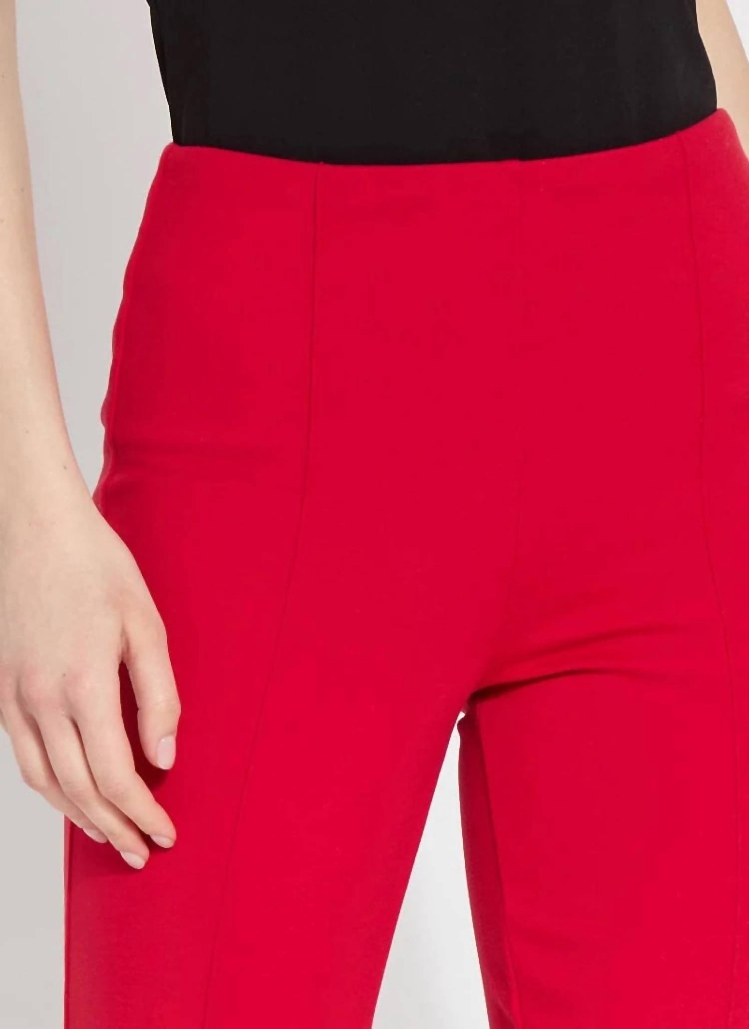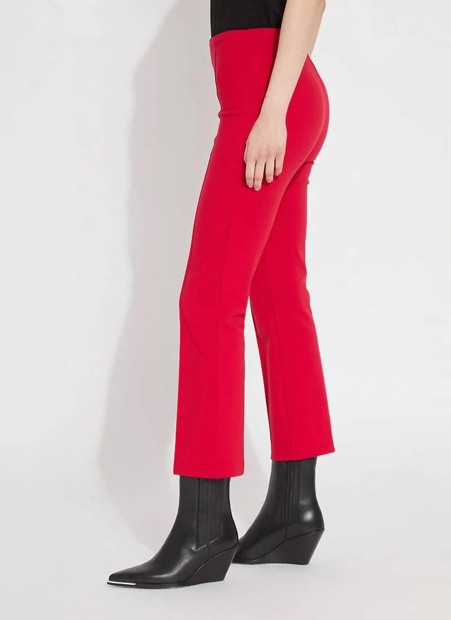 Stay on trend with these stylish boot cut pants that are fit to perfection. The perfect combination of comfort and fashion, you'll be grabbing for these all season long! Introducing the Ankle Elysse Pant by Lysse, a sophisticated fit-and-flare style crafted for petite frames in a striking deep red. With its 27.5-inch inseam, these pants are made from a Ponte fabric blend of 67% Viscose, 28% Nylon, and 5% Spandex, ensuring a comfortable 4-way stretch. Highlighted by a concealed patented 360 smoothing waistband, the pull-on design features chic front pintucks and a wide flared leg for an elegant silhouette. Easy to care for, simply machine wash cold for lasting wear.