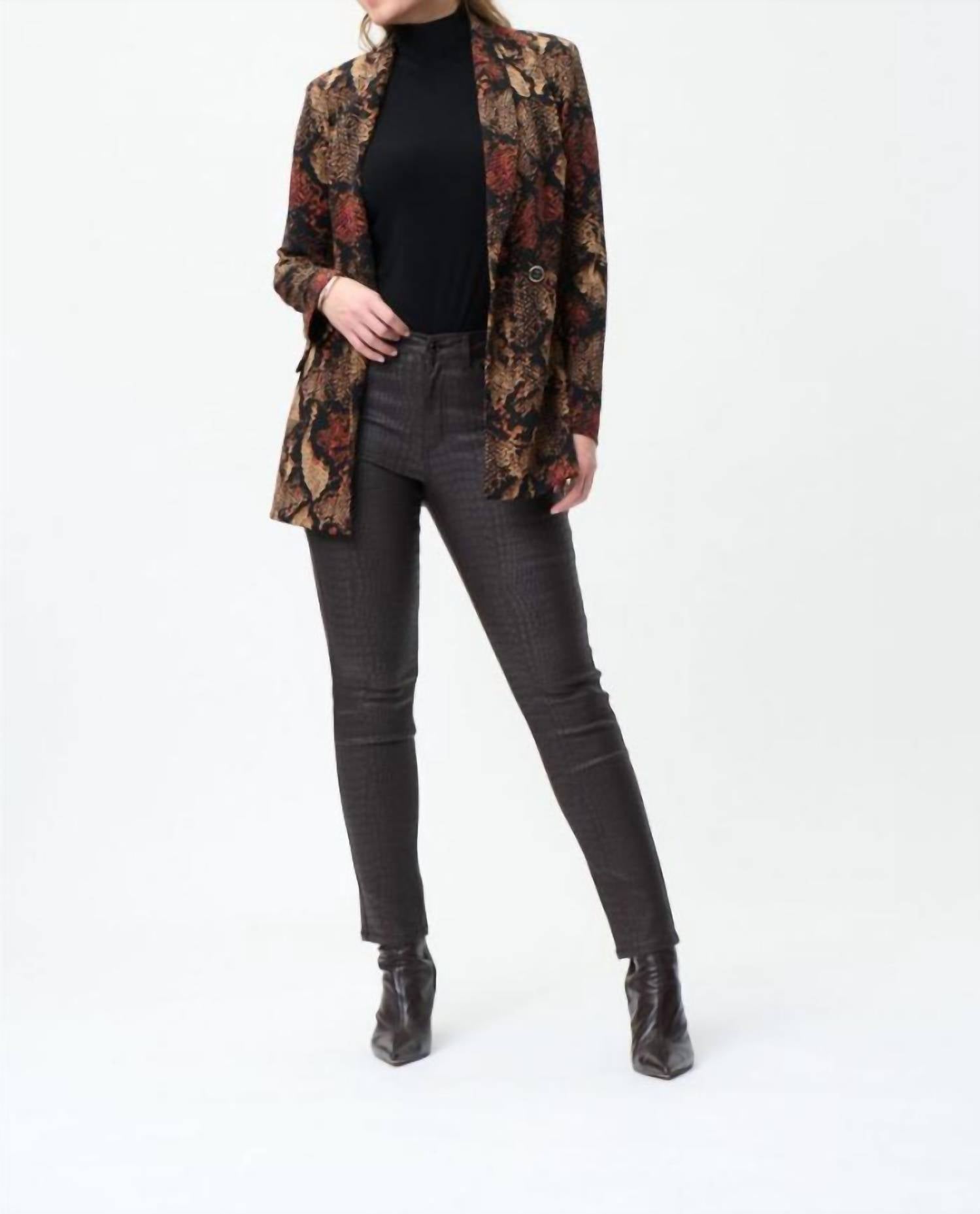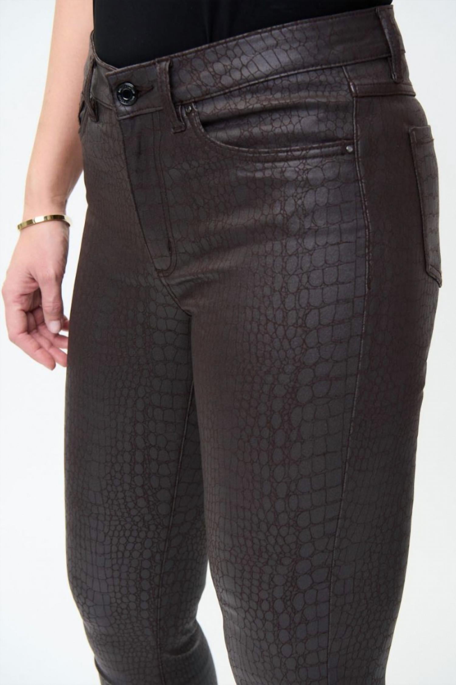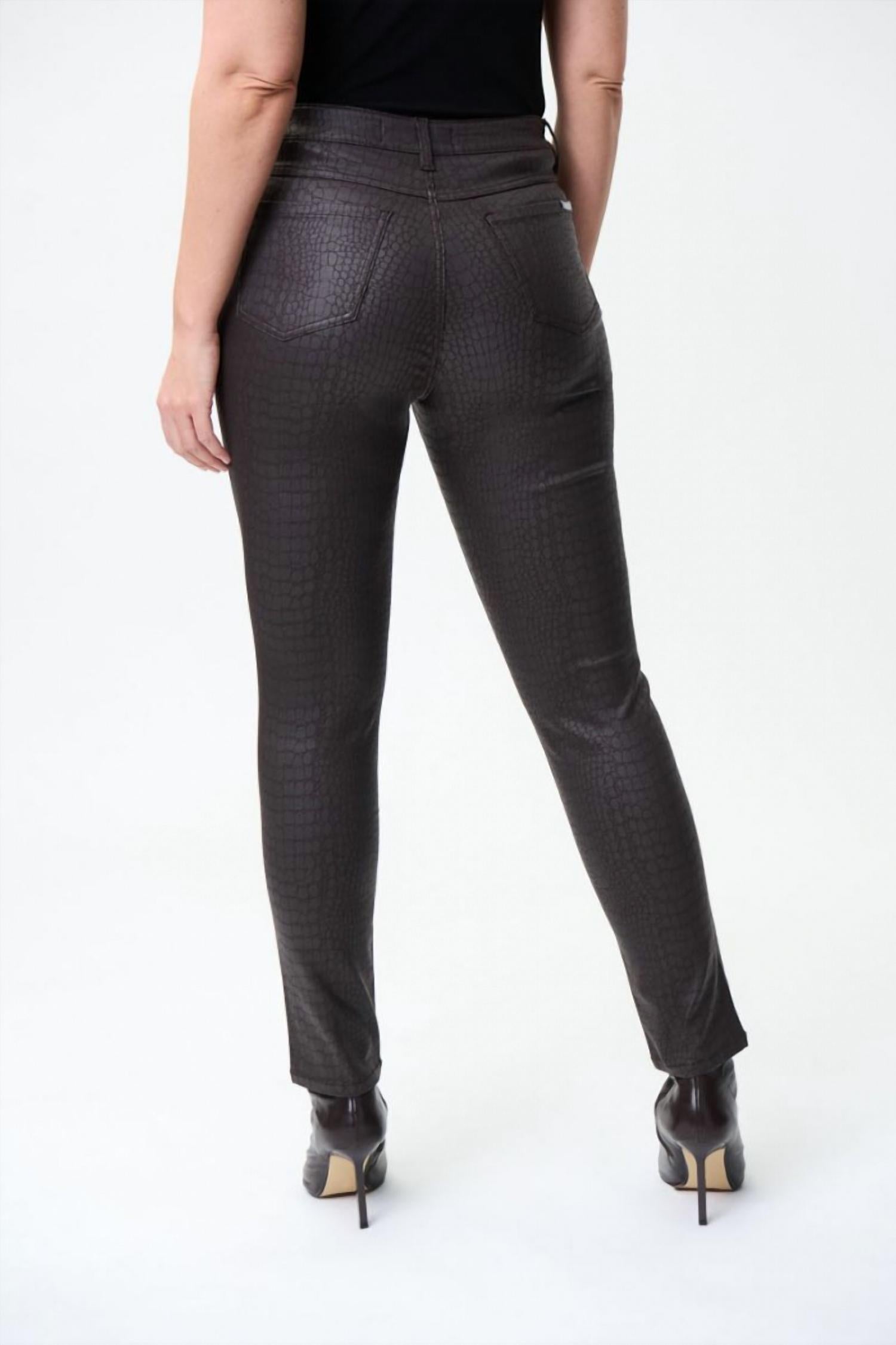 Keen on a little sheen? These pants, designed by joseph ribkoff offer you that, and so much more. With a classic, slim cut, and croc print, these jeans are guaranteed to bring extra style to your wardrobe. 82% viscose rayon, 15% nylon, 3% spandex. Back pockets. Front pockets. Zipper. Slim fit Our model is 5'11", 180 cm and wears a size 6. Approximate inseam length (size 12): 30" - 76 cm.
