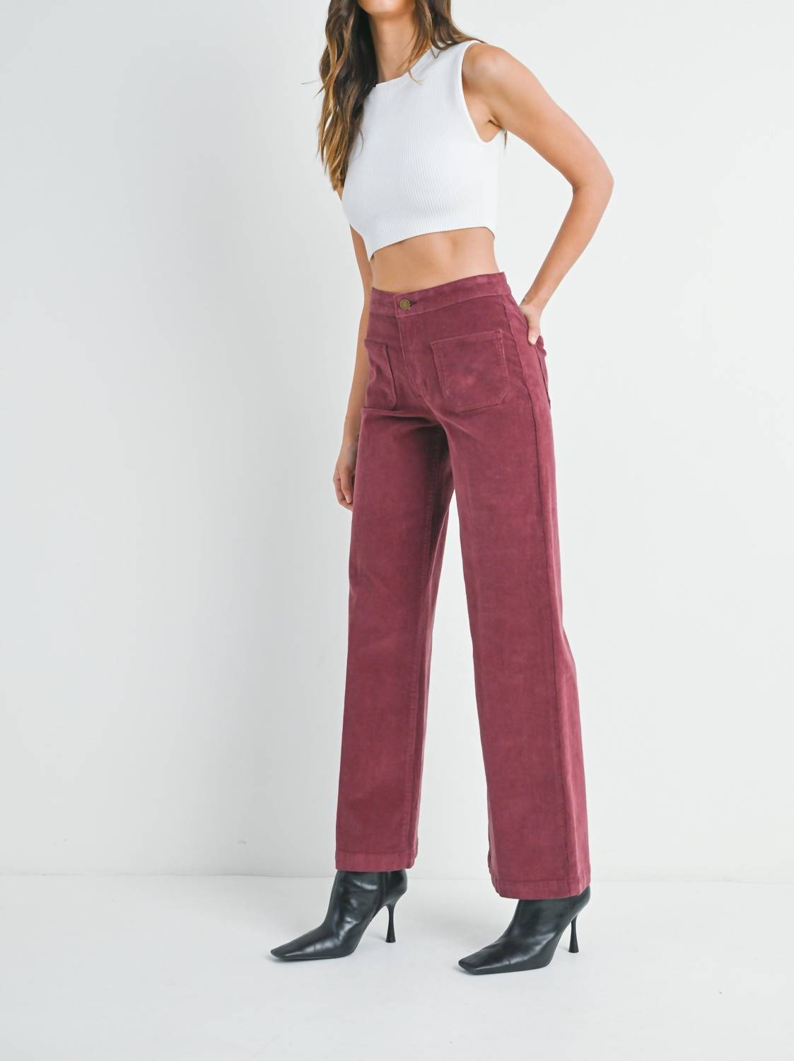 Elevate your wardrobe with the Gabriel Pants by JBD, a stunning fusion of style and practicality. These women's wide-leg pants in a rich burgundy hue feature a high-rise waist and button closure, offering a comfortable regular fit. The solid-patterned corduroy fabric adds a touch of luxury, while functional mini patch pockets enhance their utility. With their longer length and wide legs, these pants are designed to make a statement with versatility in mind.