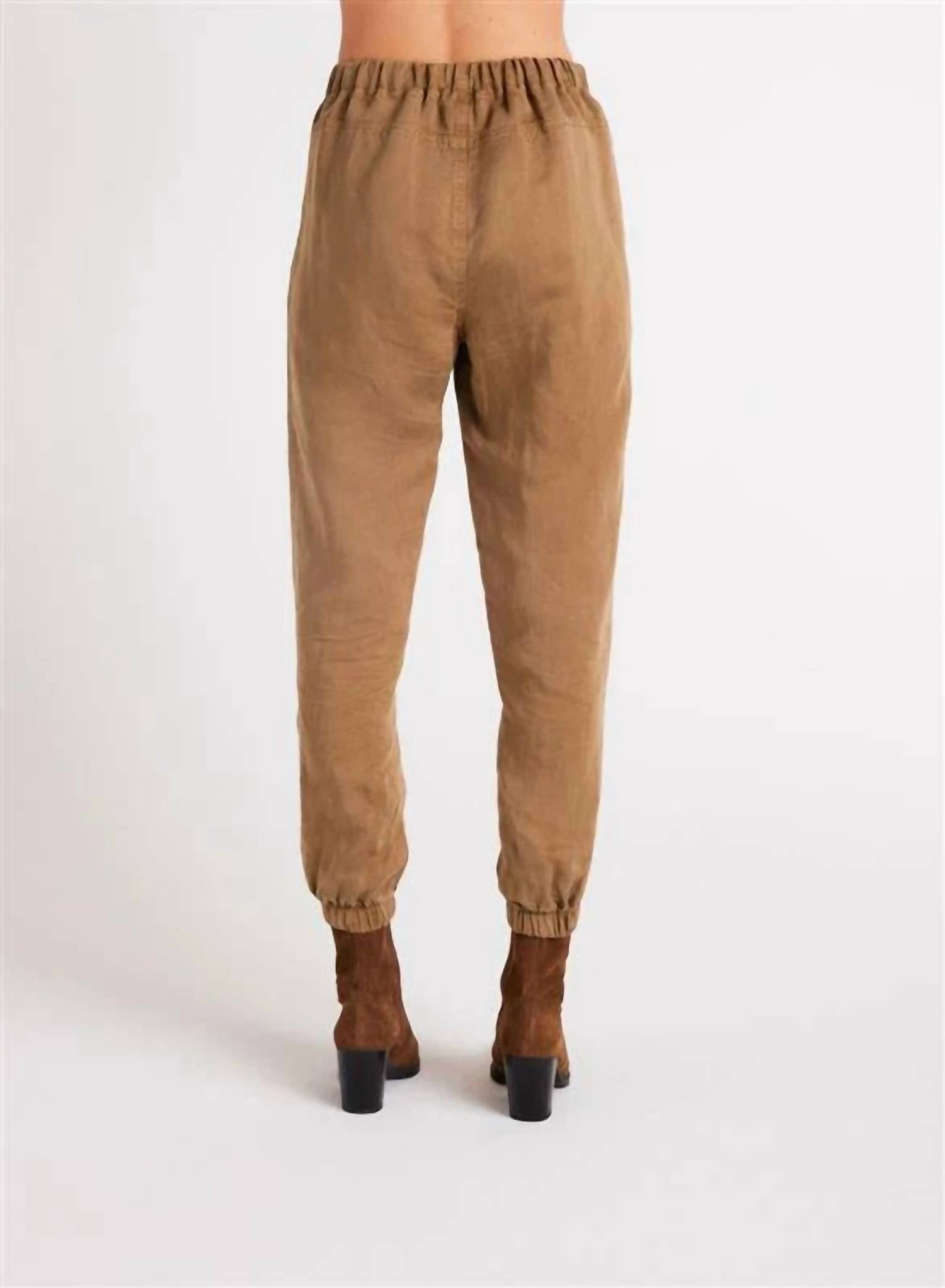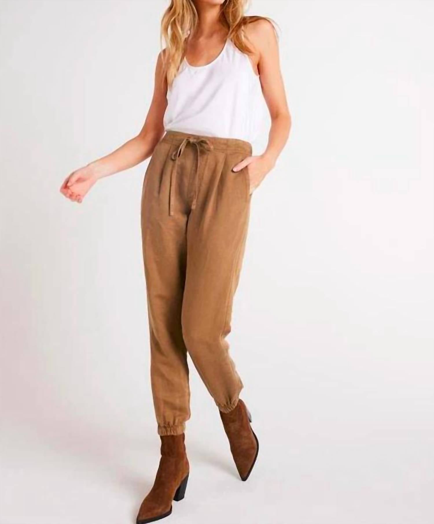 The perfect pant for running around town and looking cool while doing it. Discover effortless style with the Luna Pleat Front Jogger by Bella Dahl in Topaz Brown. These high-rise joggers feature front pleats, front pockets, and a convenient drawstring waist for a relaxed fit. Crafted from a luxurious blend of 55% Linen and 45% Tencel Lyocell, these pants promise both comfort and elegance. Care instructions: Machine wash cold for easy maintenance. Model is 5'10" and wearing an XS.