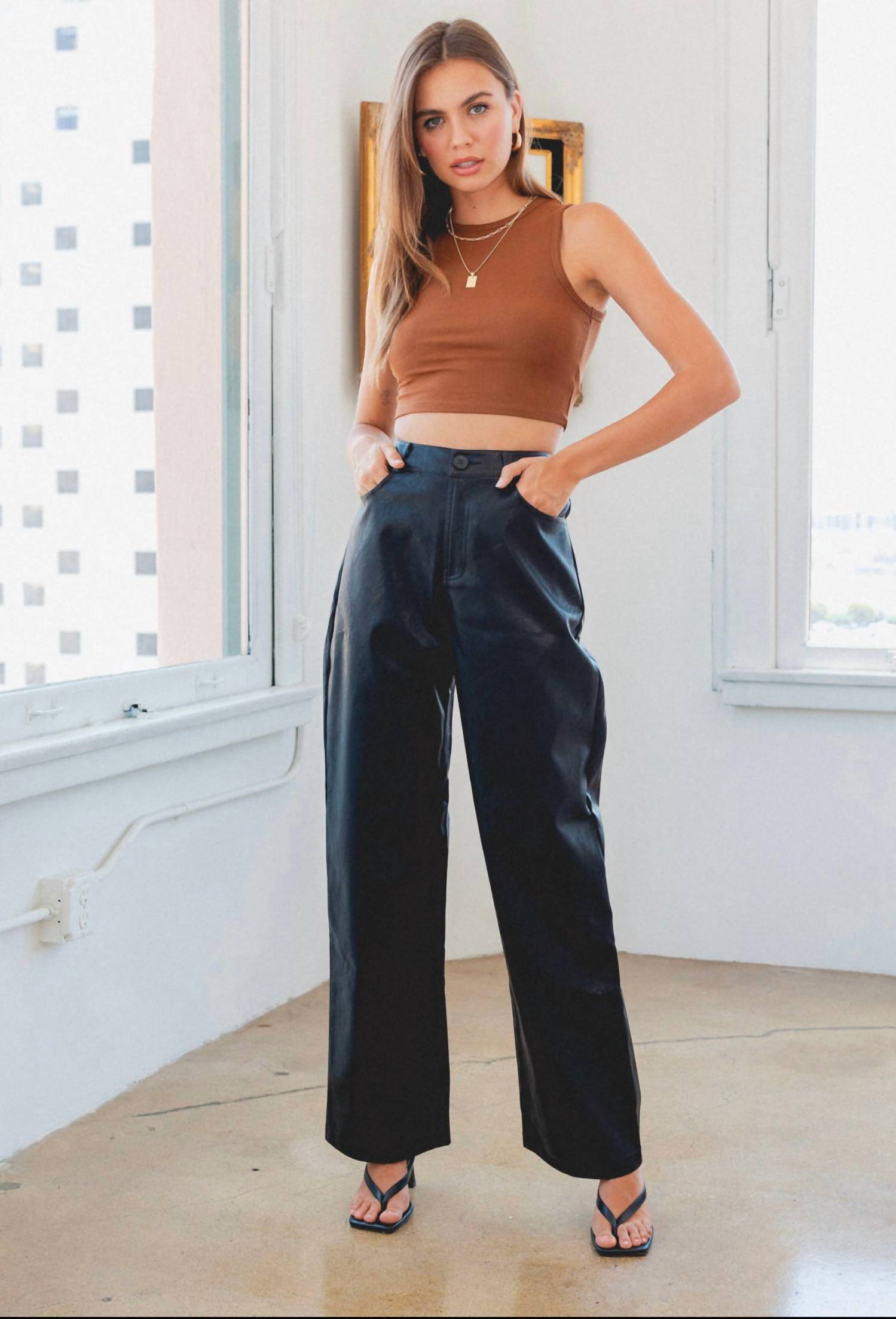 Step into style with the Faux Leather Wideleg Pants by LE LIS, perfect for a chic and modern look. Crafted from sleek black faux leather, these pants feature a solid pattern and a relaxed fit. They are designed with a convenient button closure and practical pockets for everyday ease. Ensure these trousers maintain their exquisite appearance by following the care instruction to dry clean only.