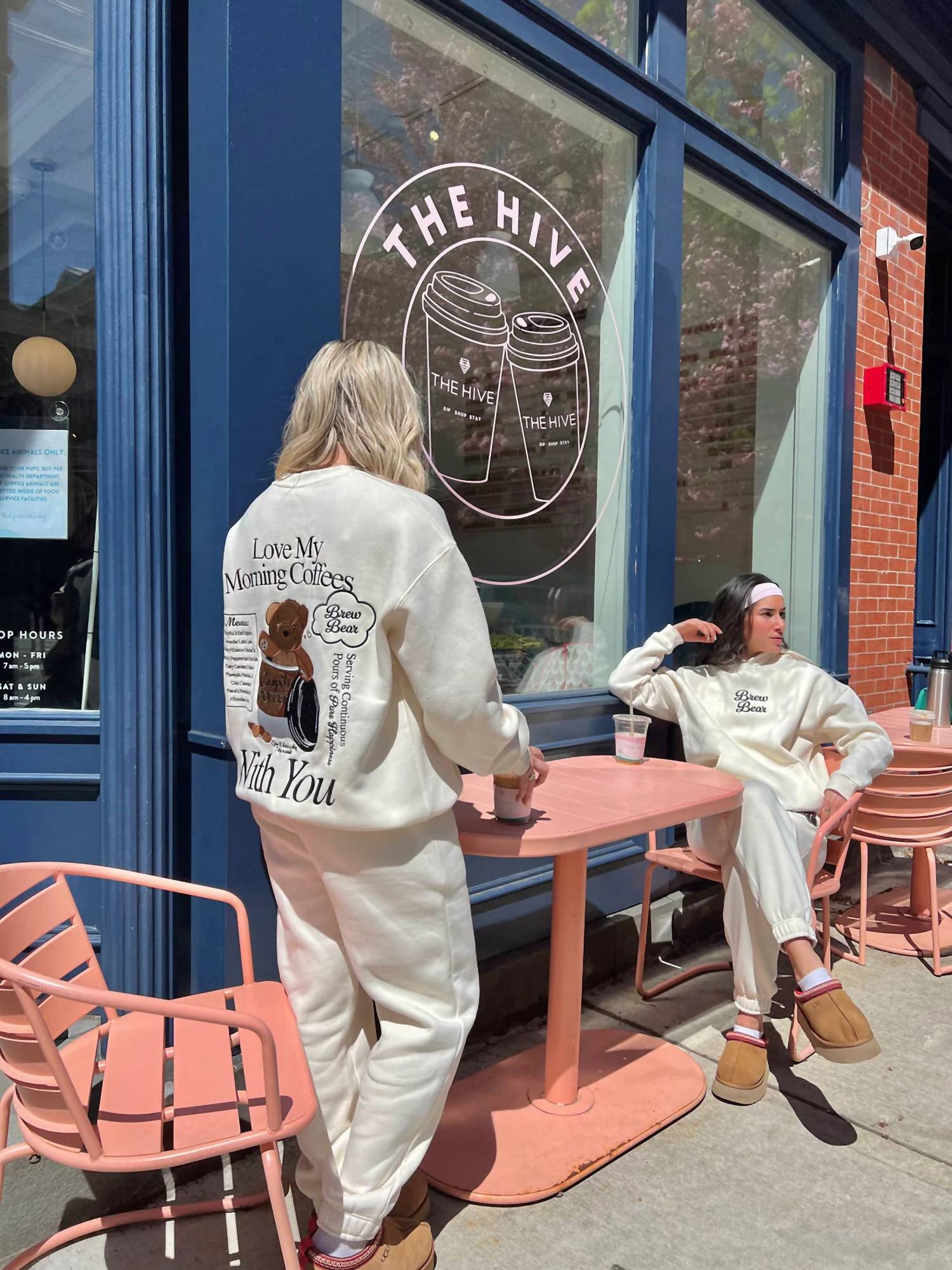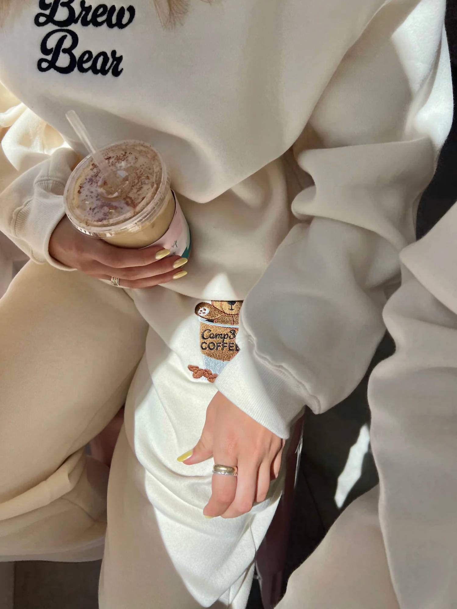 Pair these with your favorite sneakers for an effortlessly cool look. Discover the Brew Bear Sweatpants by The Happy Camp3r, crafted for unrivaled comfort and style in women's activewear. These white track pants feature a heavy-weight fleece composition, combining 51% Cotton and 49% Polyester, for a relaxed and cozy fit. The playful graphic design adorns the side pocket for a unique touch, perfect for lounging or casual outings. Designed with a wide leg and pull-on closure, these sweatpants offer effortless wear.