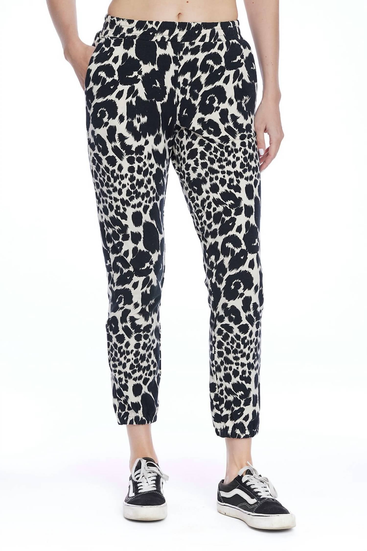 Upgrade your wardrobe with these cropped pants, designed to merge sophistication and wearability. The tailored fit ensures ultimate comfort during long days or nights out. The French terry pants features a soft, slim, comfortable fit. Pair with our matching pullover, and your seasonal aesthetic is set! The black print is a bold complement to the item's sand-colored base. Model is 5'9" and wearing size small.