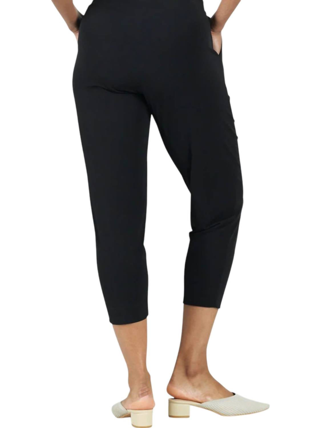 Wear these adorable capri pants with slides or cute flats for an effortlessly cool look. Introducing the Techno Stretch Capri Pants by CLARA SUNWOO, a stylish mid-rise essential featuring a solid black knit composition. These capris are crafted in the USA from techno stretch fabric, ensuring a slimming silhouette with a comfortable 1-inch elastic waistband and straight leg design. Closure: Pull-on. Care: Machine wash. The model is 5'8" and wearing an extra small, fitting true to size.