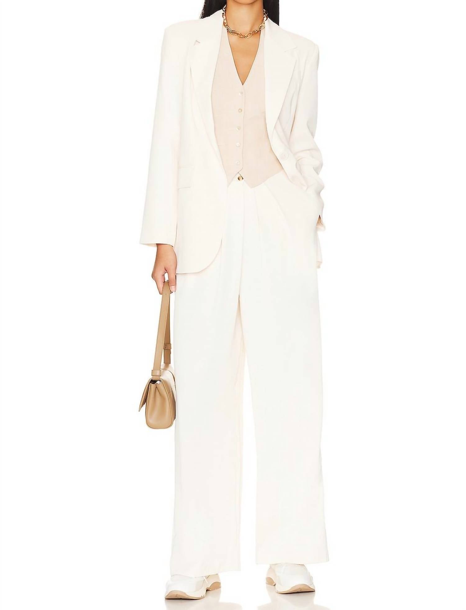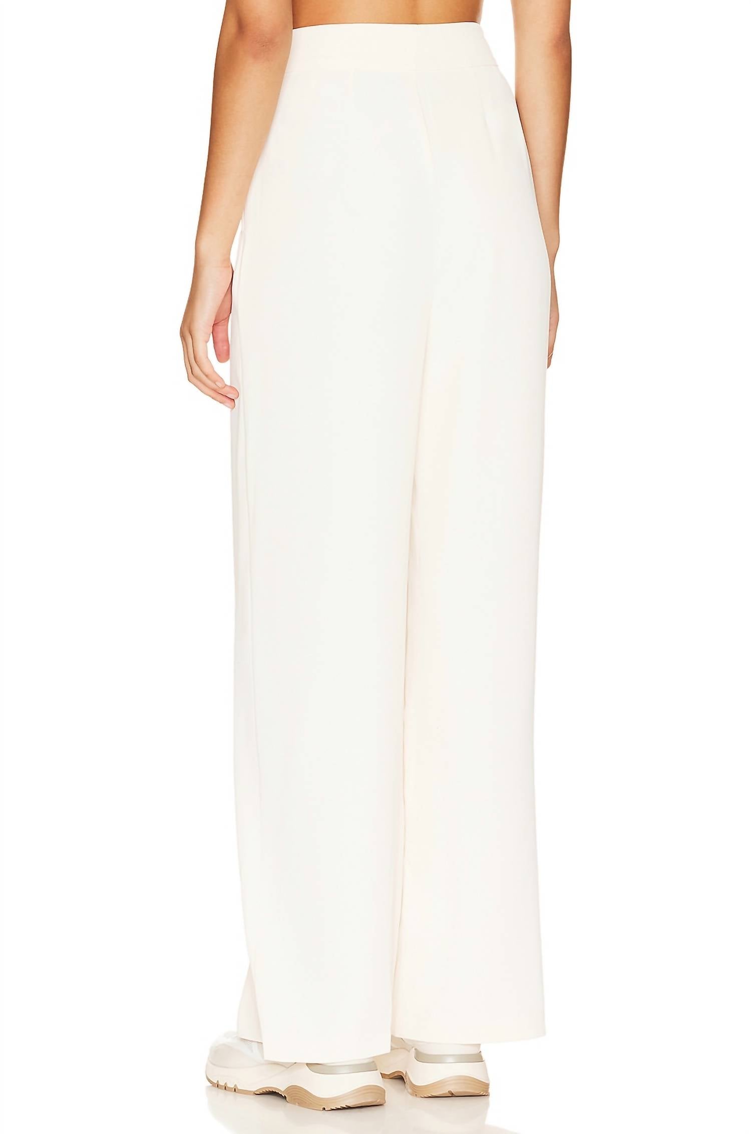 High rise crisscross waist. Pleated front. Slanted side pockets. Baggy fit. Wide leg. 100% Polyester. Dry clean only. Pair with a crop-style top and a dainty heel. Made in China. Front button closure. 64 cm at the knee narrows to 61 cm at the leg opening. 29.0" Inseam / 15.5" Rise / 25" Knee Opening / 24" Leg Opening.