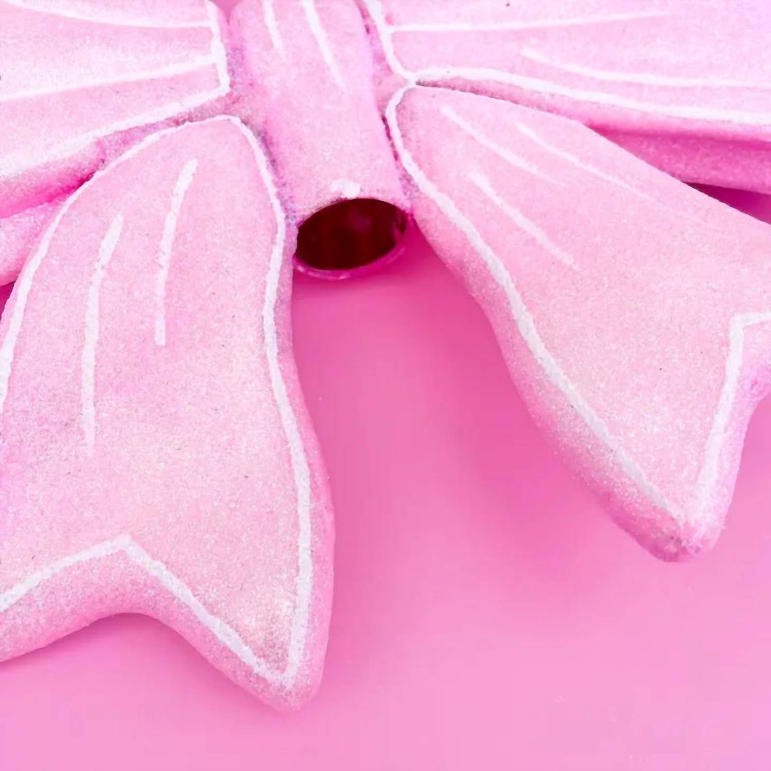 Elevate your holiday decor with the Giant Bow Christmas Tree Topper by Rock Paper Scissors, featuring a vibrant pink glitter design. This handcrafted, unique piece measures 12" x 9" and weighs 3lbs, making it a standout addition to any festive setting. Each tree topper is a one-of-a-kind creation, ensuring your holiday display is truly distinctive.