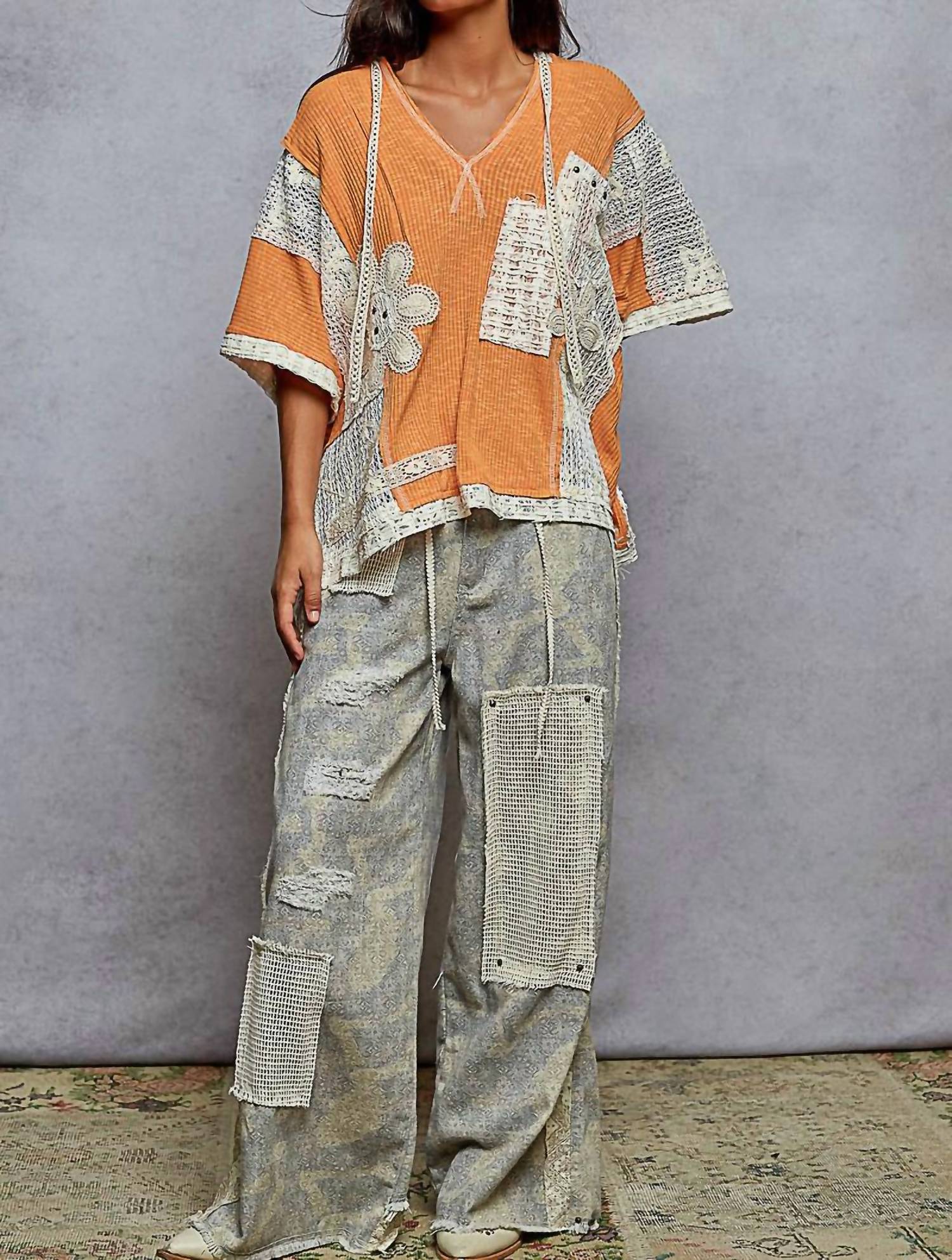 Pol - Oversize Short Sleeve Floral Patch Crochet Hoodie Top
