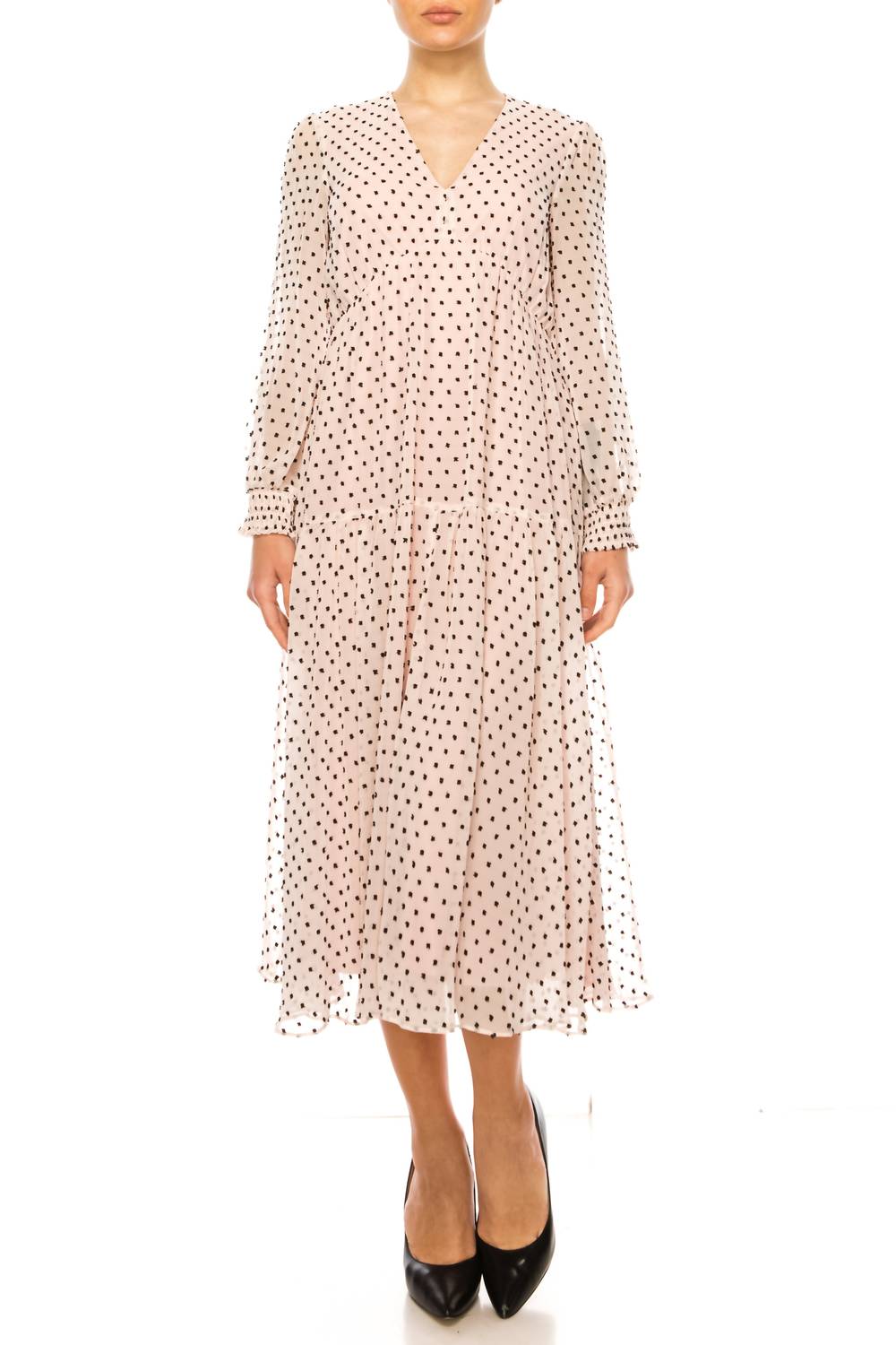 Who doesn't love a good maxi dress? This one you'll be reaching for season after season. Introducing the Long Sleeve Empire Waist Maxi Dress by Maison Tara in a captivating blush black combination, ideal for elevating your wardrobe. This elegant maxi dress boasts long sheer ribbed cuff sleeves and a v-neckline, with a charming polka dot pattern throughout. Crafted from 100% polyester chiffon with a fully lined interior, it features a graceful empire waist silhouette. Care for it by hand washing in cold water, and rely on the secure hook and eye closure for ease of wear.