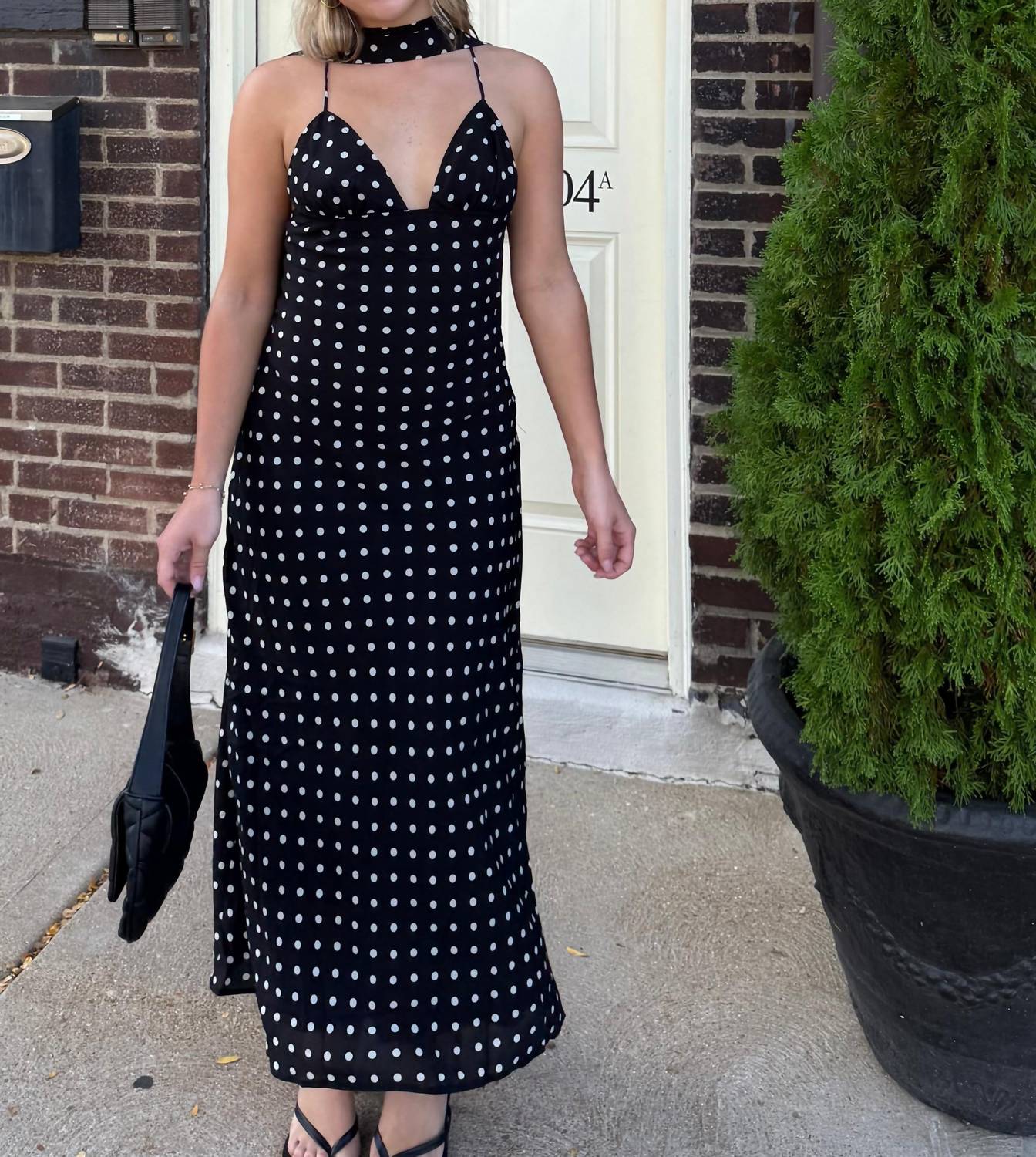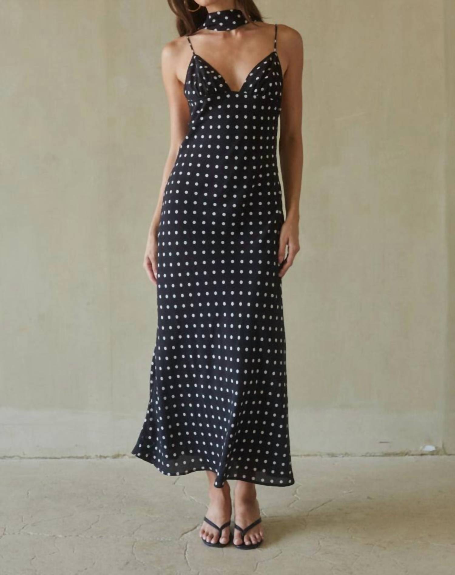 Style this maxi with your favorite statement necklace and sandals for the perfect look. Introducing The Emilia Maxi Dress by Et Clet, a chic piece perfect for any evening event. This dress features spaghetti straps, a flattering V-neckline, and an open back with an adjustable tie, all in a stylish polka dot pattern. Composition: Self 100% Polyester; Lining 100% Polyester. Closure: Pull On. Care: Dry Clean Only. Model Audrey wears size small (5'5" height, 32A bust, jeans size 24). Elevate your look with the included matching scarf for added elegance.