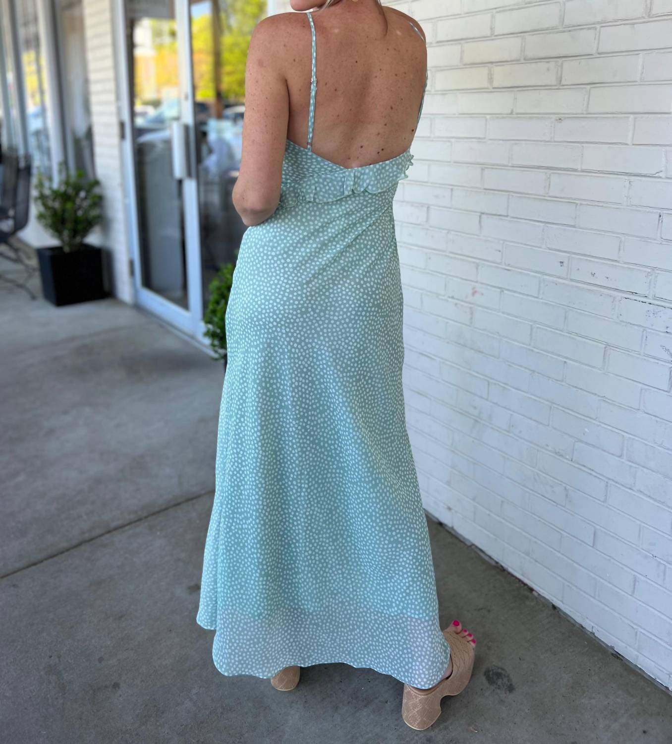 Who doesn't love a good maxi dress? This one you'll be reaching for season after season. Elevate your summer wardrobe with the Chrishell Polka Dot Maxi Dress by INA, a mint-green sheath that exudes playful elegance. With spaghetti straps and a scoop neck, this sleeveless dress features a charming polka dot pattern and flirty ruffle details. The adjustable straps and lined interior ensure a comfortable fit, while the tie closure provides a customized silhouette. Perfect for vacation or New Year's Eve, Hannah is pictured wearing a medium size.