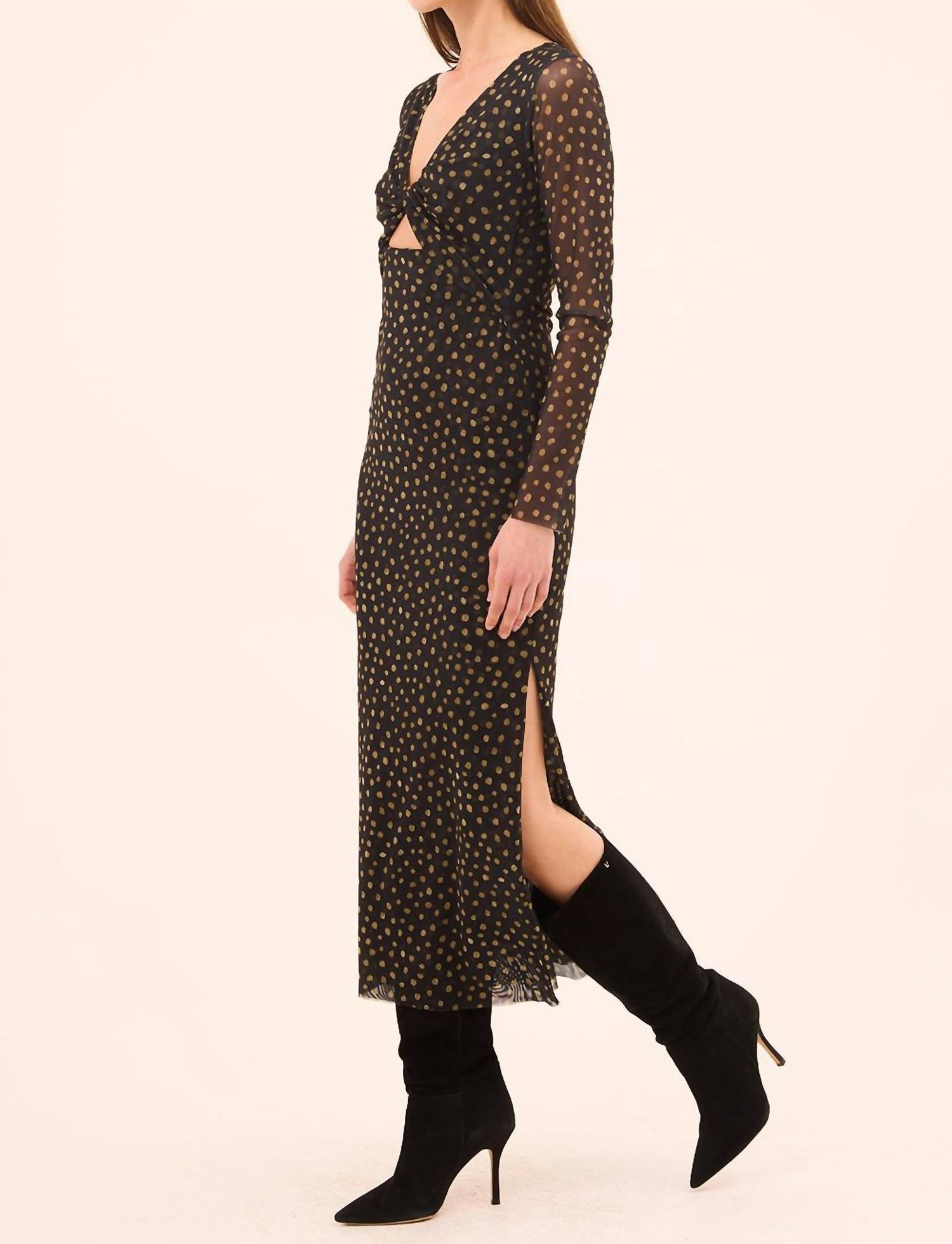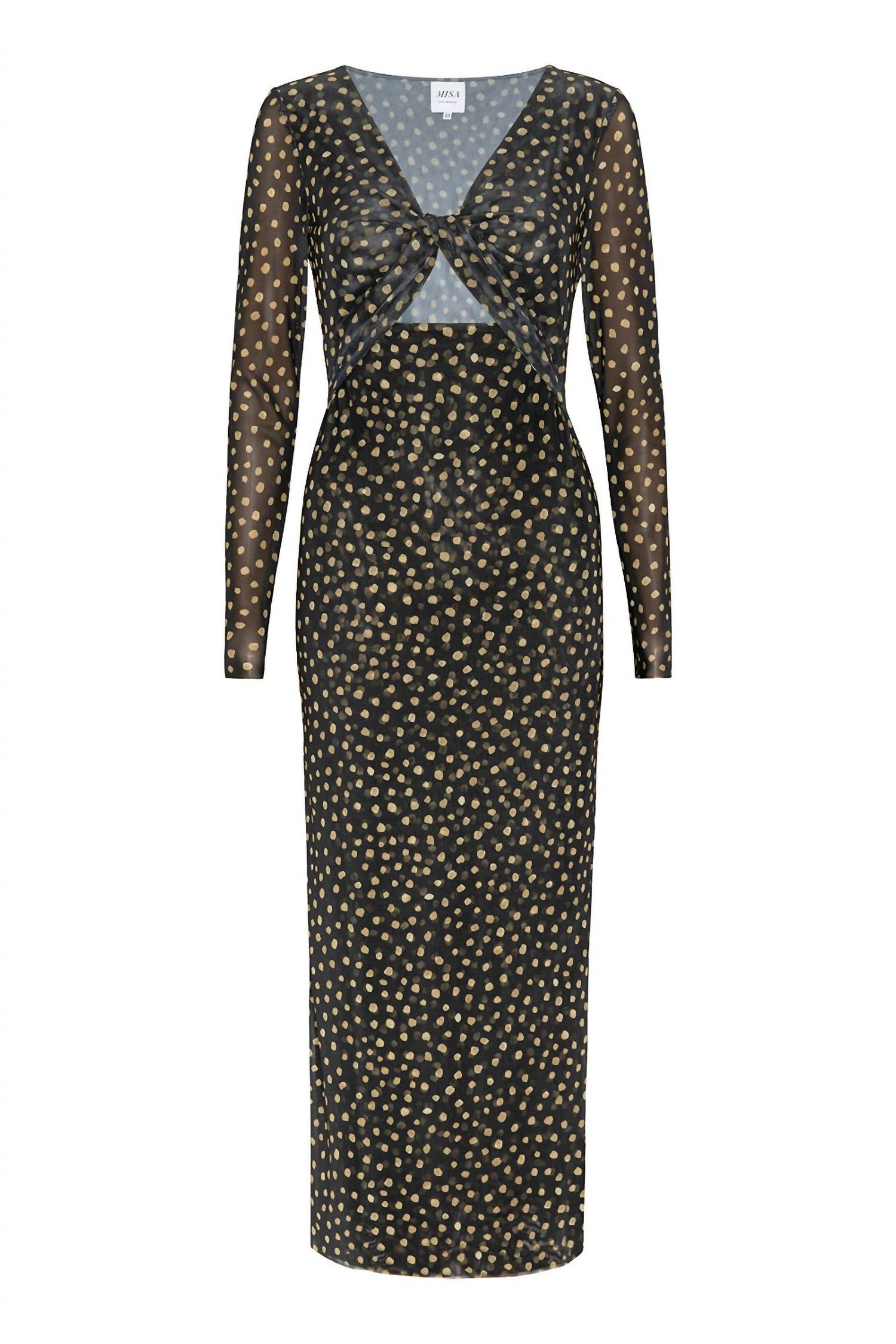 The pefect long sleeve dress for those cooler months. Introducing the Misa Los Angeles Tamar Dress, a striking midi design in a Gold Polka Dot print that combines elegance with a hint of allure. This dress features long sleeves and a deep V twist-front neckline, enhanced with a triangle cutout beneath the bust and a side slit, perfect for any dinner party. Crafted in the USA from 100% polyester stretch mesh, it ensures a flattering fit with a pull-on closure. Care for this sheath silhouette with a dry clean to maintain its Boho Chic appeal. Model is 5'8.5", wearing size XS (25" waist, 32" bust, 34.5" hips).