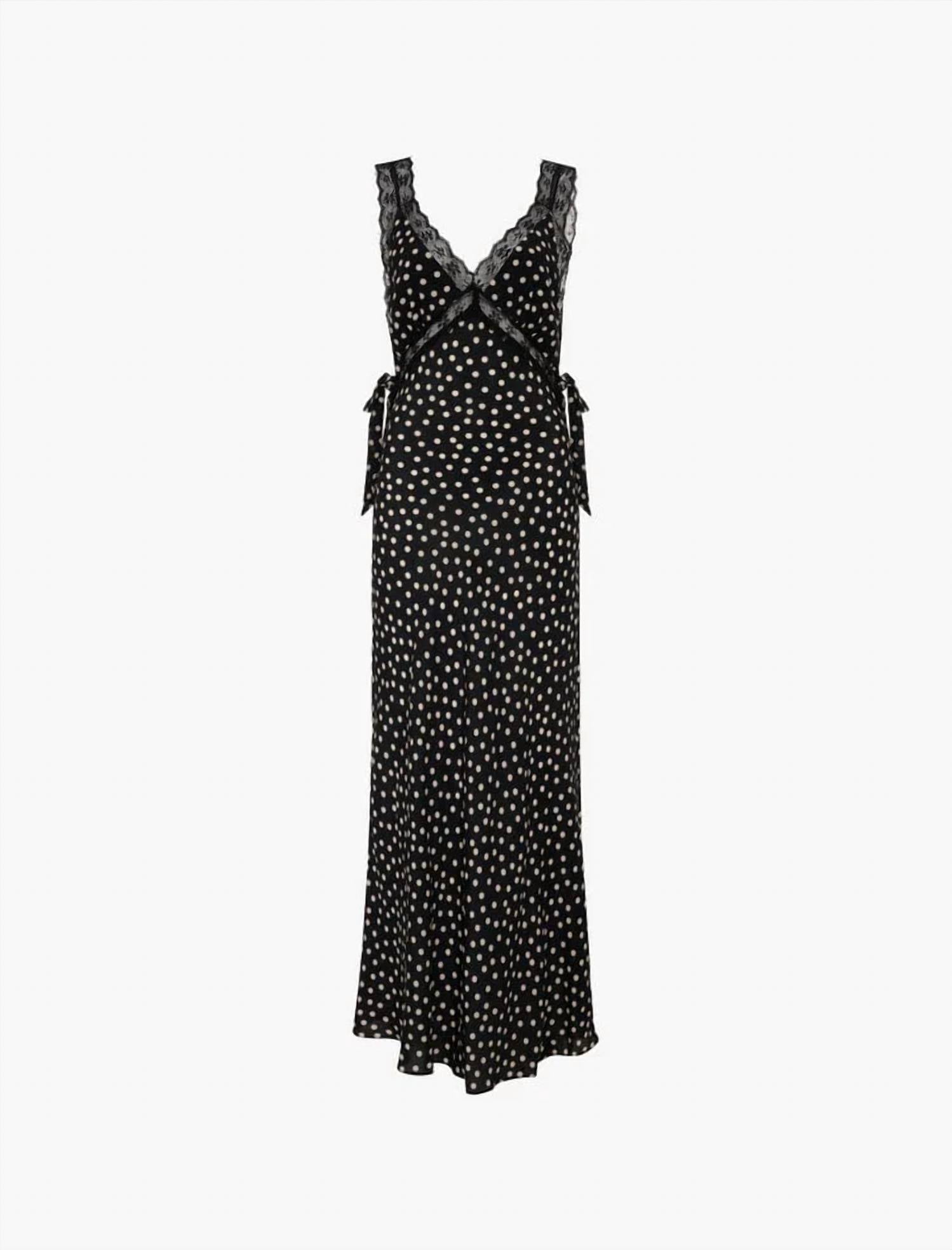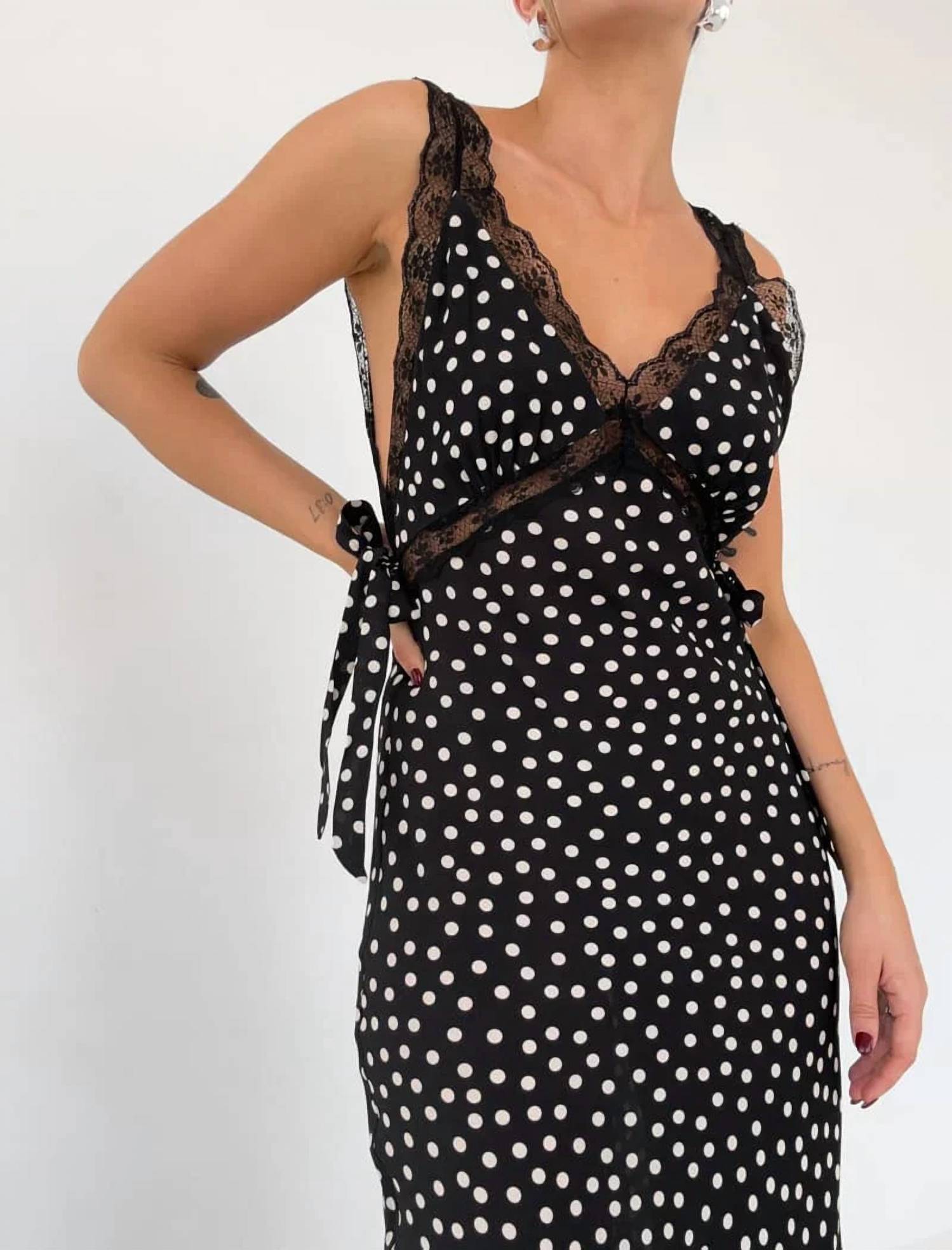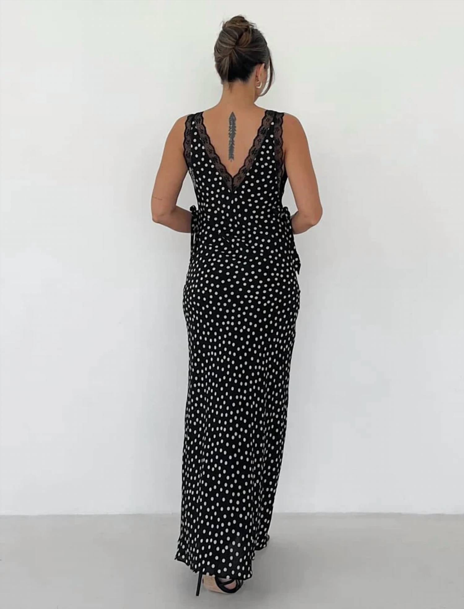 Who doesn't love a good maxi dress? This one you'll be reaching for season after season. Introducing the Dolly Ditsy Dot Lace Trim Midi Dress by Rumored, a captivating evening piece embracing 90s fashion with a sleeveless silhouette and timeless polka dot pattern. Crafted from a 50% Viscose and 50% Rayon blend, this black and ivory slip dress features a v-neck adorned with lace trim at the neckline, underbust, and straps, adding a delicate touch. Self bow ties at the side seams complement its bias cut, exuding elegance and grace. Designed for a summer evening event, this dress measures 50.5 inches in length from the shoulder strap join to hem, making it perfect for showcasing chic sophistication without the fuss of additional closures.