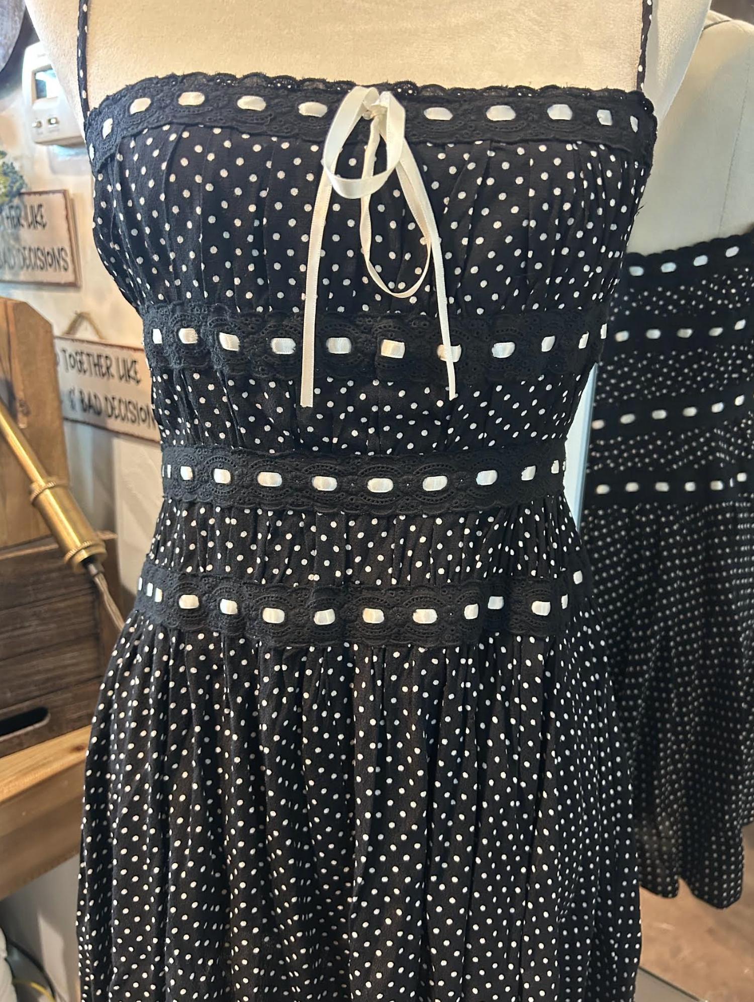 A short and breezy dress for those warmer days. The Polka Dot Mini Dress by Sky to Moon is a chic addition to your summer wardrobe, ideal for a concert or a night out. This dress features adjustable spaghetti straps and a flattering fit-and-flare silhouette, accentuating your style effortlessly. Made from 100% Rayon with a polyester lining, the dress boasts a playful black and white polka dot pattern. Finished with a secure zip closure, this sleeveless piece perfectly embodies 90s fashion, offering both comfort and a dash of elegance for women.
