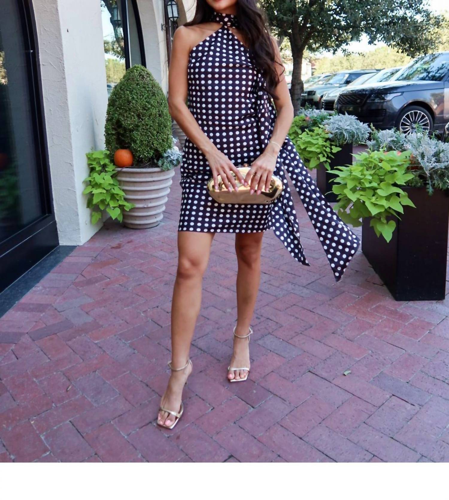 The kind of easy and flattering dress you'll be reaching for all season long. The Scarfed Away Mini Dress by Sky to Moon combines playful and polished style with its sleeveless design and halter neckline. This mini dress, crafted from 100% polyester, flaunts a silky satin fabric adorned with classic white polka dots. The bias-cut silhouette offers a flattering drape, complemented by a sheer scarf-tie neckline and a hidden side zipper for seamless wear. Care: Hand wash cold and line dry. Model is 5'7" and wears a size Small.