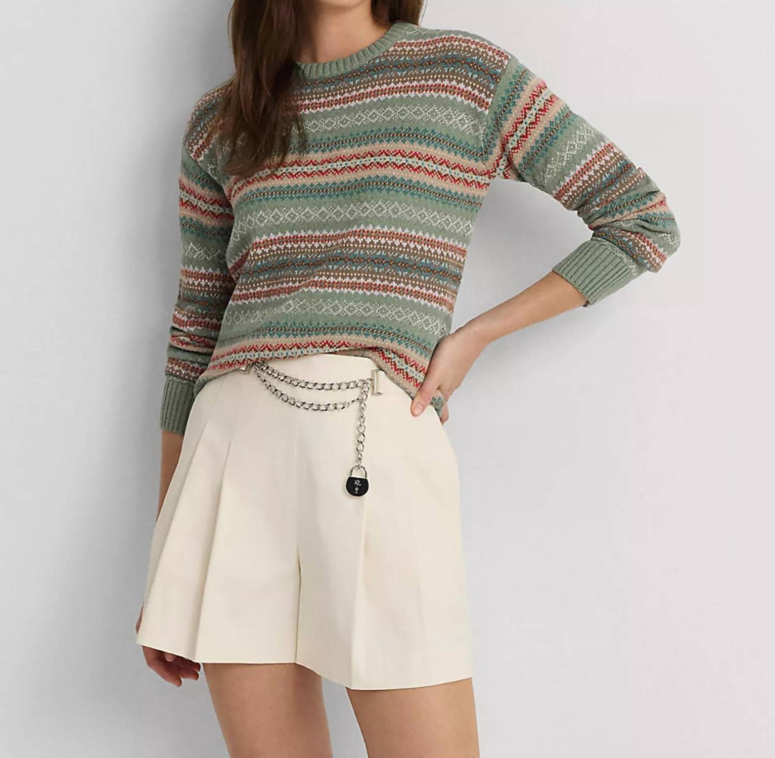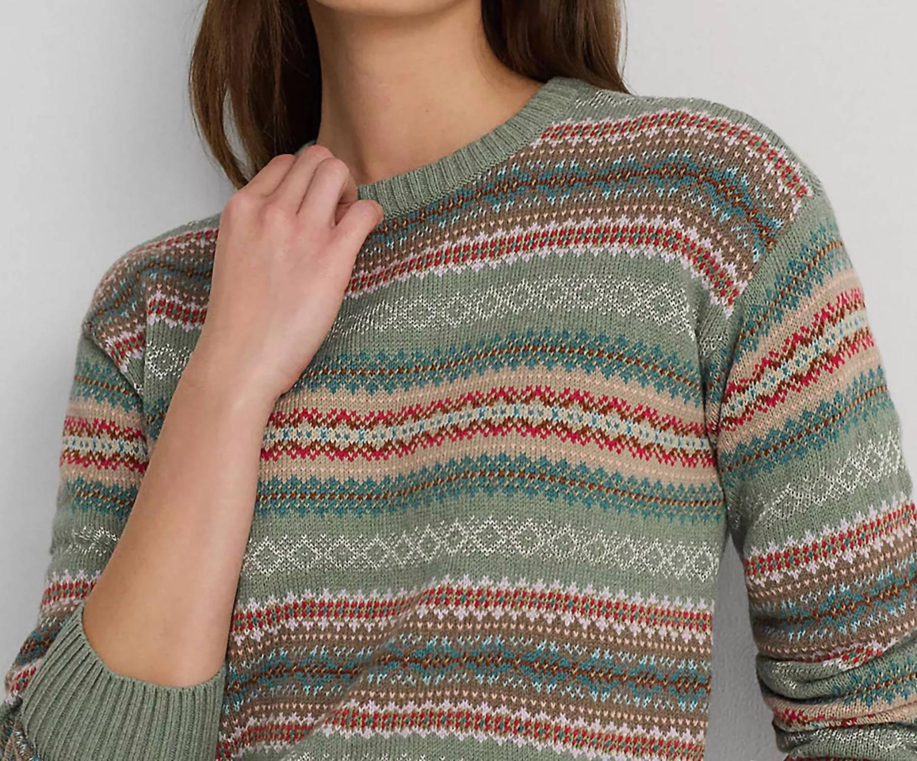 Experience the perfect blend of comfort and style with this trendy crew neck sweater, designed to effortlessly elevate your wardrobe. Pair it with your favorite denim and loafers for the perfect look. Elevate your fall wardrobe with the Fair Isle Cotton Blend Sweater by Ralph Lauren, crafted for those who seek both comfort and style. This green, patterned piece showcases long drop shoulder sleeves with ribbed details, designed for a relaxed fit. Composition includes 74% cotton, 18% linen, and 8% viscose, providing softness and breathability. Closure: Pull on. Care: Machine wash with lay flat to dry. Garment length: 21.5", sleeve length: 21.5".