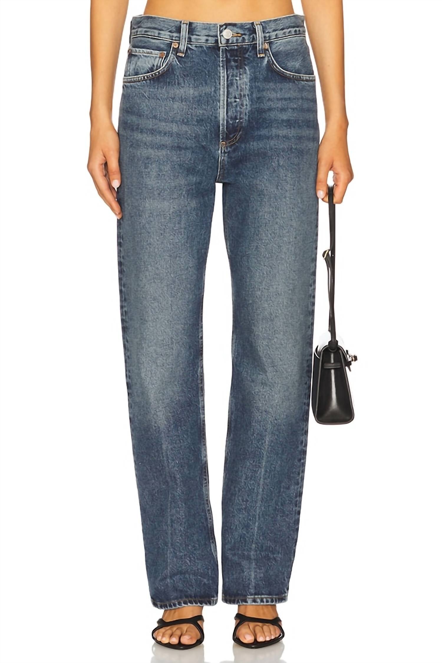 Pair these straight leg jeans with flats, sandals or even heels! You can't go wrong. Discover the Fran Jean by AGOLDE, a statement piece in a dark Dwell colorway tailored for the minimalist trend. Crafted from 100% Regenerative Cotton, this relaxed fit straight leg style features a low rise with an 11.5" rise and a 26.5" inseam. Originating from Turkey, these jeans offer a convenient button fly closure and functional pockets for added practicality. Care for them easily with a machine wash cold on the inside, and enjoy the convenience of a tumble dry.