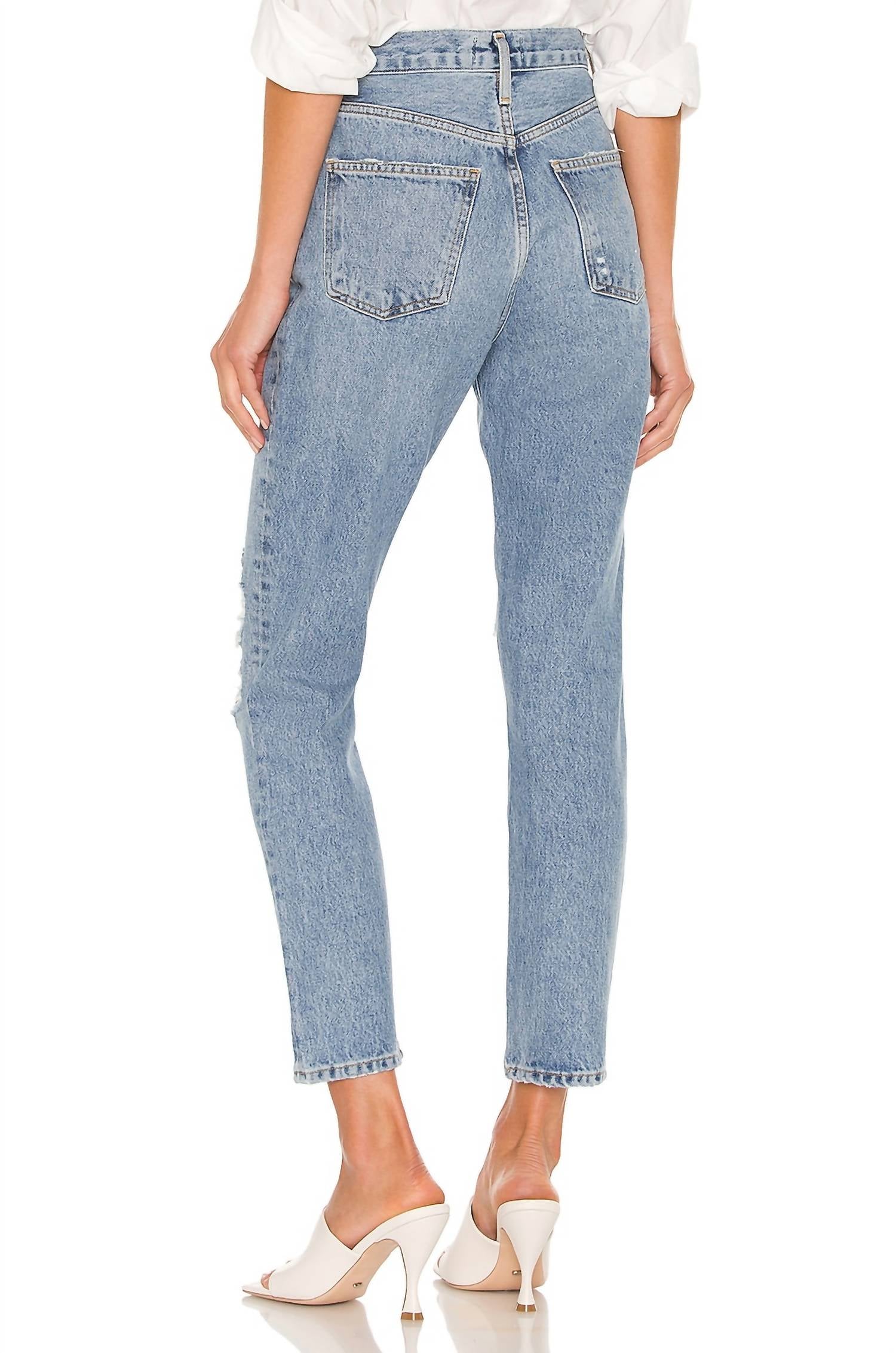 Tuck your favorite tee into these high-waist jeans for a more casual-cool feel. Discover the AGOLDE Fen High Rise Relaxed Taper Jean, a stylish addition to your wardrobe. These women's jeans are designed in a medium wash Wander hue, featuring a high-rise, straight leg cut with a slightly tapered leg for a vintage-inspired look. Crafted in Turkey from 100% organic cotton denim, the jeans offer durability with a rigid texture and feature unique distressed detailing that varies for each pair. Measuring a 27.5" inseam and a 10.5" rise, these jeans include a 14" knee opening and a 12" leg opening, with a classic button fly closure and five-pocket styling. Care is effortless with a machine wash option, making these jeans a perfect choice for everyday wear or concerts.