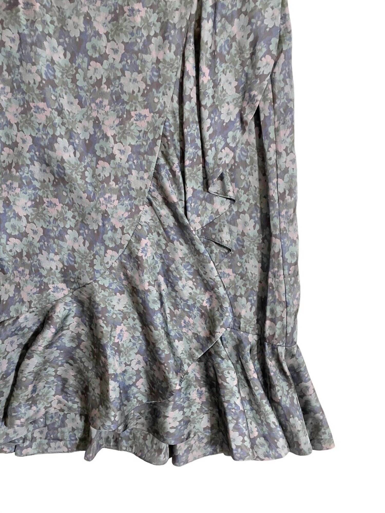 Elevate your wardrobe with the PAIGE Alamar Floral Print Wrap Skirt in a charming gray hue. This midi ruffle skirt beautifully balances flutter and ruffles, offering a dynamic and elegant element to your outfit. With a true wrap style, it features a convenient side tie closure and three buttons, allowing for an adjustable waist. Crafted from 54% rayon, 23% cotton, 22% polyester, and 1% elastane, this skirt measures 30" at its longest point and is easy to care for with a machine wash cold.