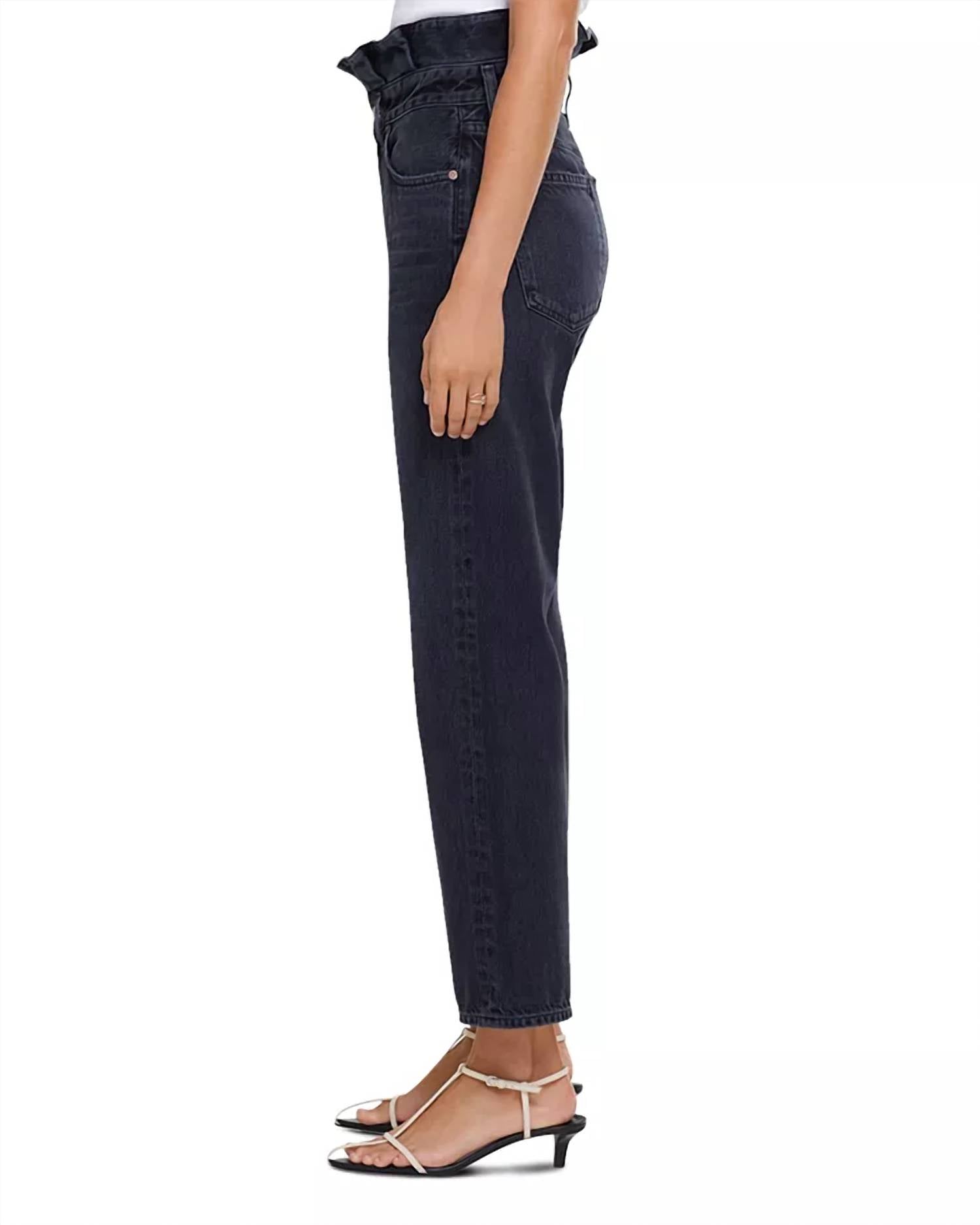 This classic straight leg jean has a perfect fit and goes with just about everything. Experience effortless style with the AGOLDE Lettuce Waistband Jeans in Shambles, featuring a chic high rise of 12.5 inches and a regular inseam of 29 inches. Crafted in Turkey from 100% cotton, these jeans boast a straight leg silhouette, a ruffled paperbag waist, and tonal stitching with silver-tone hardware. The five-pocket design includes a zip fly with button closures, perfectly blending functionality and trend. Care for your pair easily with a machine wash routine, making them an ideal choice for a minimalist wardrobe this spring. Model is 5'10" and wearing a size 27.