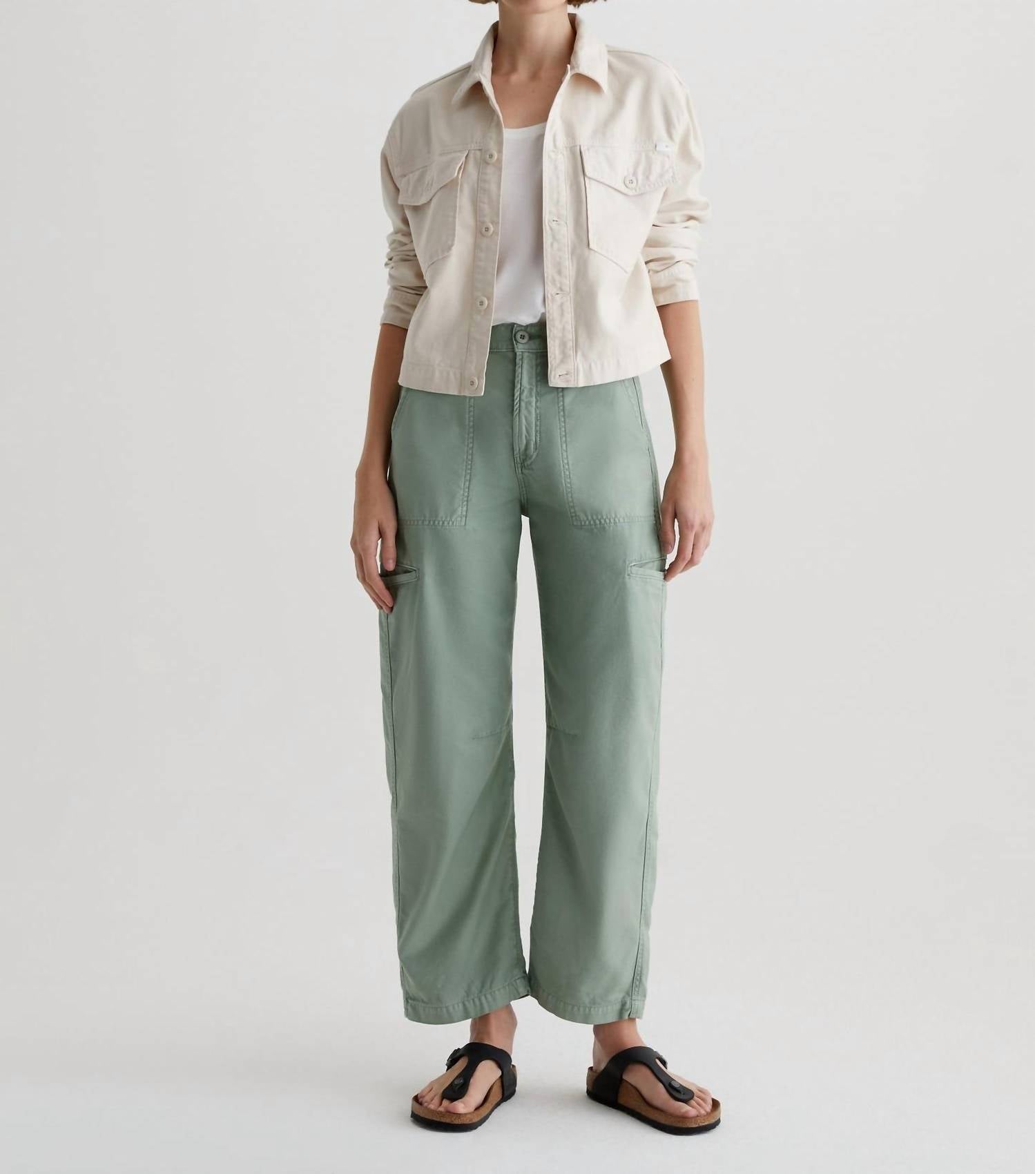 Enhance your wardrobe with this trendy cropped number, designed to blend style and practicality. The comfortable fit allows for easy all-day wear. The perfect length to pair with your favorite mules. Discover the Hazal High Rise Utility Barrel Pants by AG Jeans, a standout piece with a relaxed fit and straight leg, perfect for minimalist style enthusiasts. Crafted from 100% cotton in a unique Sternway Reverse Sateen material, these pants are colored in Sulfur Matcha Latte. They feature a high-rise waist with a button closure and welt pockets on the sides and the back, offering both style and functionality. With an inseam of 27 inches, a front rise of 11.5 inches, and designed for spring occasions, these pants are a chic addition to any wardrobe.