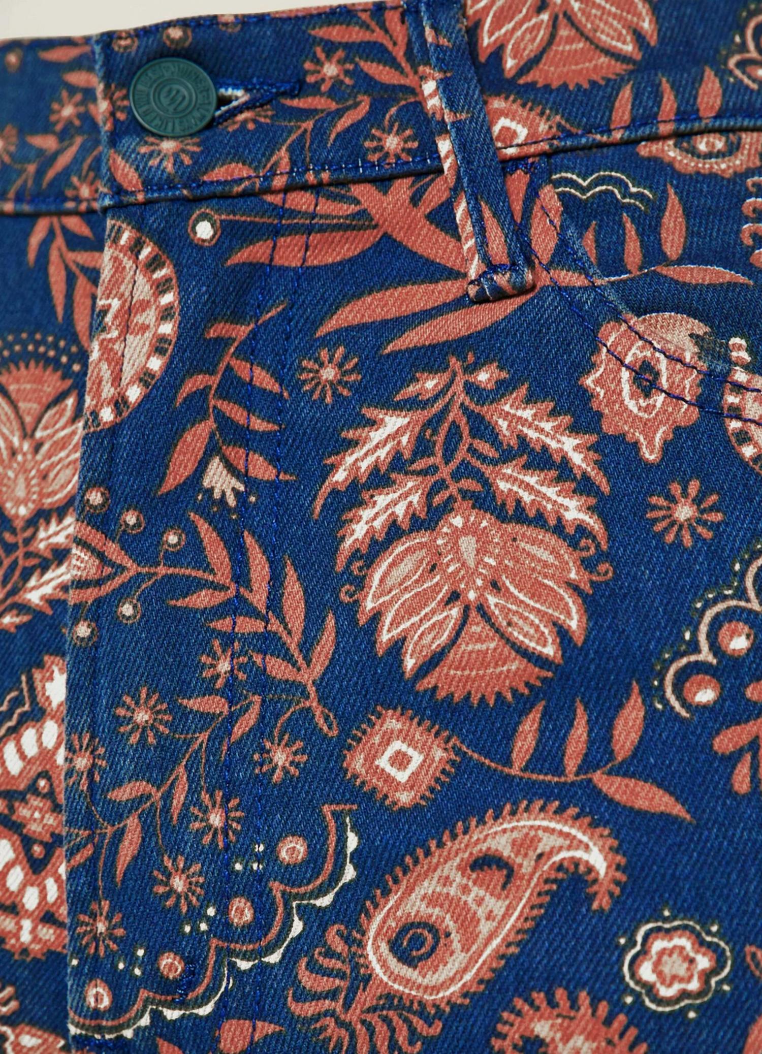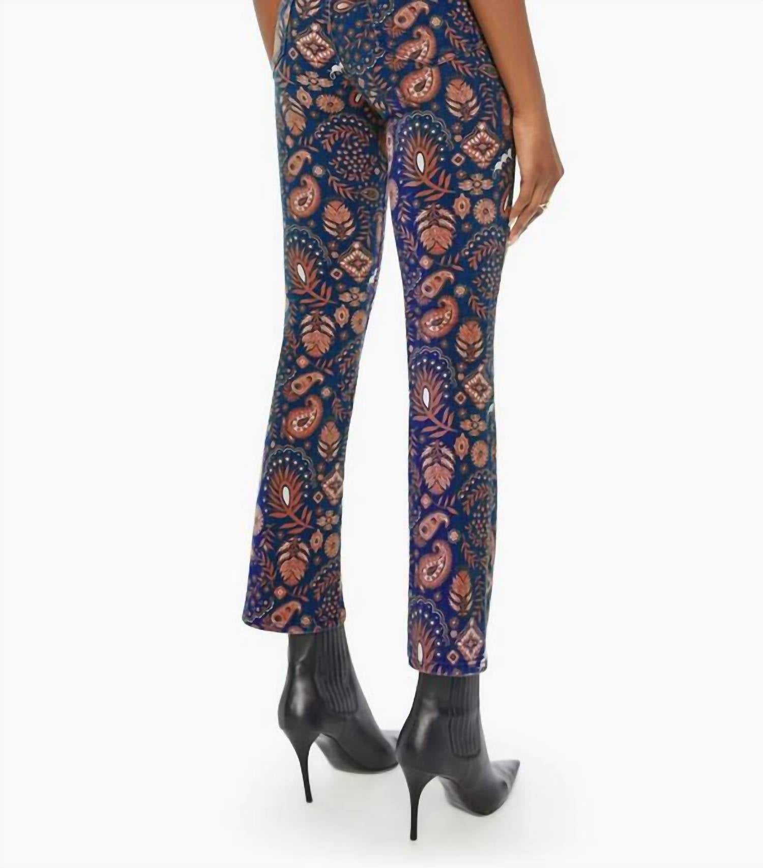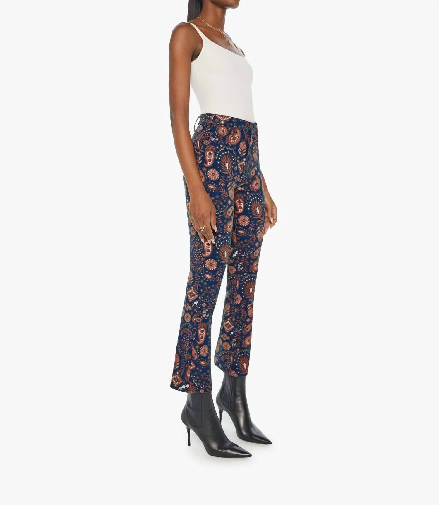 Slightly flared pants are all the rage right now and these are no exception. Pair these with your favorite tee for a more casual look, or with your favorite button-up blouse for an evening out. Introducing the Hustler Flood Pants by Mother, featuring a stylish high-waisted bootcut with a 28.25-inch inseam and a clean hem. Crafted from a cotton blend composed of 93% Cotton, 5% Polyester, and 2% Elastane, these pants showcase the unique Henna Happiness navy and pink paisley print. Made in Los Angeles, they offer a regular fit with a flared leg, making them ideal for maximalist summer vacations. Closure: Button closure. Care: Machine wash and tumble dry.