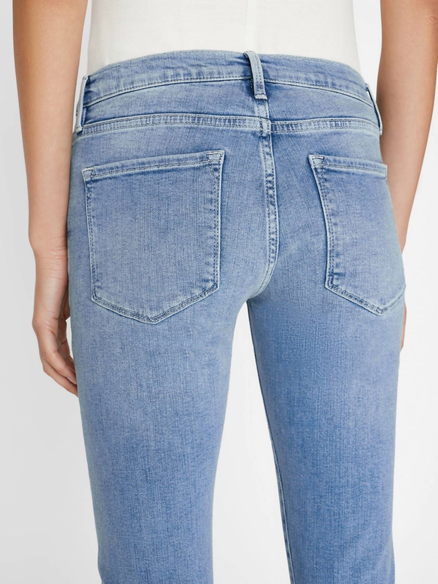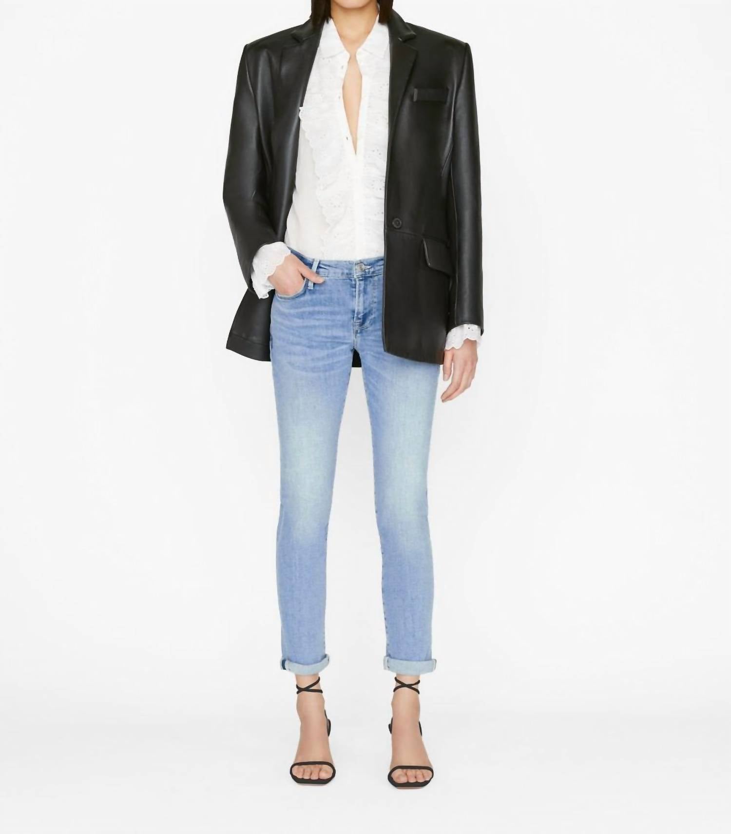 a laid-back feel while still surprisingly form-flattering. Discover the Le Garcon Boyfriend Jean by FRAME, a chic twist on the classic boyfriend style with a slimmer fit. Crafted in Galeston from a super stretch cotton blend (77% Cotton, 18.5% Modal, 3.5% Elasterell-P, 1% Elastane), these jeans feature a light denim wash and a comfortable curved waist with a higher rise in the back. The skinny leg and solid pattern enhance its modern silhouette, complete with a button closure and functional pockets. For care, machine wash as recommended and enjoy the relaxed yet stylish fit perfect for a camping adventure.