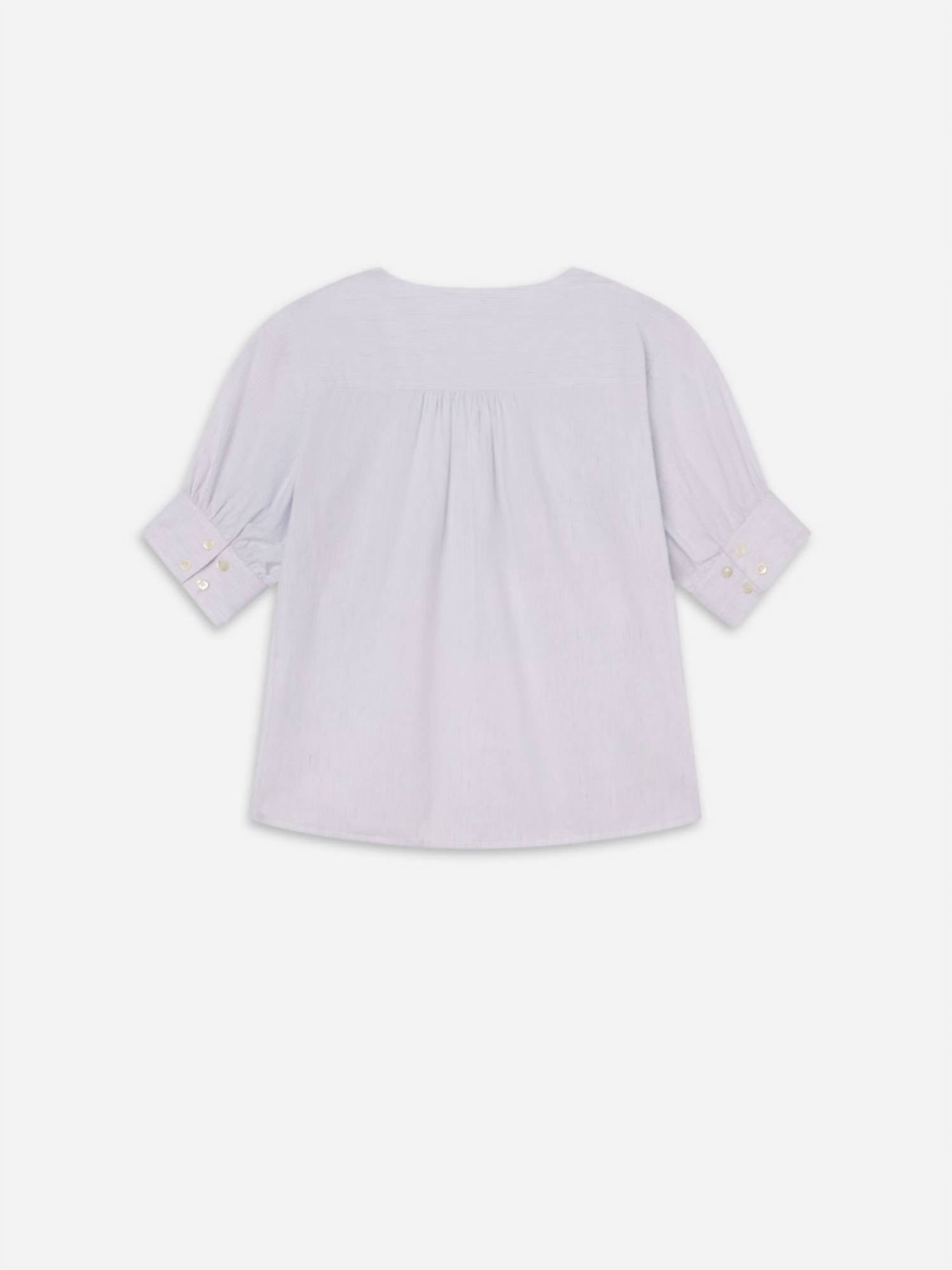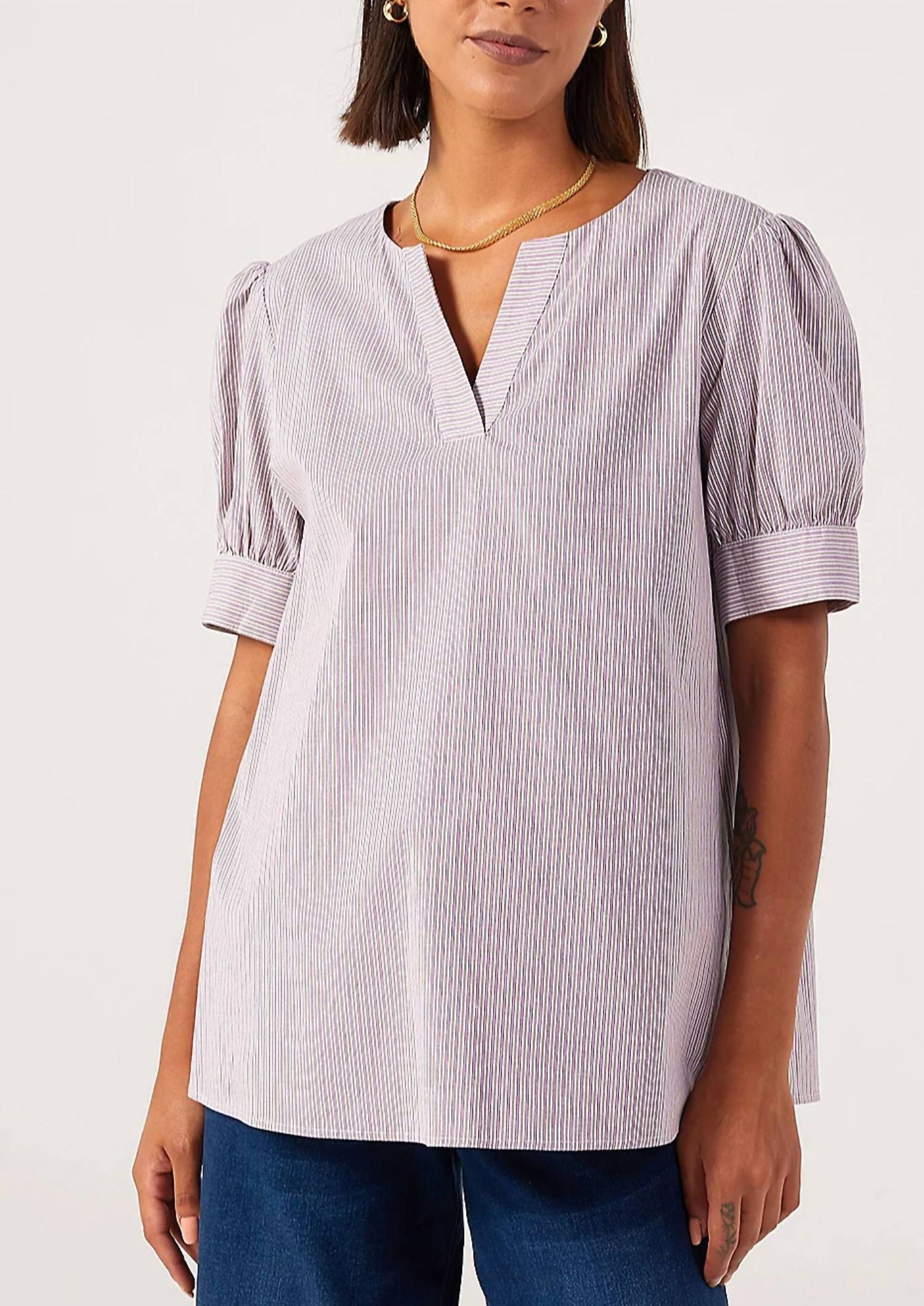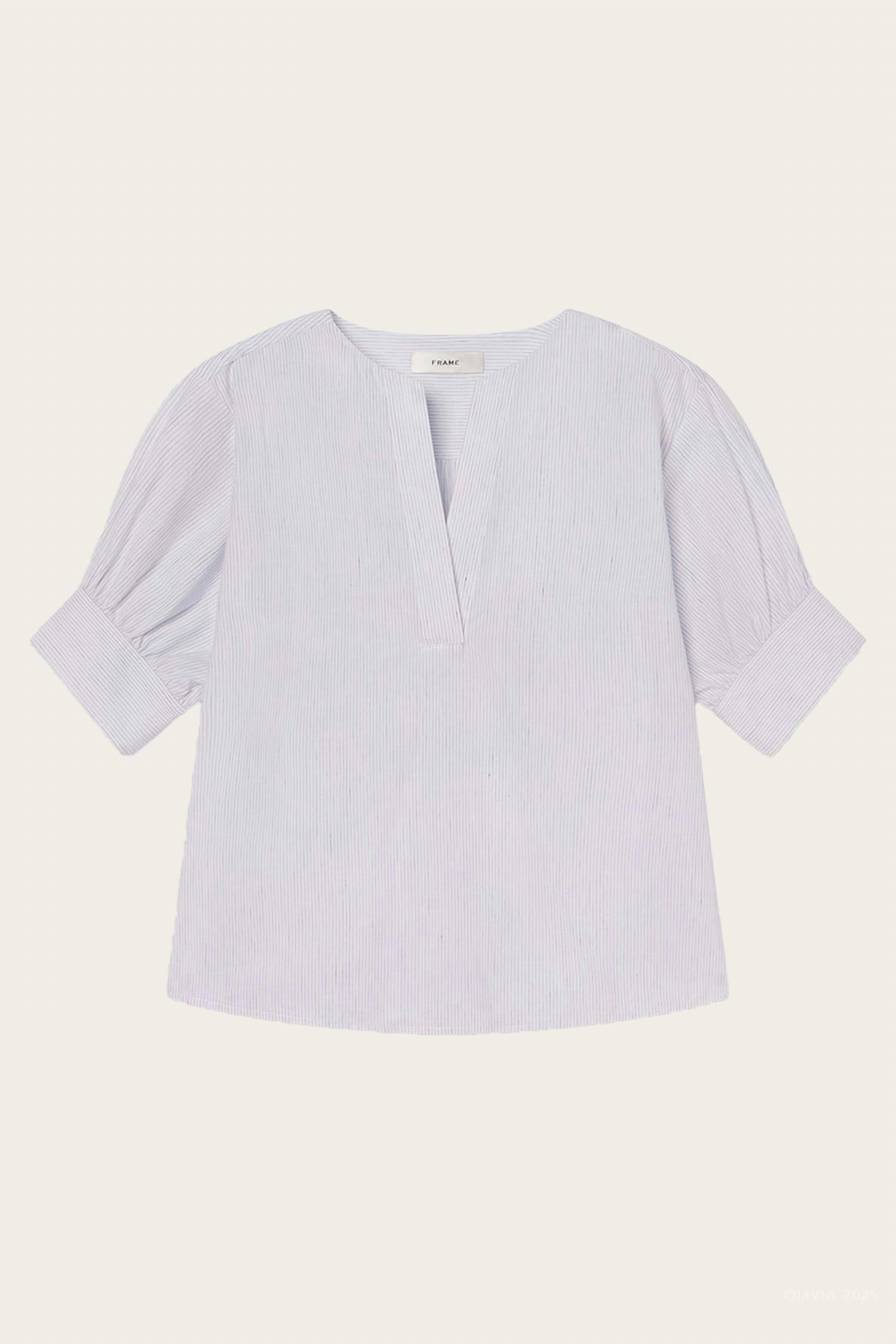 Pair this with your favorite jeans and slides for your next girls night out. Introducing the V-Neck Popover Top by FRAME, a chic addition to your wardrobe in a captivating Steel Blue Multi stripe design. This blouse features short sleeves and a comfortable v-neckline, perfect for versatile styling. Crafted with a blend of 89% Cotton and 11% Linen, it is breathable and ideal for spring workwear. Imported from skilled manufacturers, this pull-on style is easy to maintain: machine wash and line dry.