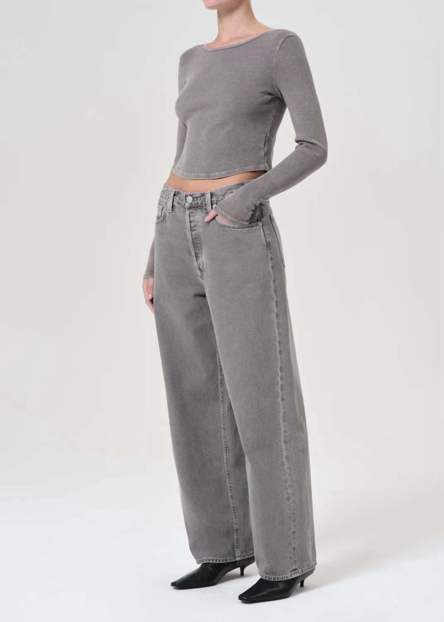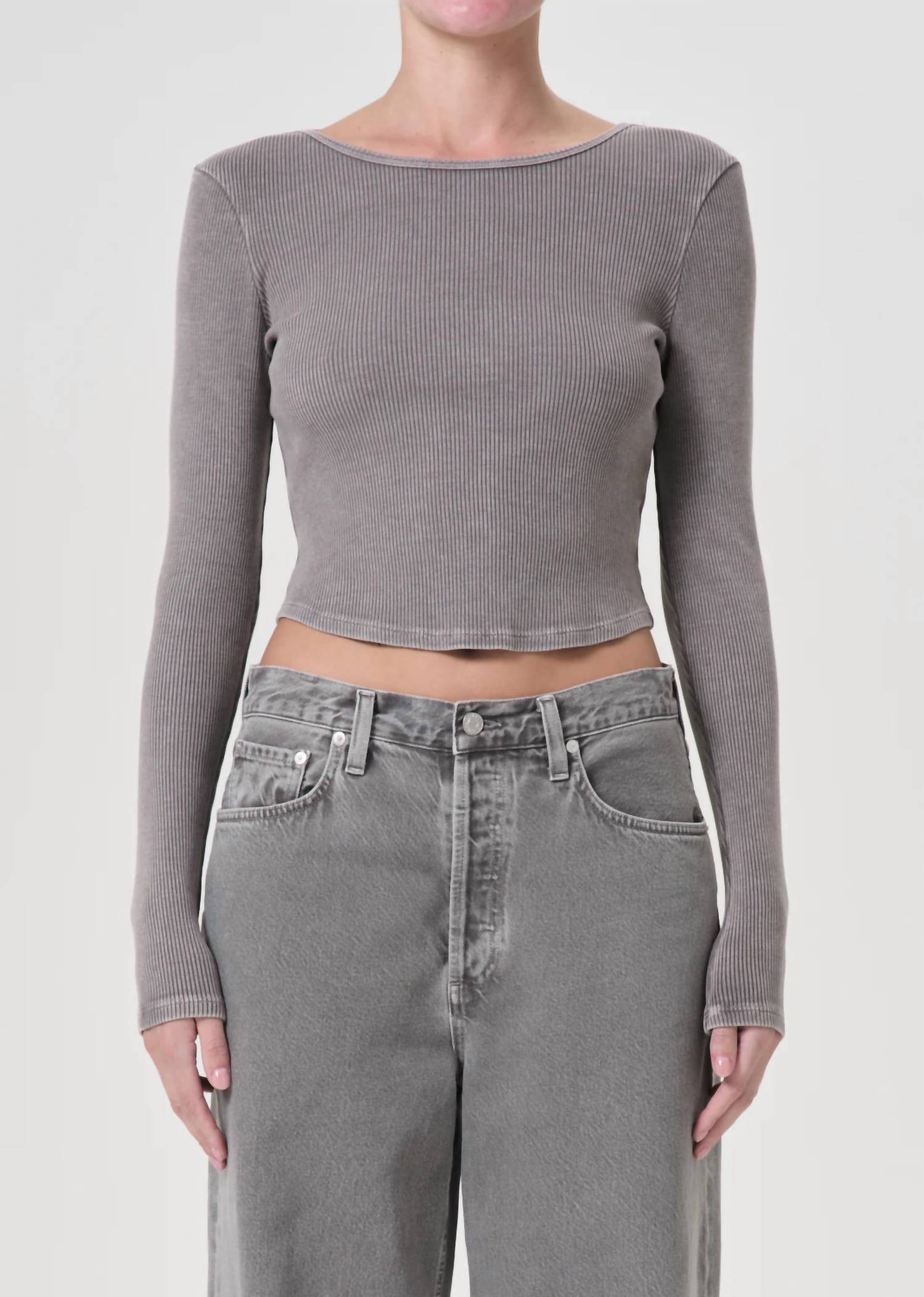 The perfect long sleeve tee that goes with just about anything. Introducing the Nova Long Sleeve Tee by AGOLDE, a travel-friendly essential in a stylish Owl hue. Crafted with a cotton blend, this top features a crewneck design and textured pattern, offering a vintage, washed-out grey look. The curved, cropped hem and form-fitting rib accentuate your silhouette, measuring 19.5 inches in length. Composition: 49% Organic Cotton, 49% Tencel, 2% Spandex. Closure: Pull-on style. Care: Machine wash cold. Model is 5'10" and wearing a size Small.