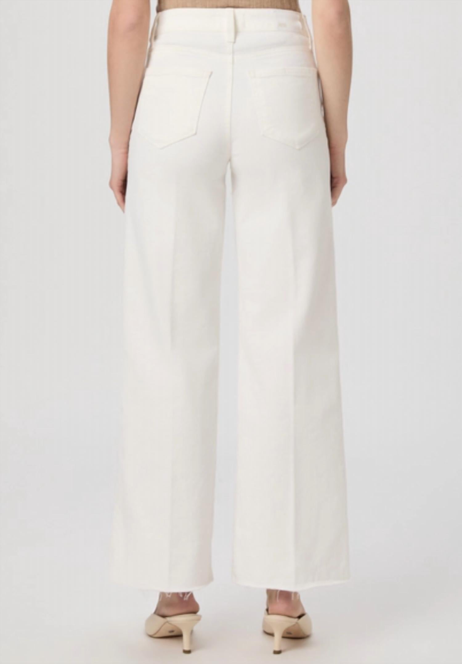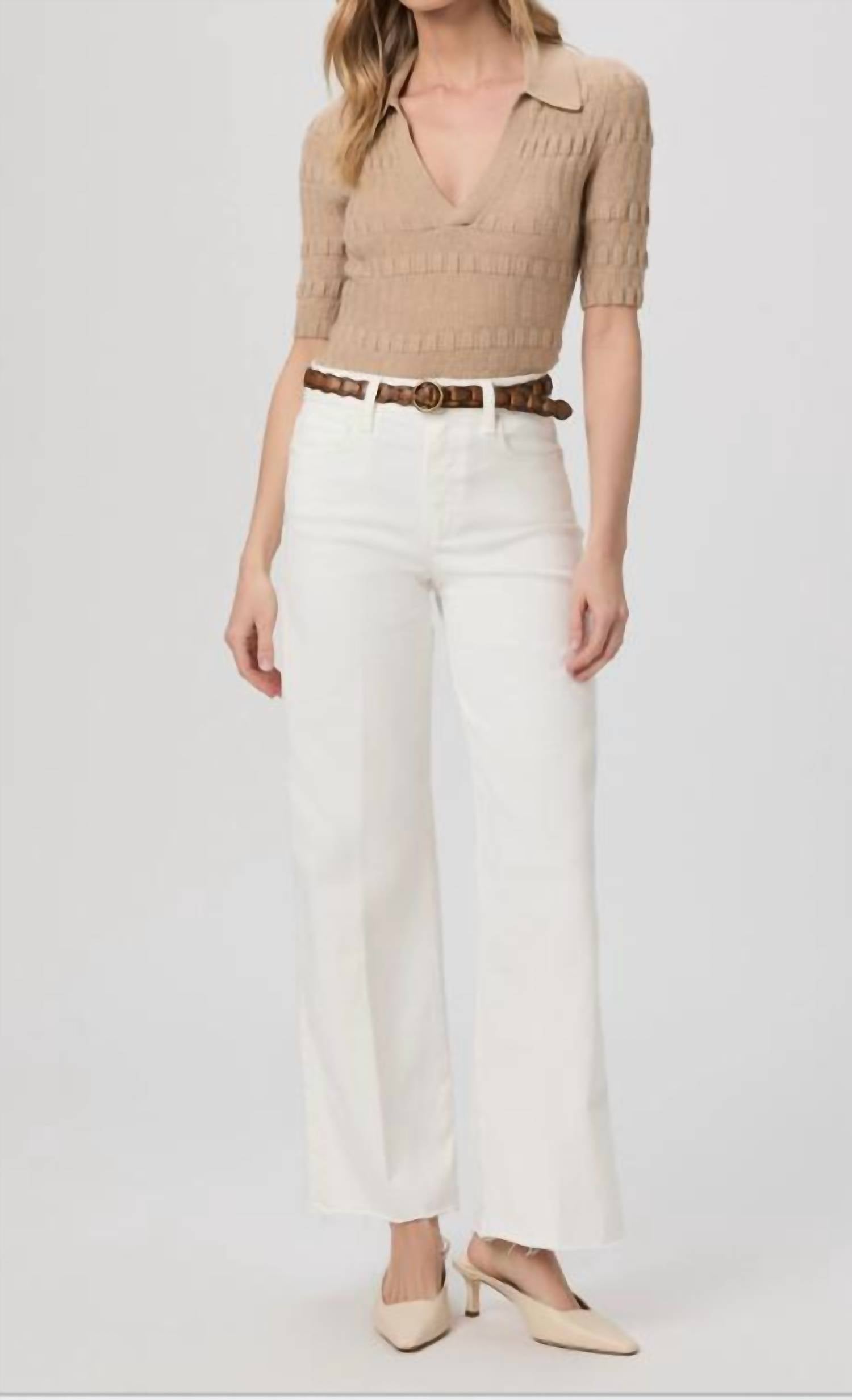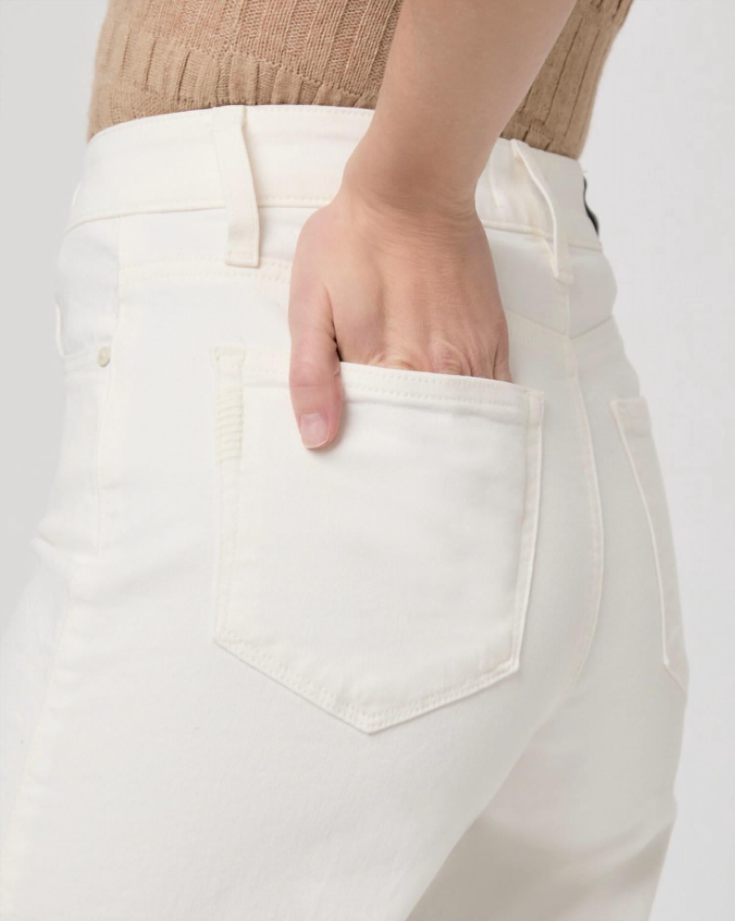 A flattering silhouette that's suprisingly versatile. This high-waisted wide leg has a slightly relaxed fit with a raw hem and a 31” inseam. Crafted in comfort stretch tonal ecru denim with matching tonal ecru hardware, this pair has plenty of coverage and the perfect amount of stretch.