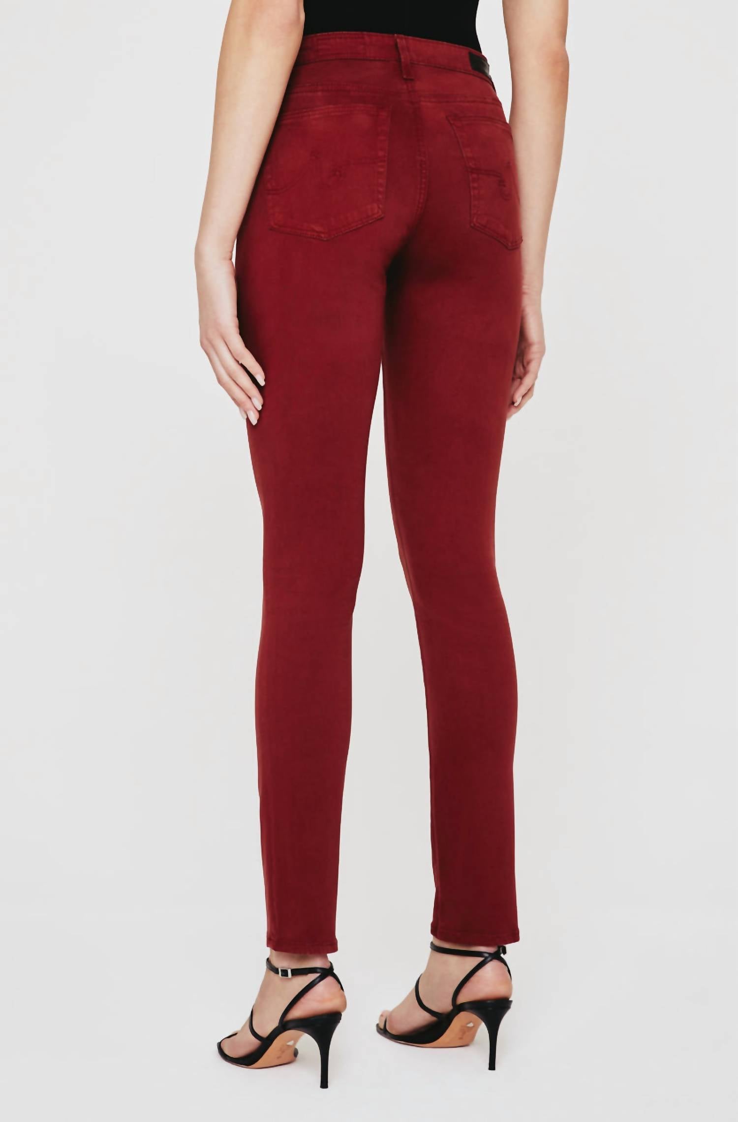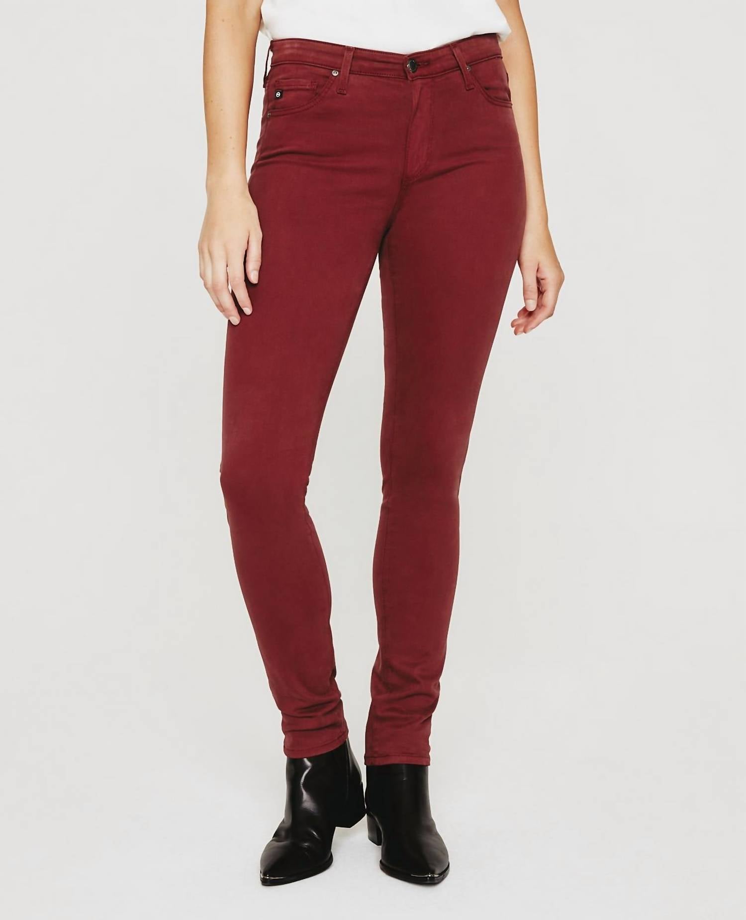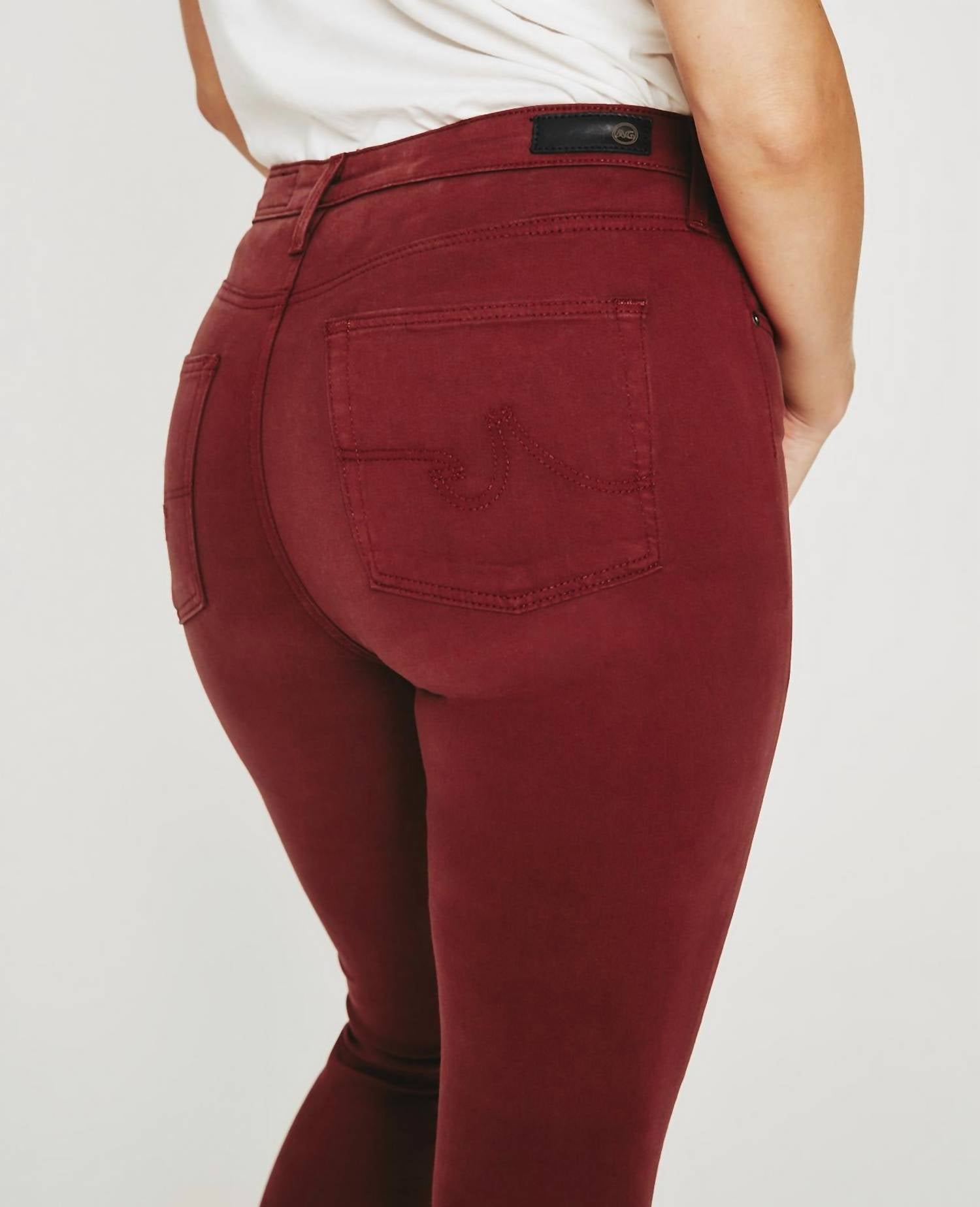 A skinny jean that is both flatering and comfortable. We love this style because it works great with boots, or without! Discover the Prima Denim High-rise Skinny Jeans by AG Jeans, crafted for a flattering fit in a striking Dark Sangria shade. These women's cigarette pants offer a slim fit with a skinny leg style and are designed in a lightweight 7.8 oz. Luscious Super Stretch Sateen. Composition includes 60% Cotton, 8% Polyester, 30% Modal, and 2% Spandex, providing undeniable comfort and flexibility. Featuring a classic button closure, these solid high-rise jeans are machine washable and can be tumble dried, perfect for a stylish dinner party or a chic 90s-inspired spring look.