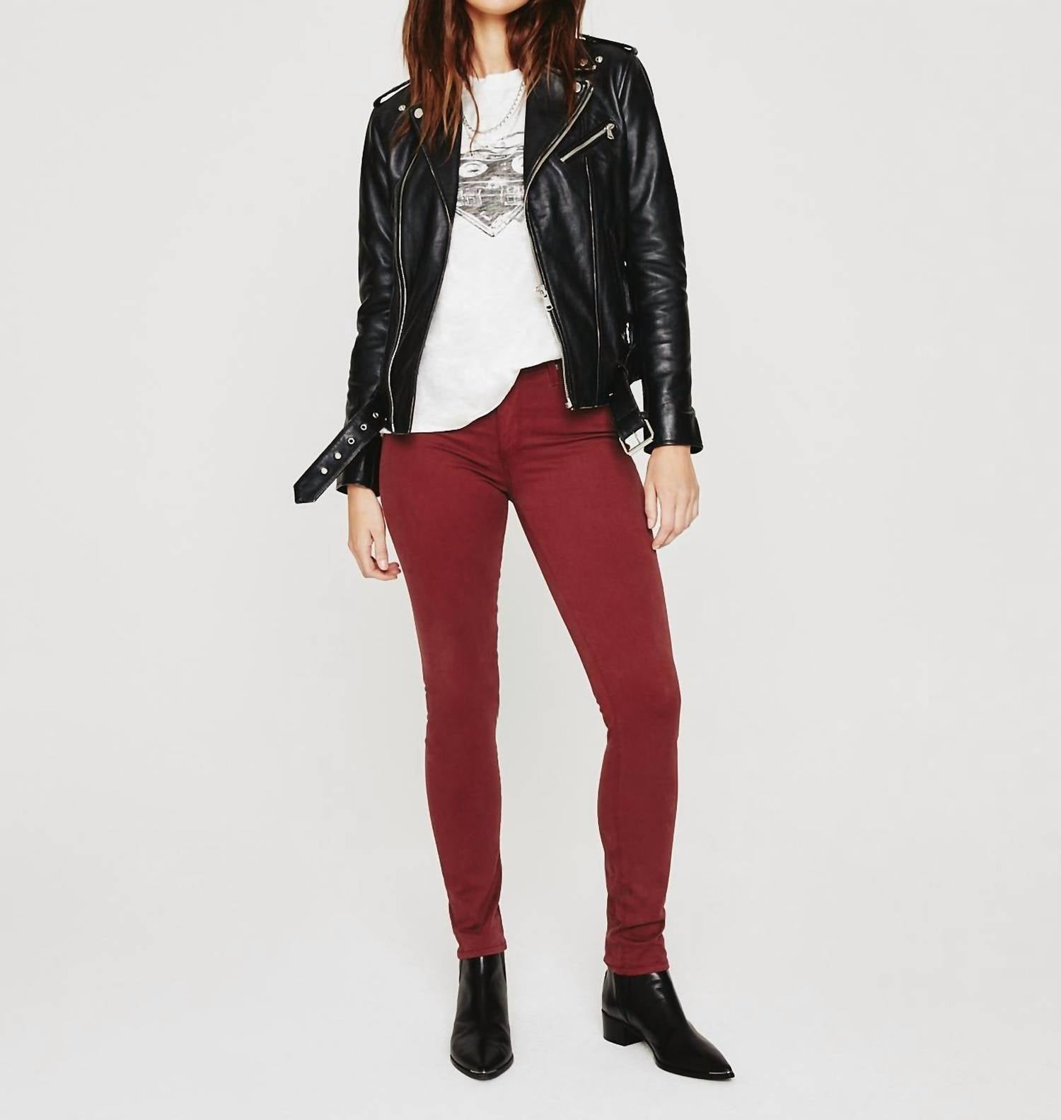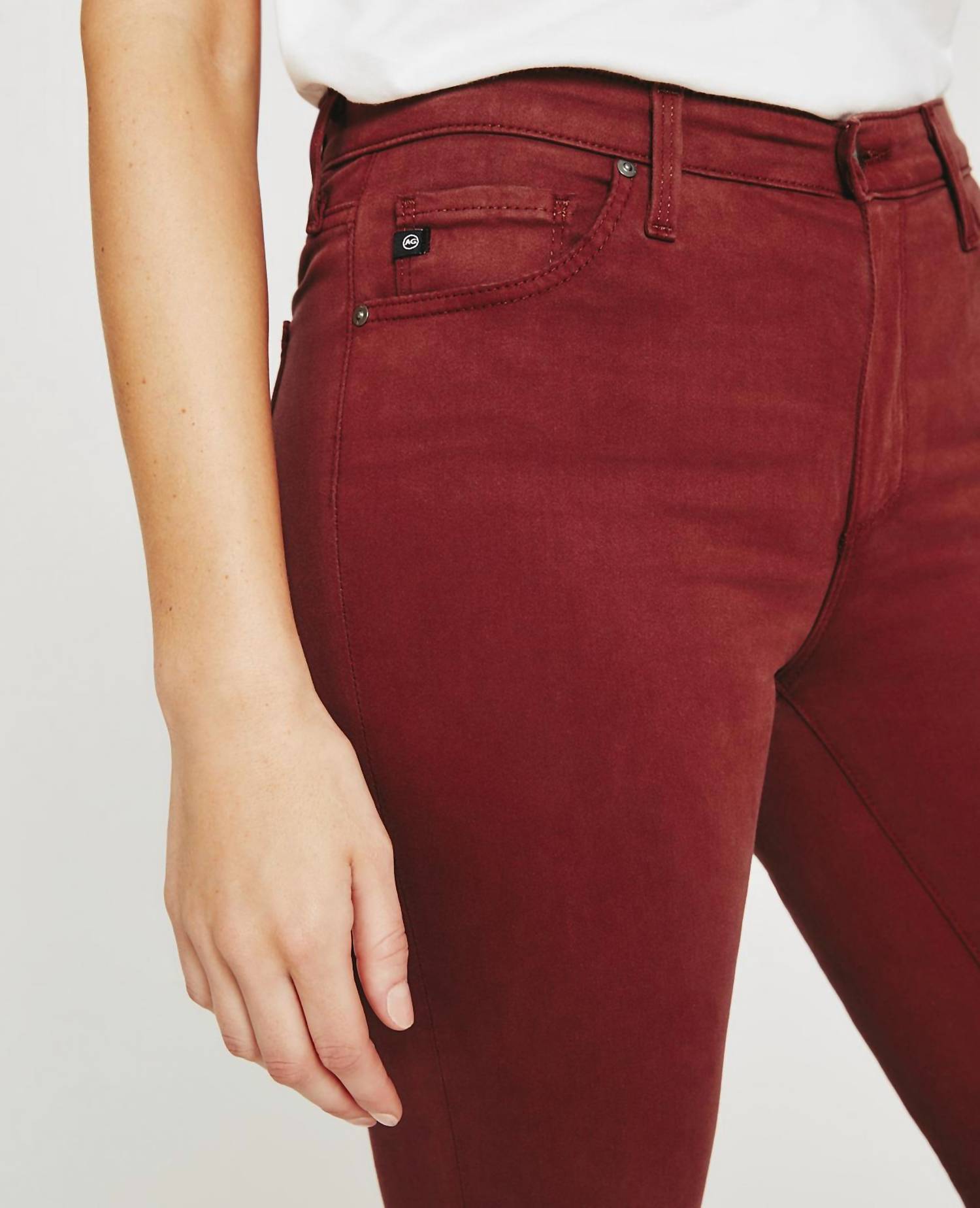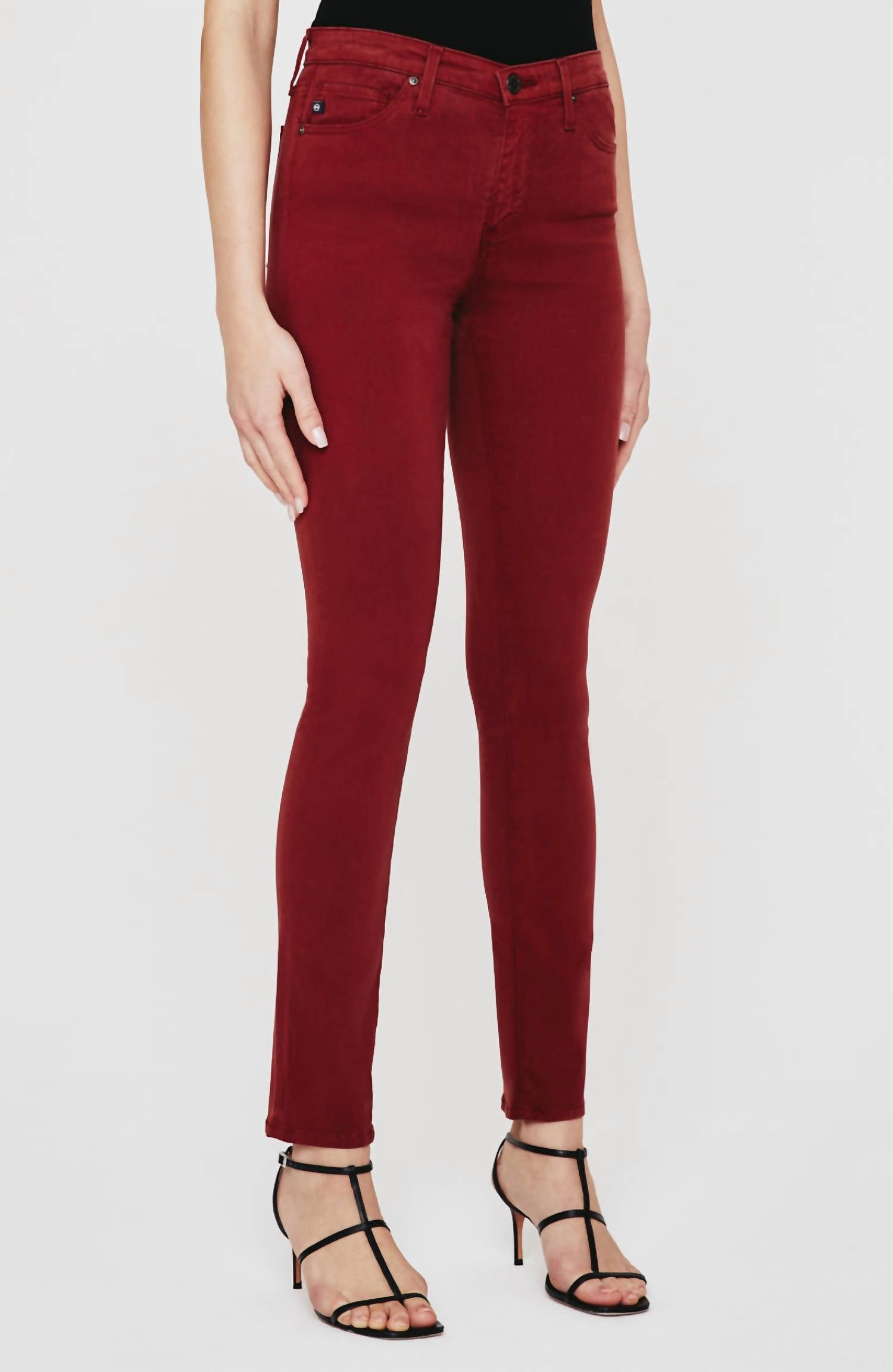 A skinny jean that is both flatering and comfortable. We love this style because it works great with boots, or without! Discover the Prima Denim High-rise Skinny Jeans by AG Jeans, crafted for a flattering fit in a striking Dark Sangria shade. These women's cigarette pants offer a slim fit with a skinny leg style and are designed in a lightweight 7.8 oz. Luscious Super Stretch Sateen. Composition includes 60% Cotton, 8% Polyester, 30% Modal, and 2% Spandex, providing undeniable comfort and flexibility. Featuring a classic button closure, these solid high-rise jeans are machine washable and can be tumble dried, perfect for a stylish dinner party or a chic 90s-inspired spring look.
