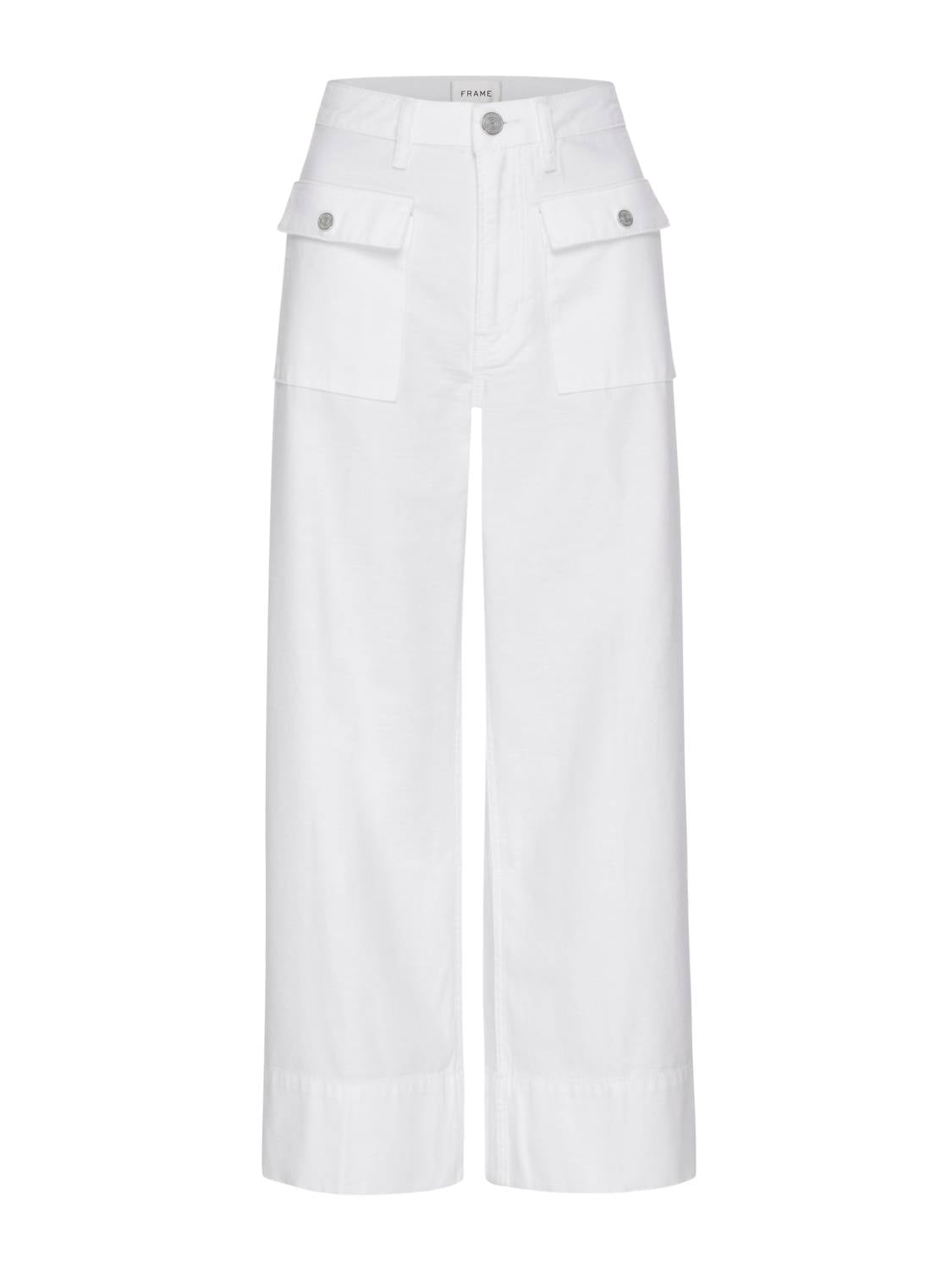 Pair these straight leg jeans with flats, sandals or even heels! You can't go wrong. Elevate your wardrobe with the Women's 70s Patch Pocket Raw Straight Jean by FRAME, perfect for the style-conscious woman. These white straight-leg pants feature a high rise and relaxed fit, offering a flattering silhouette and trendy cropped length ideal for spring. With front patch pockets and a button closure, they capture the essence of '70s workwear fashion, making them both functional and stylish. Perfect for pairing with sandals during your vacations.