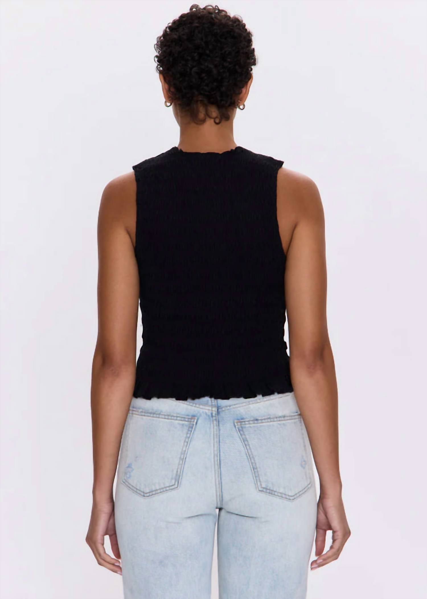 Fit, fabric and functionality. This tank top checks all the boxes. Introducing the Pistola Phoebe Smocked Tank in Noir, a chic addition to your wardrobe that is perfect for summer travel. This sleeveless tank is crafted from a 97% Cotton and 3% Spandex blend, offering comfort and a flattering fit with all-over smocking. Designed with a crewneck and featuring a versatile solid pattern, it measures 20" in length and slips on easily with a pull-on closure. Care for this essential piece by hand washing and laying it flat to dry. The model is 5’9” and is wearing a size small.