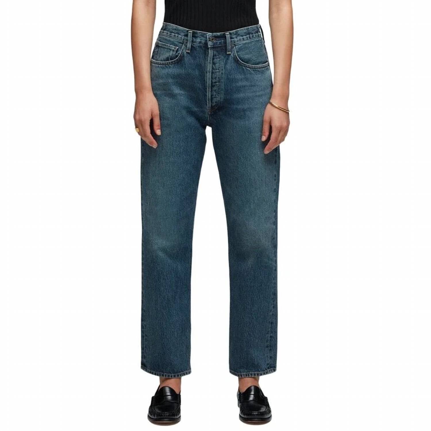 This classic straight leg jean has a perfect fit and goes with just about everything. Introducing the 90s Mid Rise Loose Fit Jeans by AGOLDE, crafted for timeless style in Portrait Blue. These straight-leg jeans boast a relaxed fit and a mid-rise designed to sit comfortably on the waist. Made from 100% regenerative cotton with a clean, undistressed hem, they embody sustainable style. Features include button closure and practical pockets, ensuring functionality. Machine wash and tumble dry.