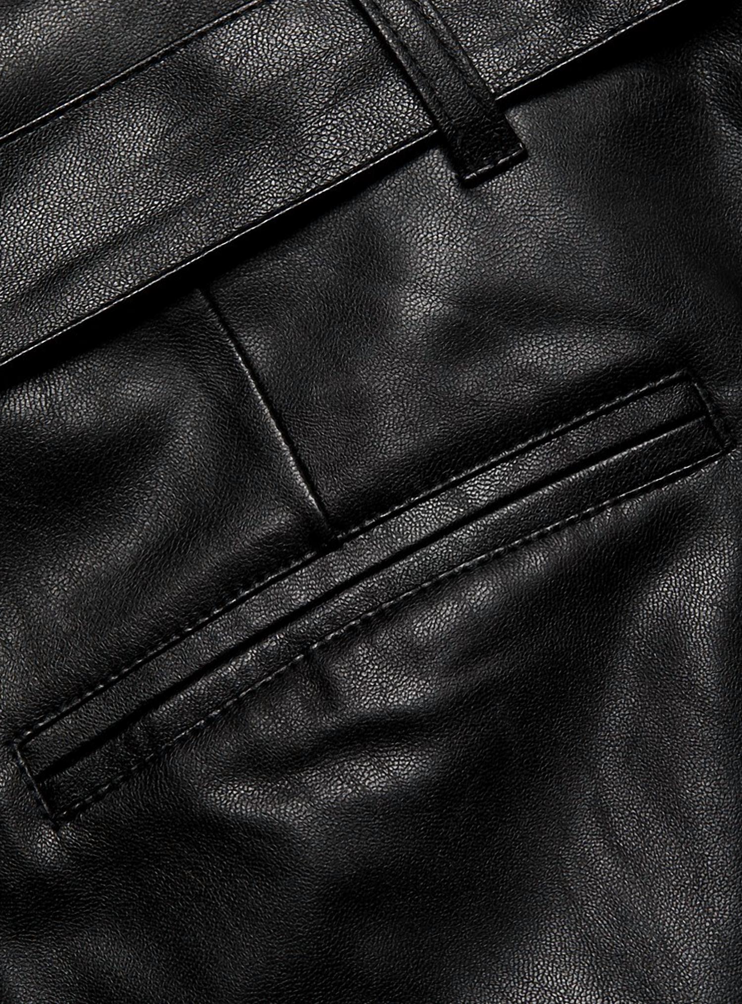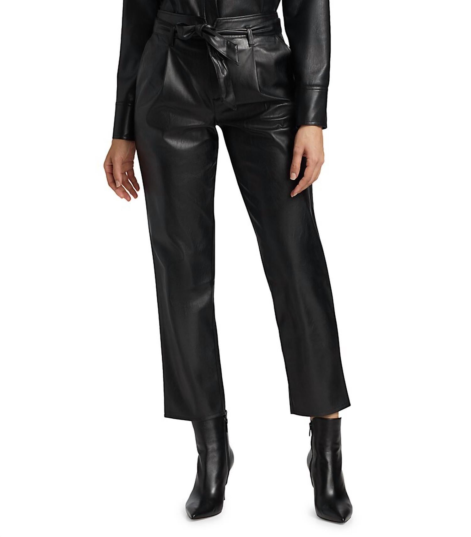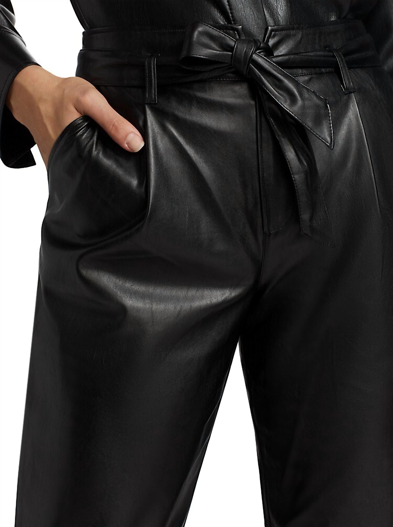 Faux leather pants topped with a high-rise waist, tie front, and seam pockets. Pleated waist with optional self-belt. Snap at waist and zip fly. Slant hip and welt back pockets. Inseam, about 26". Machine Wash.