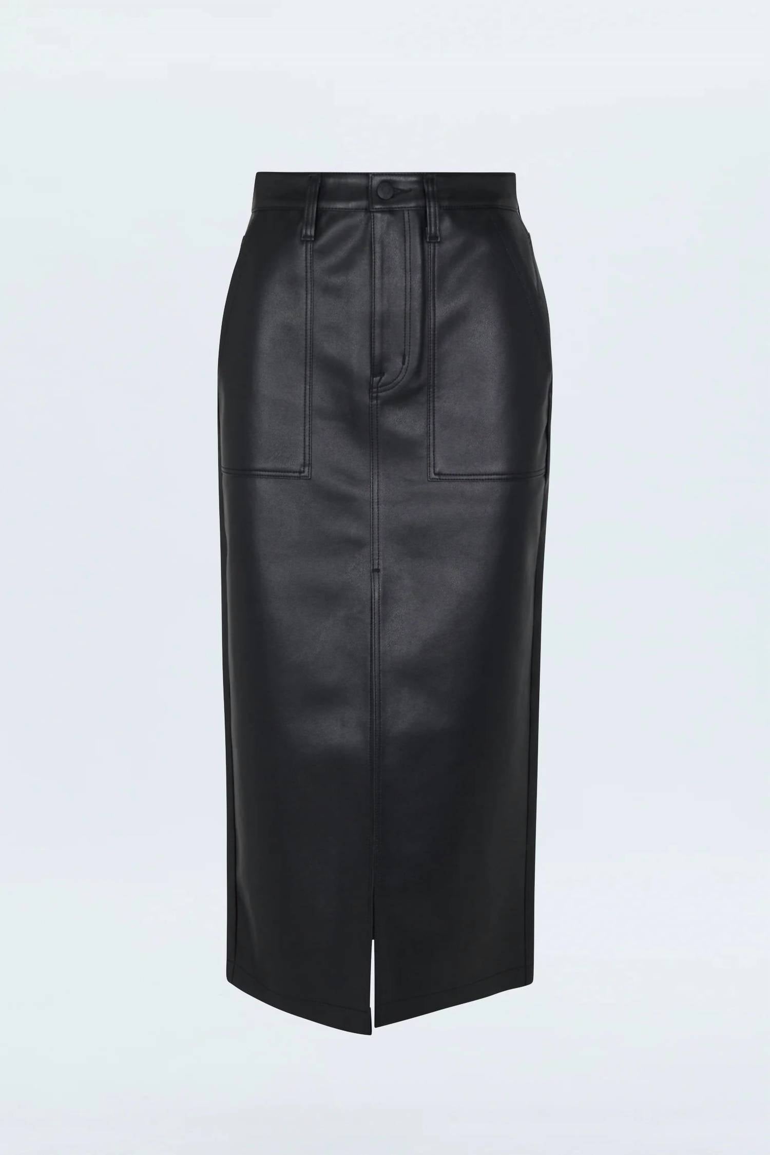 The midi length skirt is here to stay and we especially love this style. Upgrade your style with the Vegan Leather Utility Skirt by PISTOLA, featuring a chic black midi length and a fashionable 37 inches. Crafted from 100% Polyurethane, this skirt offers a luxurious faux leather look, complete with a five-pocket denim-inspired design. It's made with a front skirt slit for ease of movement and a convenient zip closure. For care, simply machine wash when needed.