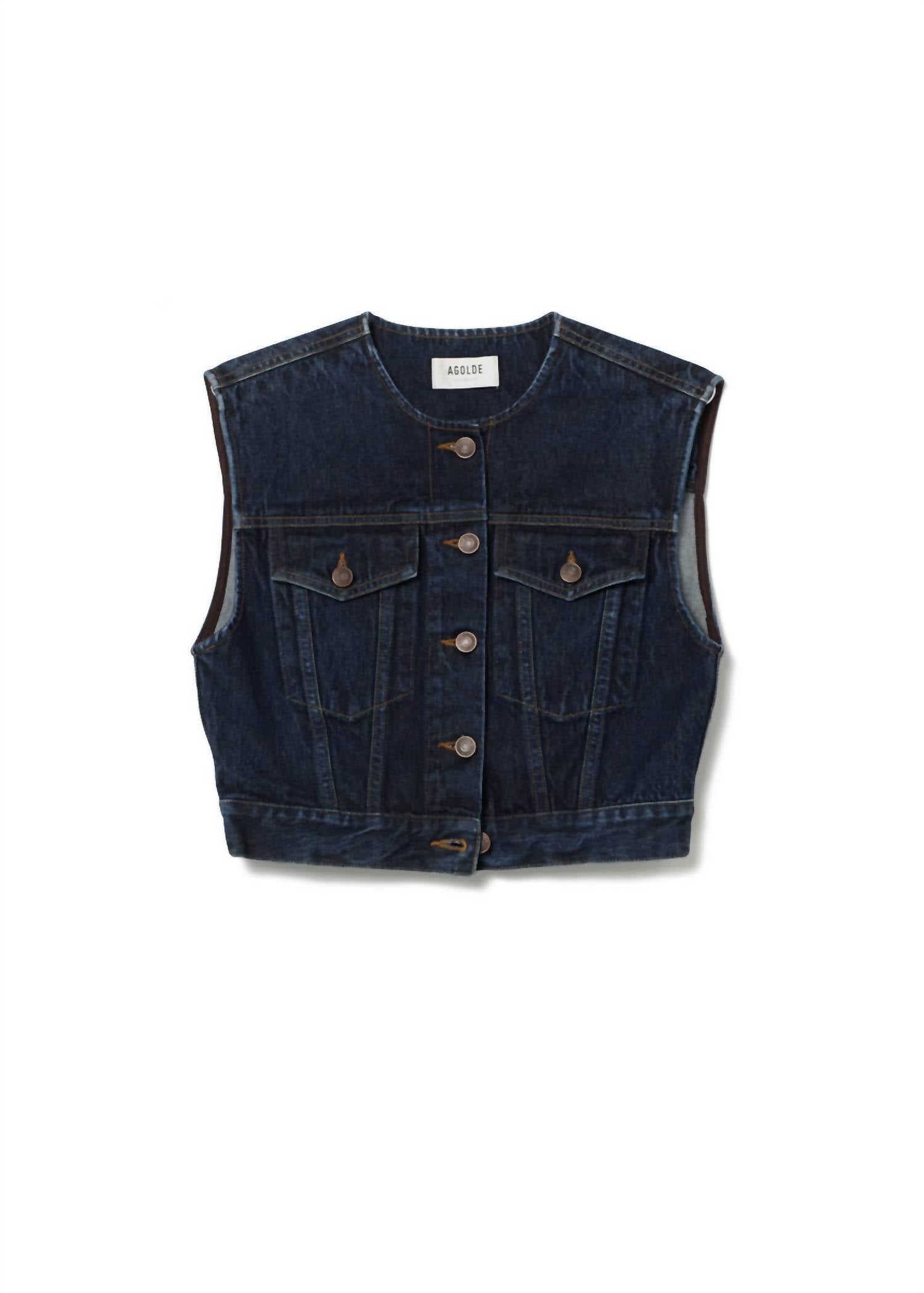 This structured, collarless denim vest has a close, cropped fit. It features classic denim jacket details such as a button-front closure and flap chest pockets. Made from 100% regenerative cotton. Machine wash cold. Made in Turkey.