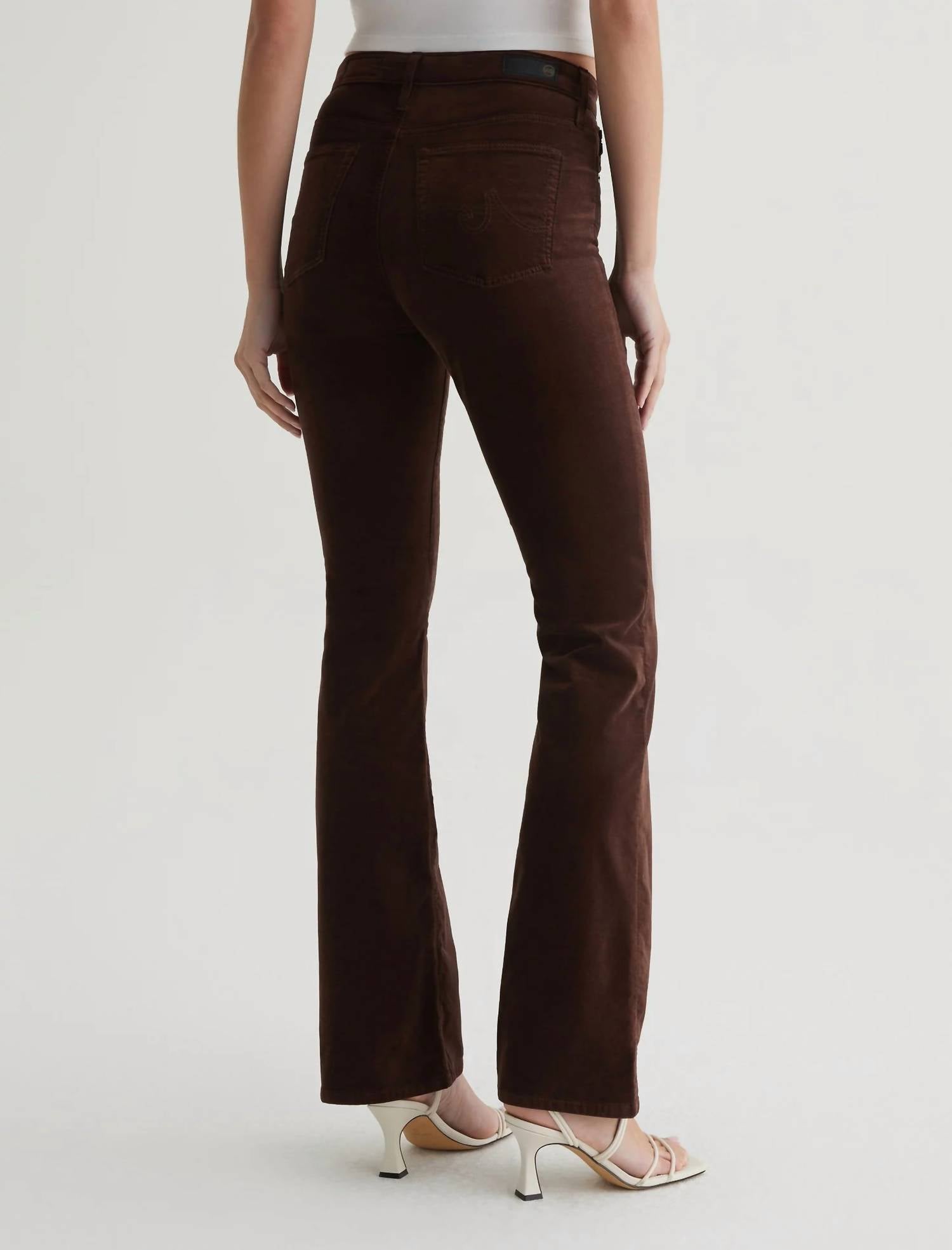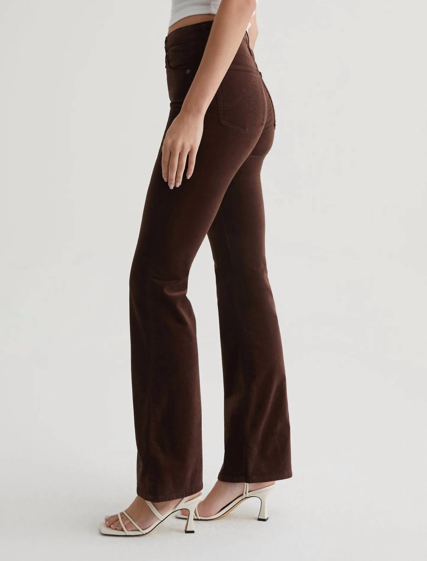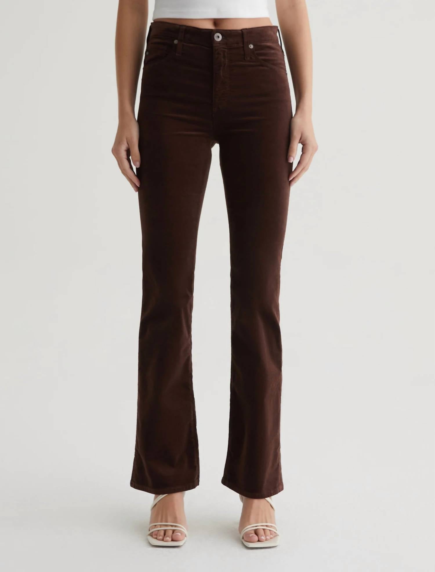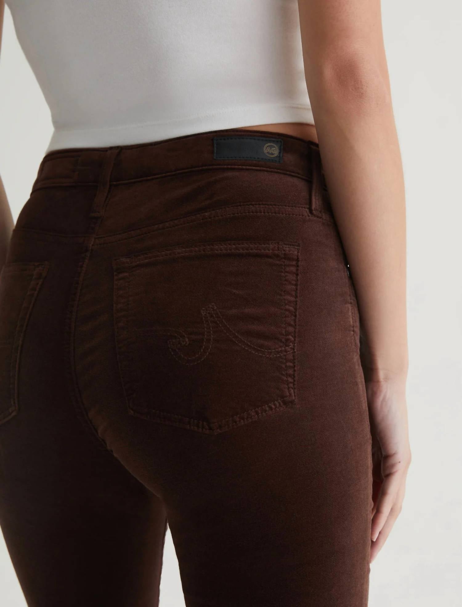 High-waist is here to stay and we especially love this style. Elevate your wardrobe with the Farrah Boot High Rise Boot Jeans by AG Jeans, designed for women seeking style and comfort. These jeans feature a high-rise waist and a regular straight leg fit, crafted from 7.5 oz. Opulent Stretch Velvet in a solid Bitter Chocolate shade. Made with a cotton blend, this piece ensures a flattering silhouette with a skinny fit through the leg, opening into a subtly flared hem. Closure: Button closure. Care: Machine wash, tumble dry. Key measurements include a 10" rise, 14" knee opening, 18.5" bottom opening, and a 32" inseam.