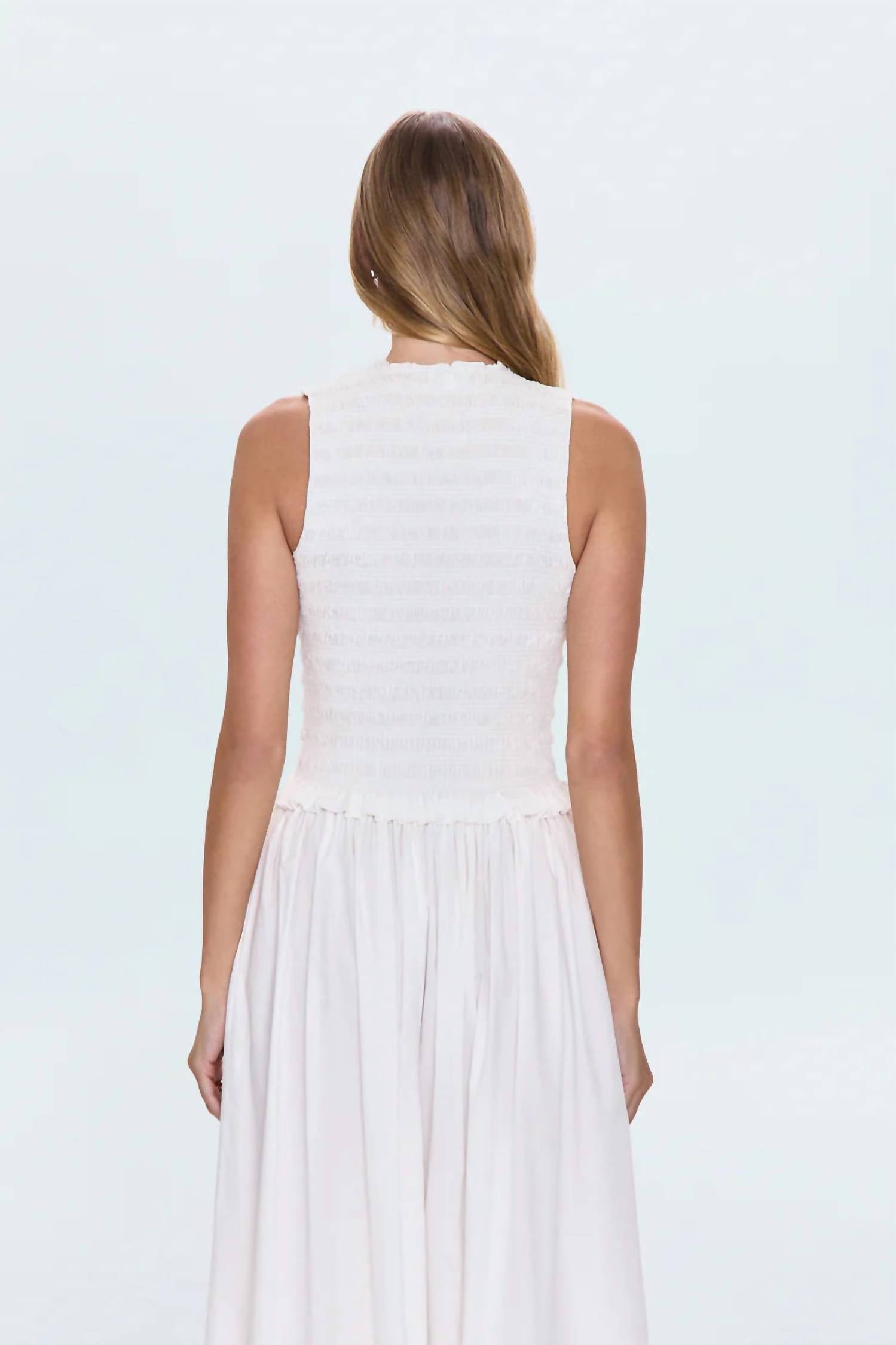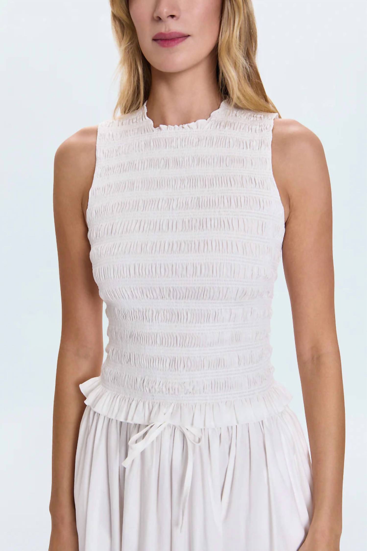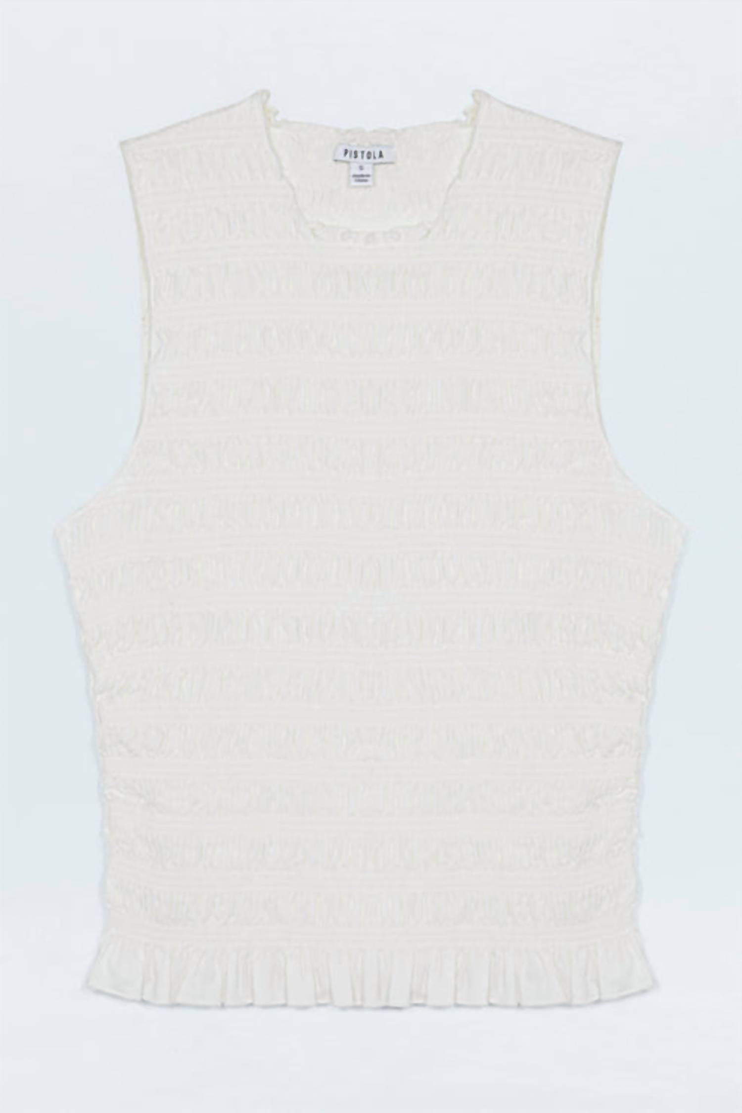 The perfect tank top for those warmer weather seasons. Introducing the Phoebe Smocked Tank Top by PISTOLA, a chic addition to any wardrobe in the elegant Le Blanc shade. This sleeveless design, featuring a cotton blend composition of 97% Cotton and 3% Spandex, offers a textured, flattering fit through all-over smocking. With a 20-inch length, this imported top is perfect for minimalist summer style, ideal for travel and Easter occasions. Closure: Pull-on. Care: Machine wash cold.