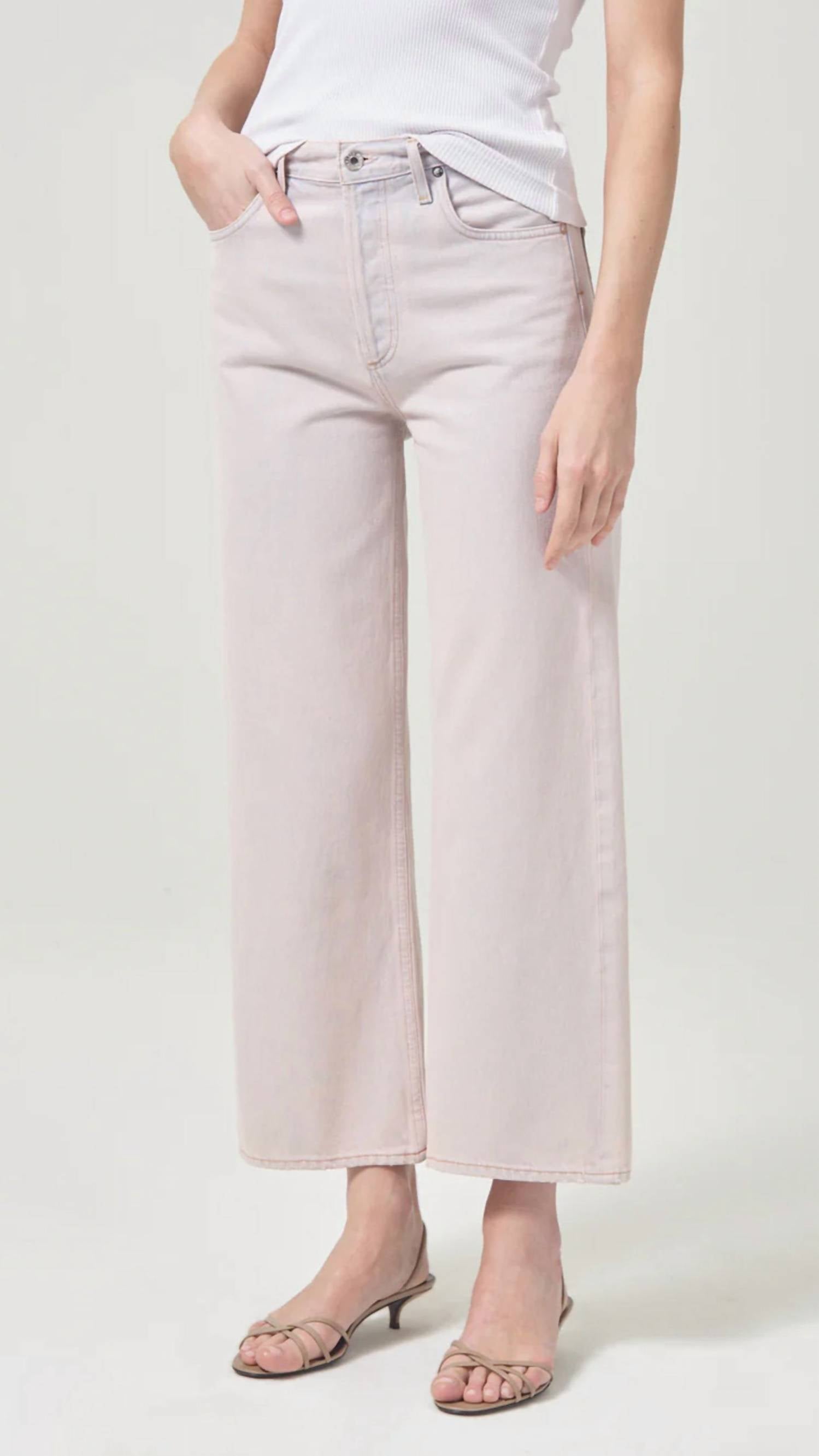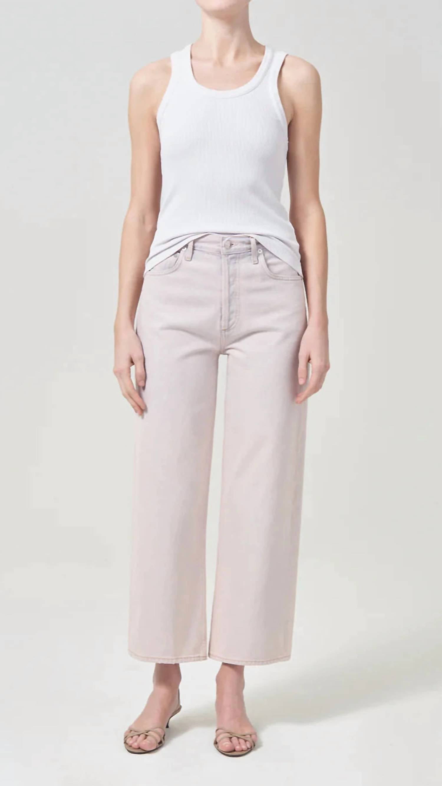 High-waist is here to stay and we especially love this style. Experience effortless style with the AGOLDE Ren High Rise Wide Leg Jeans, crafted from 100% regenerative cotton for a smooth, zero-stretch feel. Flaunting a flattering high-rise waist and relaxed fit through the hips, these blush pink jeans feature a wide-leg silhouette and finished hems. With a button closure, these jeans offer a 12.25" rise, 27.5" inseam, and 19.5" leg opening. Care for them easily with hand wash in cold water and lay flat to dry. Modeled in size 26, the first photo shows the fit on a model with measurements: 5'7.5" height, 34.5" bust, 29" waist, and 38" hips.