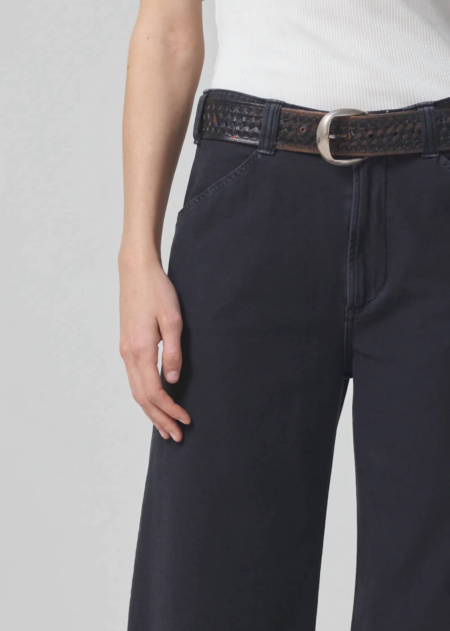 The Paloma Utility Trouser by Citizens of Humanity is a chic addition to your wardrobe, offered in a clean washed black shade. These trousers feature a high-rise waist with a relaxed fit and a voluminous wide leg, having a rise of 12 1/4" and an inseam of 32". Made from 100% midweight rigid cotton twill, these trousers are crafted in Turkey and come with a convenient zip closure. Care is simple, with machine wash cold inside out and tumble dry low instructions, ensuring easy maintenance for your busy lifestyle. Model is 5'10" and wears a size 27.