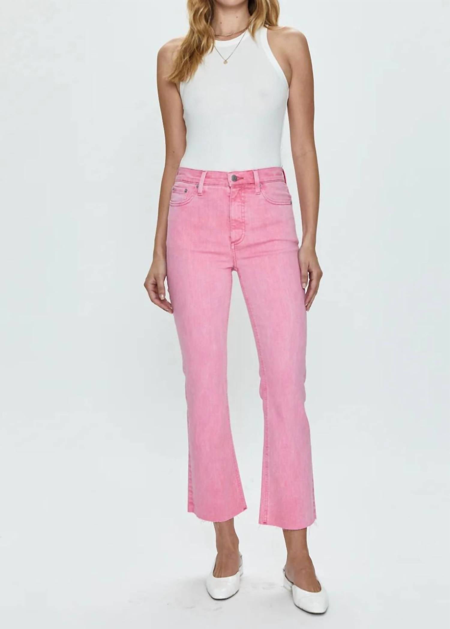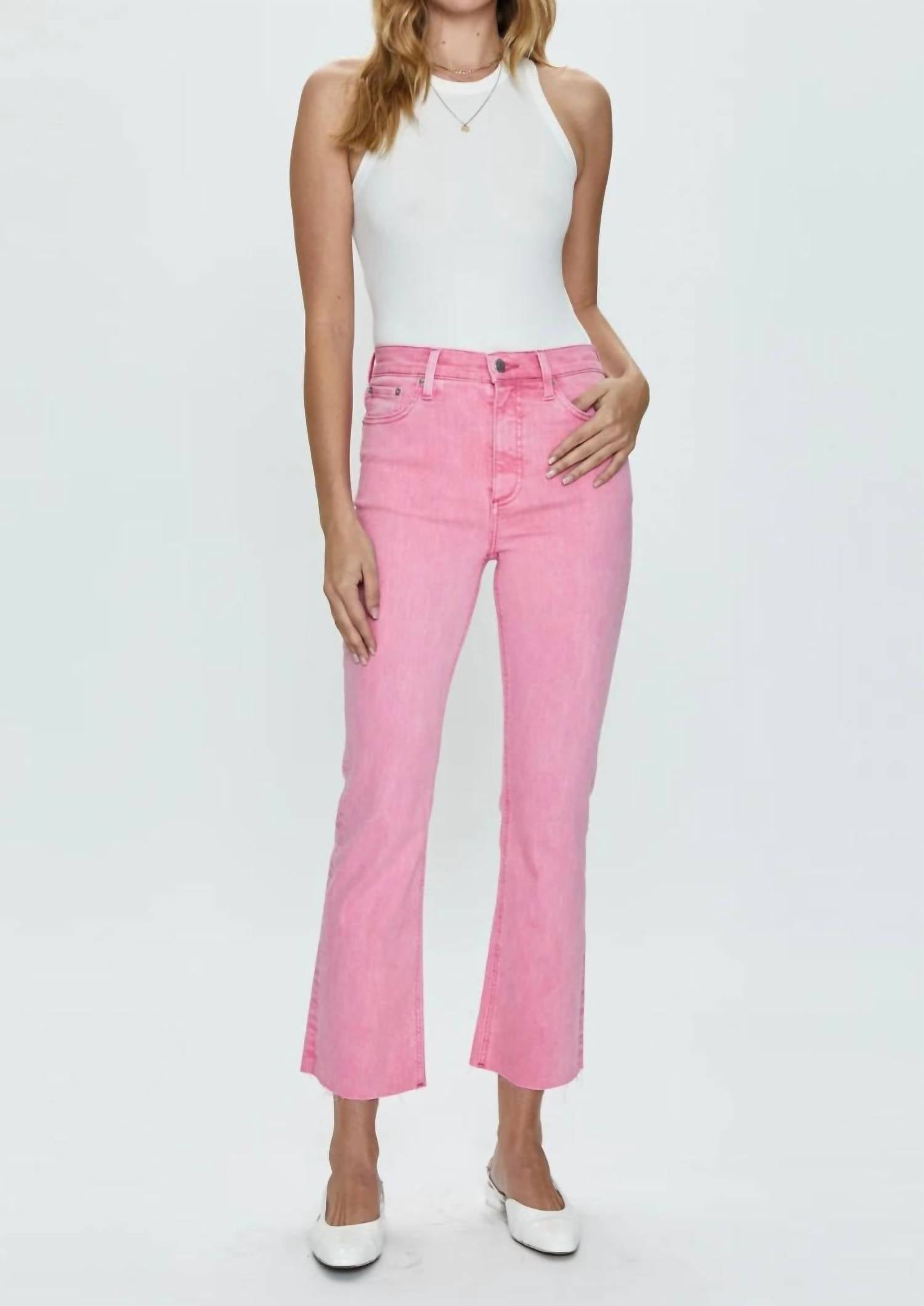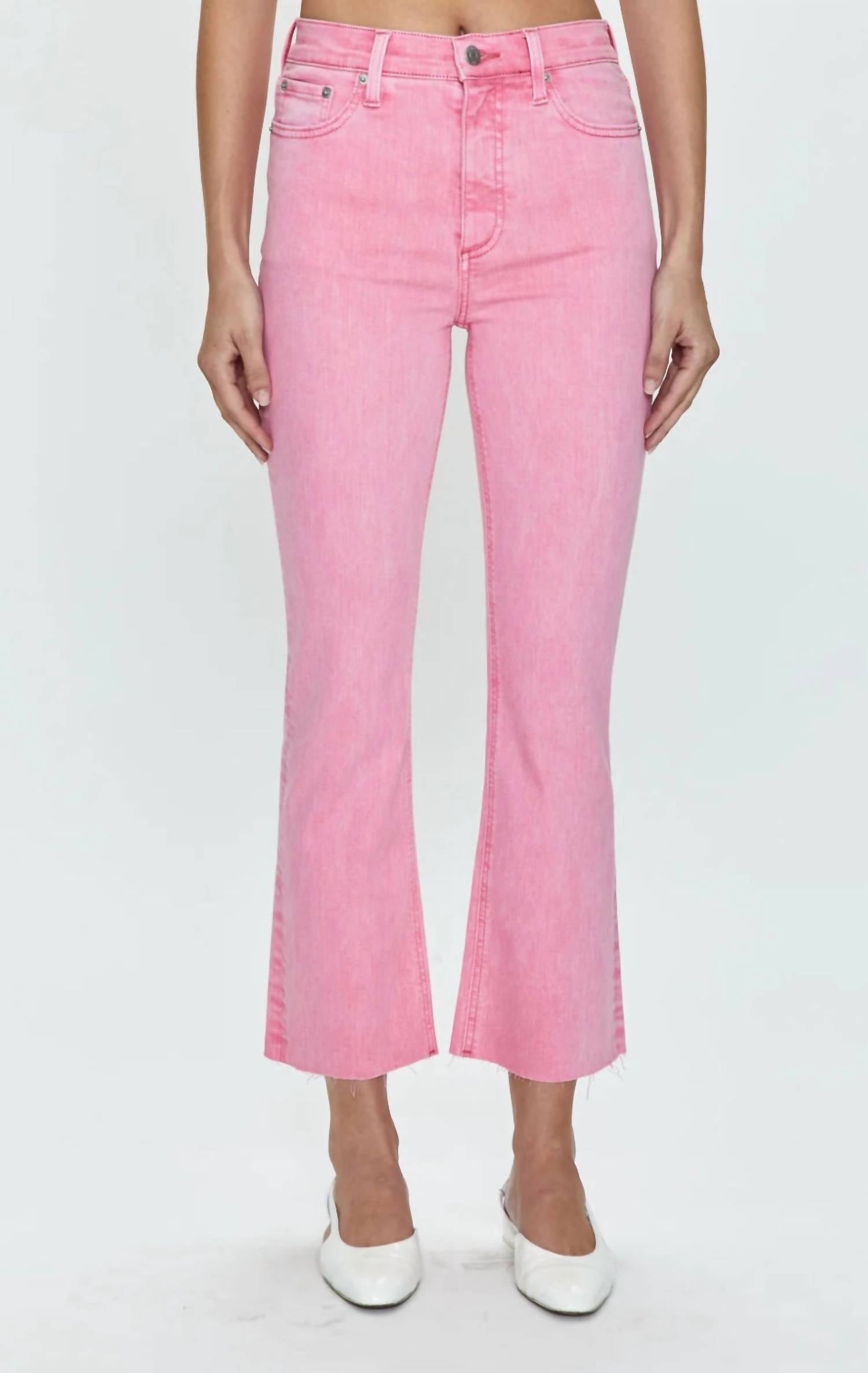 Just add boots! Chic blend of style and comfort in a captivating pink hue. Feature a bootcut leg and a high-rise waist that flares at the ankle, with playful shark bite hems and light distressing on the thigh. Crafted from 94% Cotton, 5% Polyester, and 1% EST. Closes with a button for a secure fit. For care, machine wash cold and tumble dry. With a rise of 10.5" and an inseam of 27", it's perfect for showcasing statement shoes.