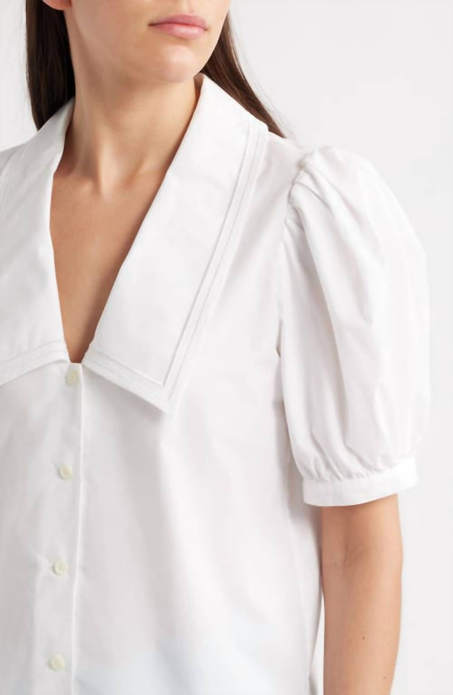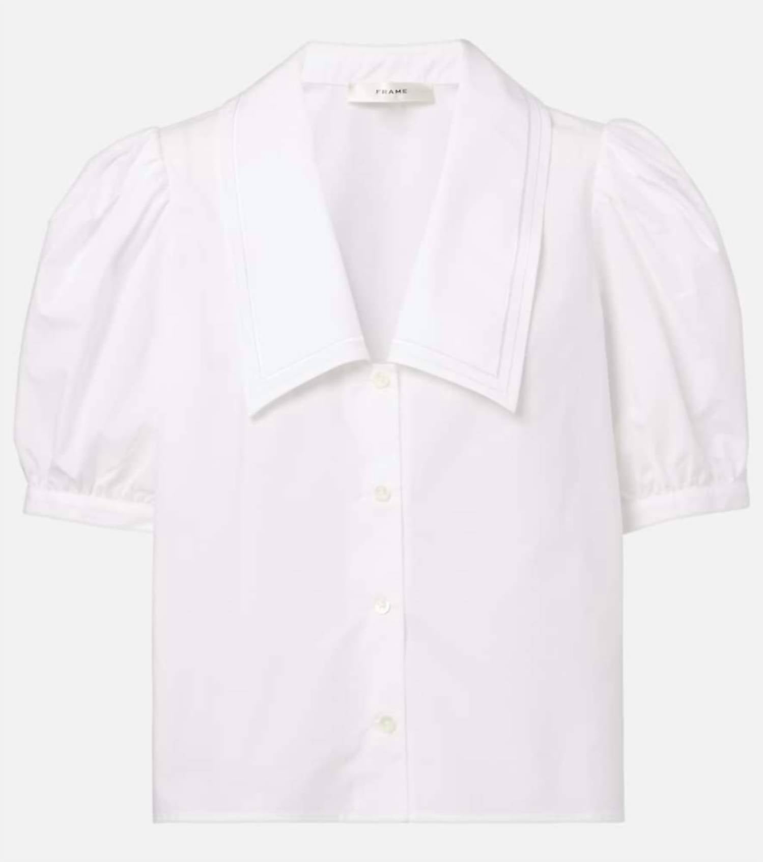 A timeless blouse that will never go out of style. Elevate your wardrobe with the FRAME Sailor Puff Sleeve Blouse, a chic addition perfect for spring parties and holiday festivities. This white short-sleeve blouse is crafted from 100% cotton, featuring an oversized collar and a captivating V-neckline. With pleated sleeves and a romantic silhouette measuring 22.375 inches in length, this piece offers a feminine, minimalist appeal. Closure: Button closure. Care: Dry clean only.