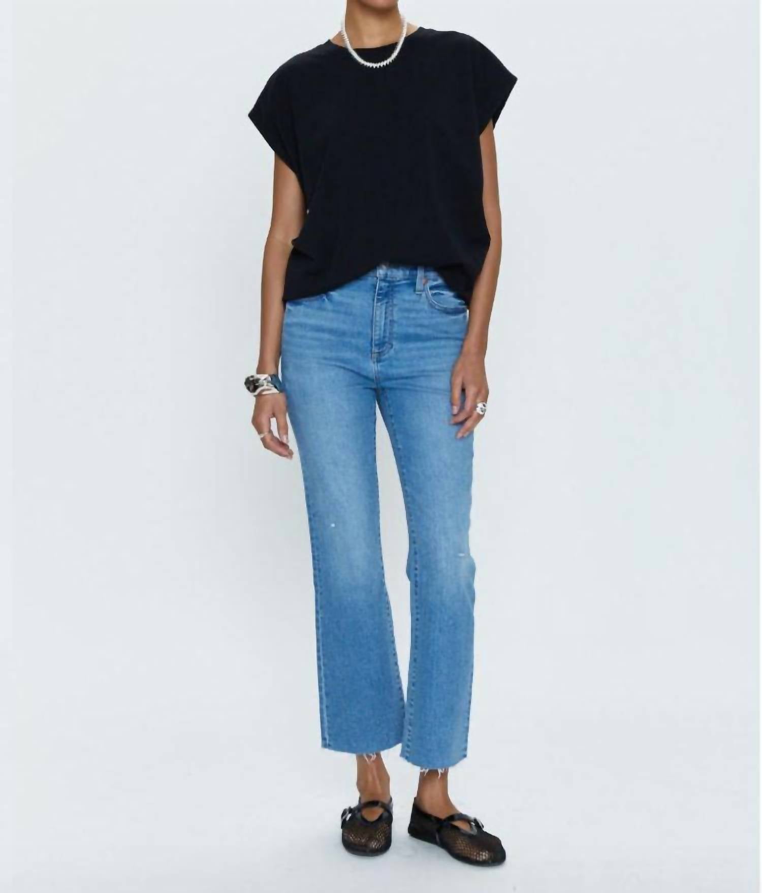 Tuck your favorite tee into these high-waist jeans for a more casual-cool feel. Step into effortless style with the Pistola Women's Light Wash High-rise Jeans in Langford Vintage. Crafted from a comfortable cotton blend, these high-rise jeans boast a solid pattern with a relaxed fit and classic bootcut leg for that western trend appeal. Designed with practical pockets and a secure button closure, they're perfect for any occasion from casual days to vacation outings. Care is easy with machine wash and tumble dry instructions, making them a functional yet chic addition to your spring wardrobe.
