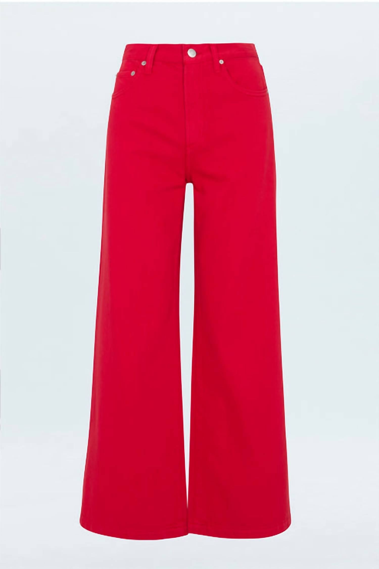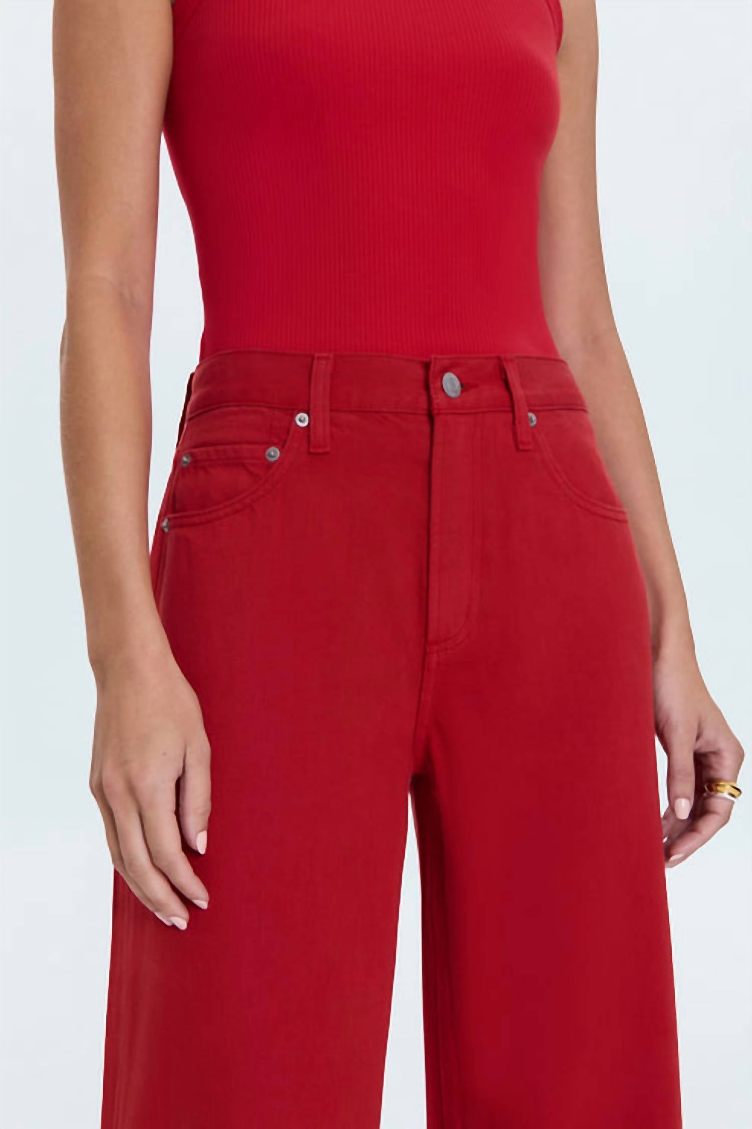 Fit to perfection, we love these high-waist jeans and you will too. Introducing the Jadyn Low Slung Palazzo Jeans by PISTOLA, perfect for achieving that it-girl fit in Samba red. These wide-leg jeans sit low on the hips with a relaxed, palazzo leg silhouette crafted from a lightweight, non-stretch Cotton and Lyocell blend. Featuring a high rise of 11.25 inches and a generous leg opening of 25 inches, these jeans are finished with a 32-inch inseam. Closure: Button closure. Care: Wash cold. For a closer fit, consider sizing down.