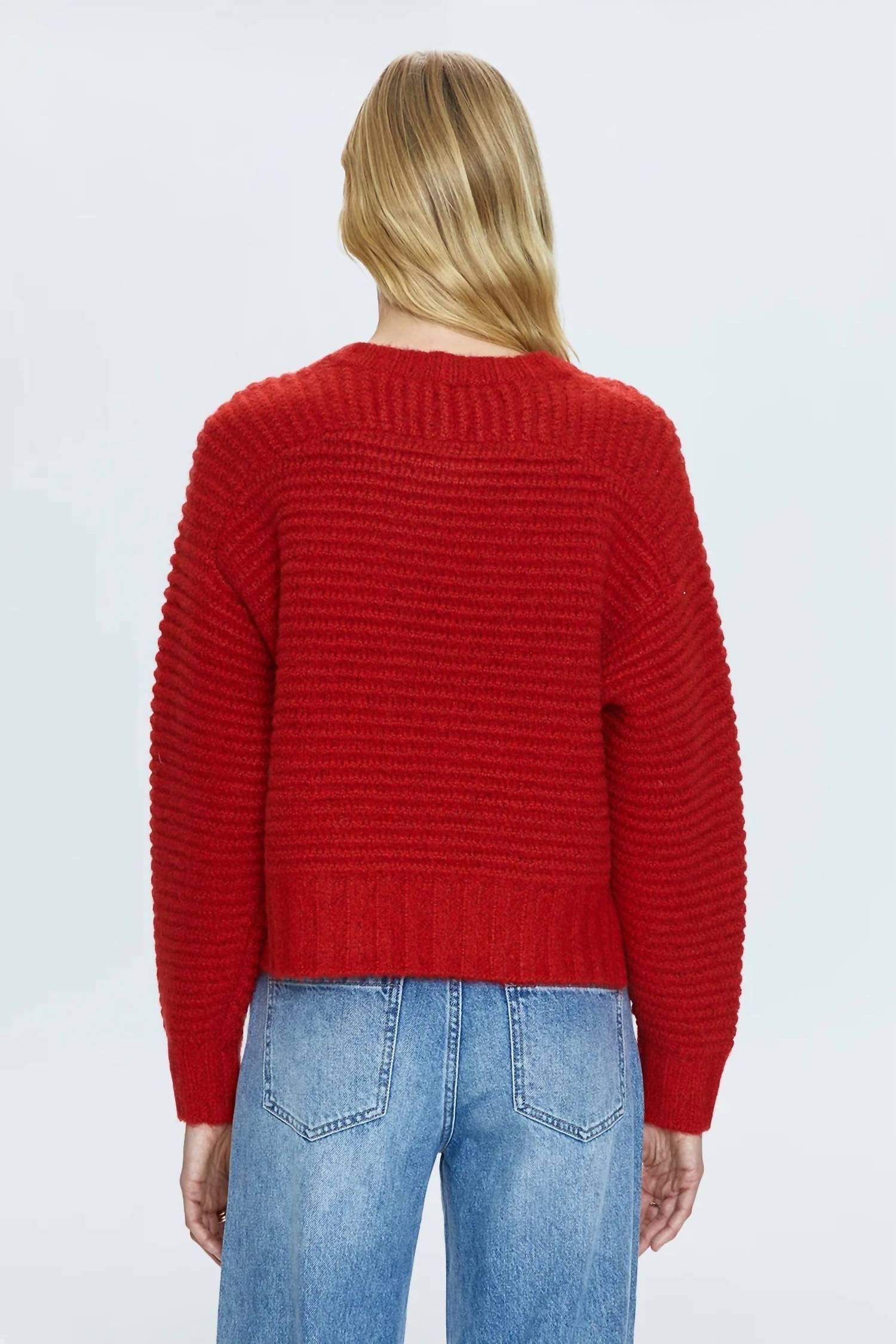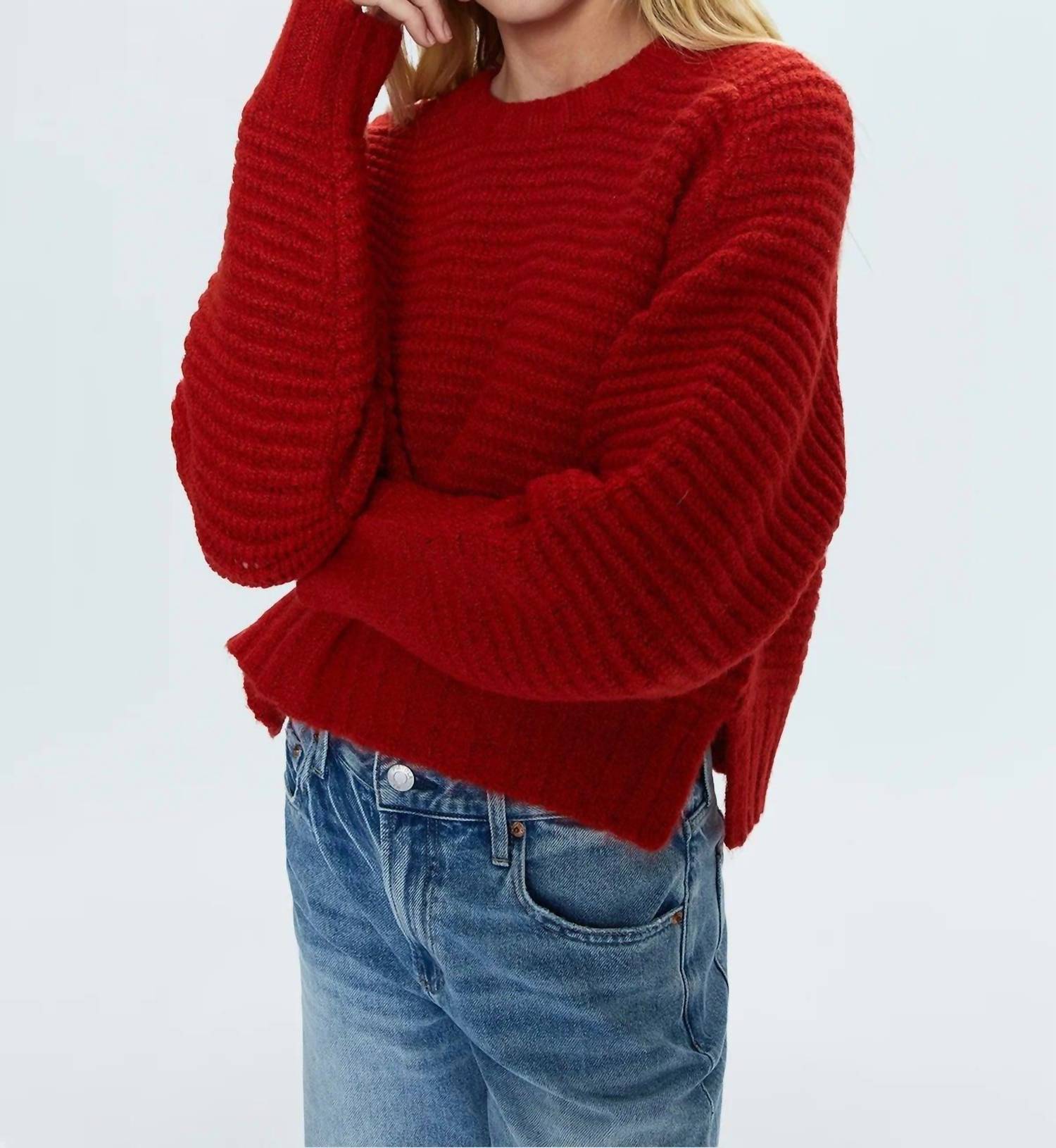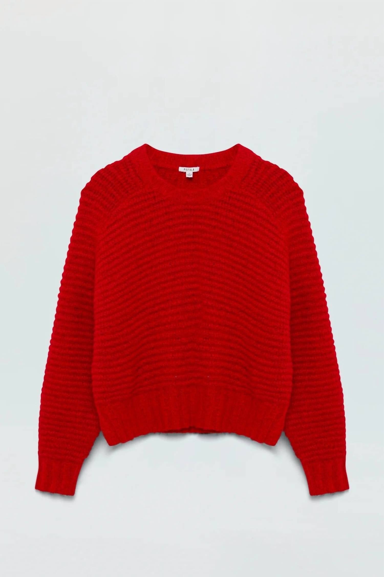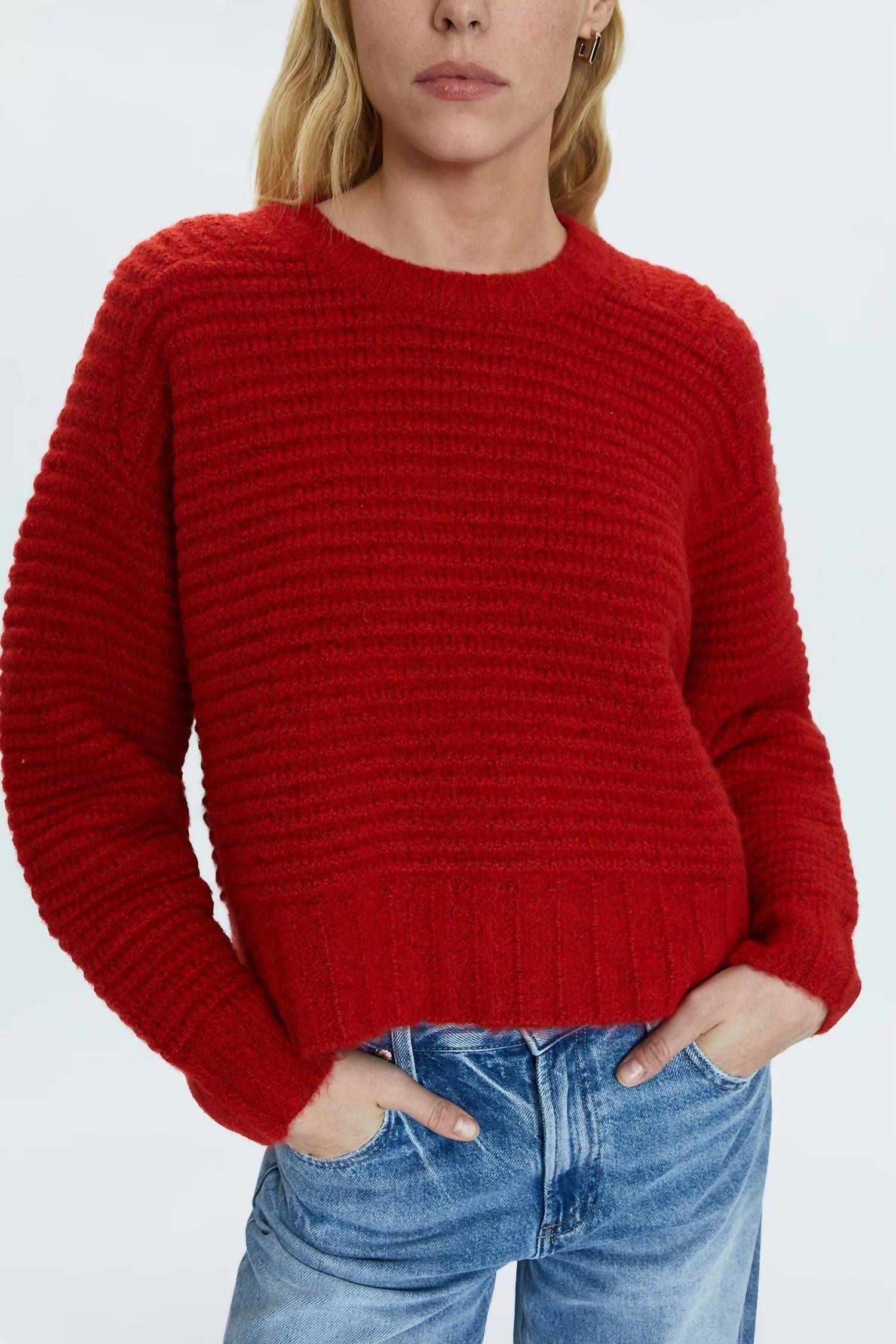 Experience the perfect blend of comfort and style with this trendy crew neck sweater, designed to effortlessly elevate your wardrobe. Pair it with your favorite denim and loafers for the perfect look. Elevate your wardrobe with the Adina Every Day Sweater Rouge by PISTOLA, featuring long raglan sleeves and crafted from a soft blend of materials, including 64% Acrylic, making it a go-to for comfort. This medium-weight sweater boasts a length of 20 inches and is designed with a monochromatic rib trim for added style. With a vibrant rouge hue, it's a striking piece that beautifully grazes the waistband. Crafted for easy wear, it features a pull-on closure and an elongated crop fit, perfect for versatile outfit pairings. Made from imported materials, this piece is a quintessential addition to your cool-weather collection. Model is 5’9” wearing size Small.